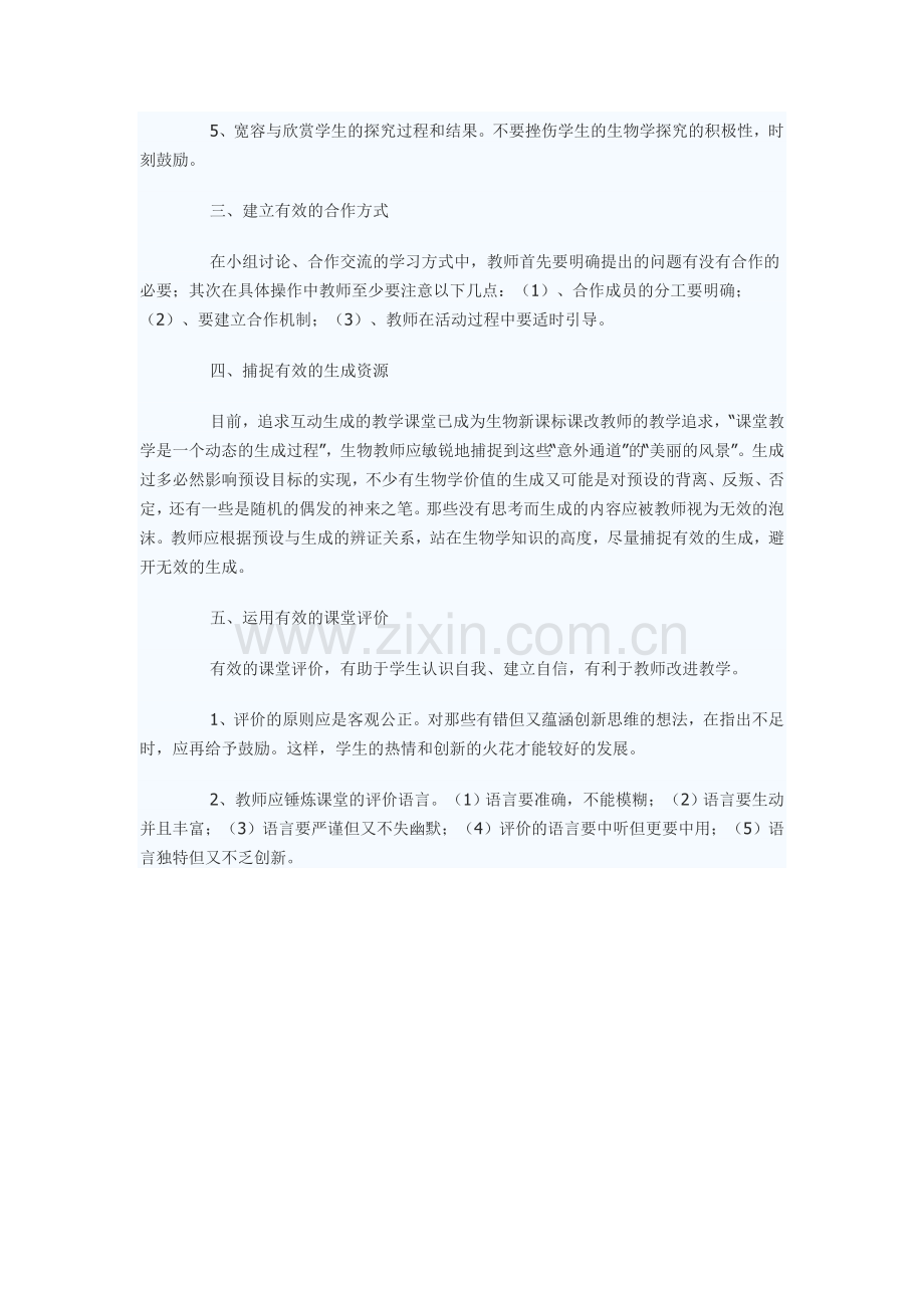 有效教学是指教师以尽可能少的时间、精力和物力投入,取得尽可能好的教学效果,从而实现指定的教学目标。下面从初中生物课角度,谈谈如何提高有效教学。