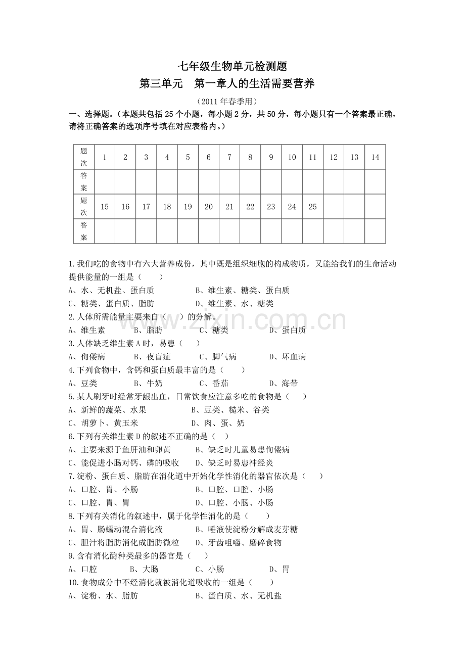 七年级生物单元检测题