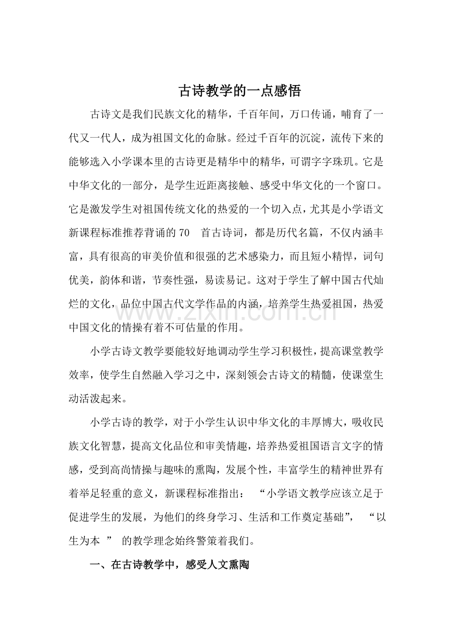 《语文课程标准》提出:“工具性与人文性的统一,是语文课程的基本特点”。人文精神的培养需要儿时潜移默化的影响,小学语文课程理应承担起促进发展,提高素质,弘扬人文精神的责任,让学生从语文学习中得到人文精神的熏陶和感染,受到人文思想的教育。而中华民族几千年的传统文化──古诗,是一笔宝贵的文化遗产,它本身在一定程度上体现了很强的人文性。 前苏联教育家赞可夫说:“教学一旦触及学生的情感和意志领域,触及学生的精神需要,便能发挥其高效的作用”。因此,古诗教学不但要进行语言文字基本功的训练,理解诗的主要内容,还要学生深入诗人的内心深处,让诗人的美好情操犹如春雨润物般溶化在自己的血液里。学习古诗能使儿童热爱祖国的文化,有助于他们了解我国的历史,可以培养孩子的自信心和审美情感。在孩子学习古诗的过程中对孩子进行人文教育,这符合于现代教育的指导思想,对培养学生健全的人格有一种“润物细无声”的妙处。
