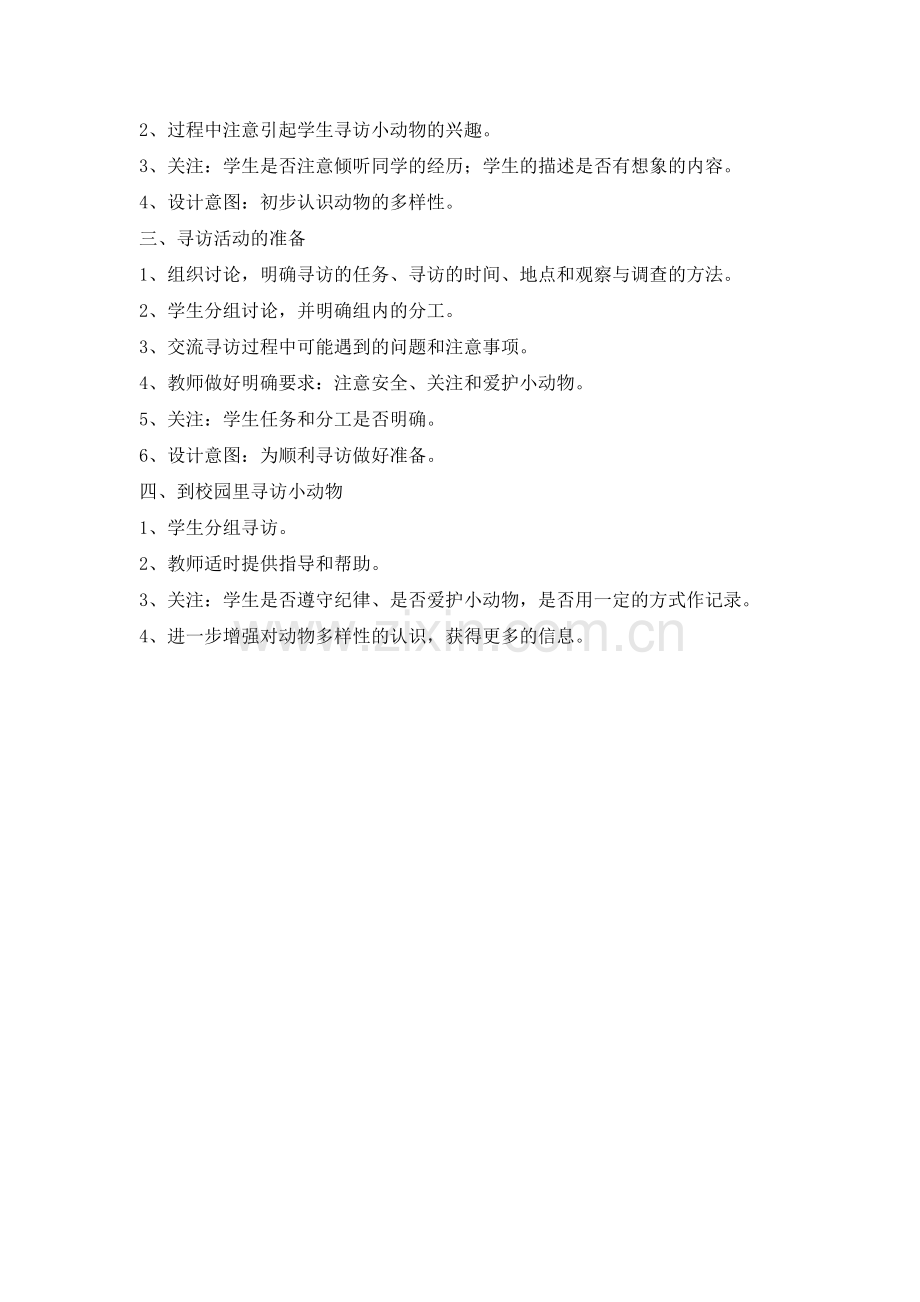 2、过程中注意引起学生寻访小动物的兴趣。