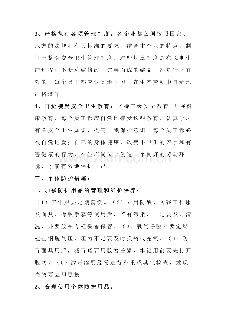 1、做好个人卫生和自我保健:应要求做到班后洗澡、更衣;饭前先洗手;不在作业场所饮食;改变不卫生的习惯和行为,如戒烟;平时劳逸结合,合理营养;加强锻炼,增强体质等。