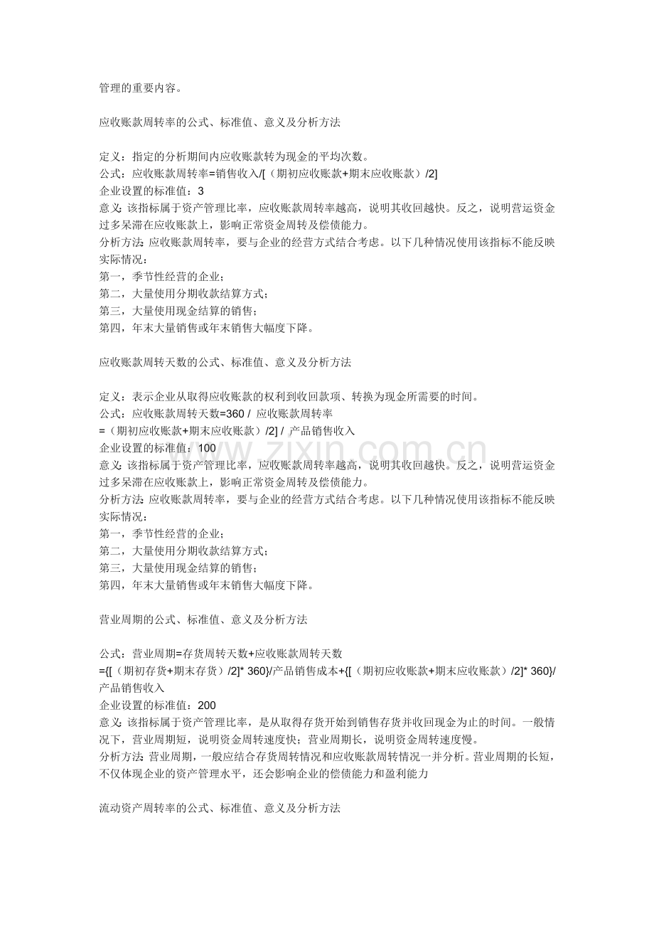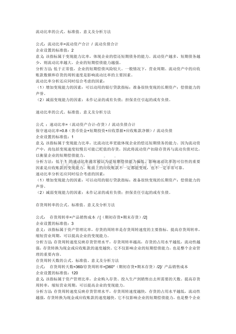 意义:该指标属于资产管理比率,反映流动资产的周转速度,周转速度越快,会相对节约流动资产,相当于扩大资产的投入,增强企业的盈利能力;而延缓周转速度,需补充流动资产参加周转,形成资产的浪费,降低企业的盈利能力。