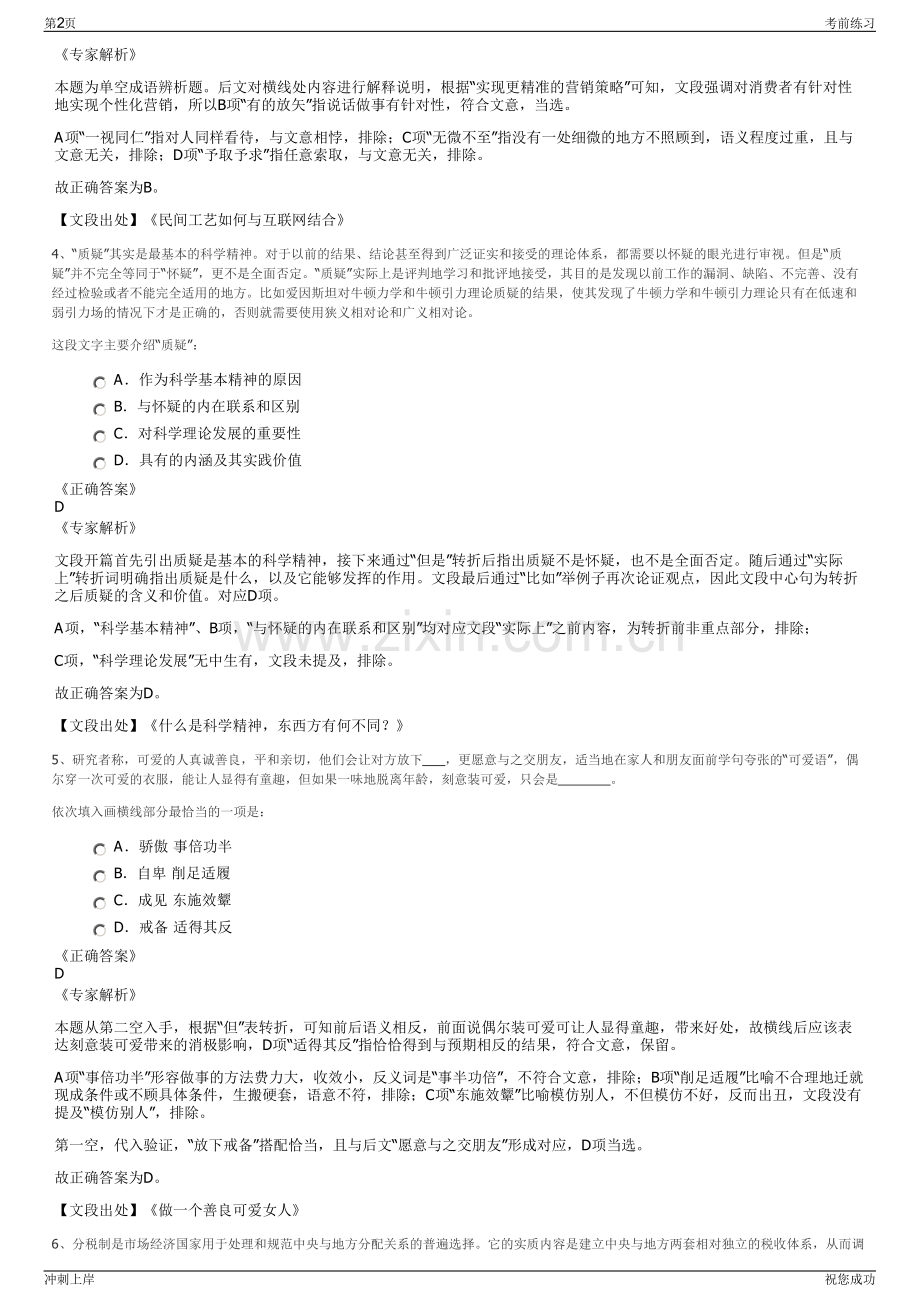 2024年江西井冈山大学建筑设计研究院有限公司招聘笔试冲刺题(带答案解析)【下载须知】:1,本套练习包含以下题型:言语理解与表达题、常识判断题、数量关系题、判断推理题和资料分析题等题型;共135道。2、本套试题根据常见招考题总结归纳,主要用于练习答题思路和拓展知识面。3、本套试题非考试真题,且与江西井冈山大学建筑设计研究院有限公司无关。一、第一部分言语理解与表达(本部分包括表达与理解两方面的内容。请根据题目要求,在四个选项中选出一个最恰当的答案。)1、2010年,中国频繁发生天灾人祸,全民健康安全与管理模式的变革与创新再一次迫在眉睫。于是,囊括新农村医保和社区卫生改革的“国民医改”重新提上日程。然而,大众看病依然很难,看病依然很贵,去医院治个小病依然很麻烦。于是,医疗健康市场开始“两极分化”:一极是面向普通大众、医保、公费医疗人员的全民健康医疗保障体系,在国家主导的医疗改革中缓慢进行;另一极就是由“少数已经富起来的人”带动起来的健康管理市场,由风险投资或私人资本主导,在迅猛推进。这段话主要支持了这样一种观点,即()。A“国民医改”之路困难重重 B 医疗健康市场开始向健康管理市场倾斜 C“国民医改”收效甚微催生医疗健康市场“两极分化”D 健康管理市场来势汹汹迅猛推进正确答案C专家解析文段首先阐述天灾人祸使“国民医改”重新提上日程,接着用“然而”作转折指出“国民医改”收效甚微“大众看病依然很难,看病依然很贵”,最后用“于是”说明,基于“国民医改”的上述实施情况,医疗健康市场出现了“两极分化”。因此C项正确。2、记者经过一个不知名的小镇,_了许多平凡的故事,了解到一家_破产的国有企业,经过小王三年_的经营,终于扭亏为盈,走出了困境。再一次缓解了大家的再就业难题。依次填入划横线部分最恰当的一项是()。A 耳熟能详面临处心积虑 B 耳濡目染面对殚诚毕虑 C 耳视目听临近设心积虑 D 耳闻目睹濒临殚精竭虑正确答案D专家解析B项错误,第一空,“耳濡目染”指耳朵经常听到,眼睛经常看到,不知不觉地受到影响。题中没有经常看见,只是偶然路过听到。D项正确,第二空,“濒临破产”是习惯搭配。AC两项错误,第三空,“处心积虑”“设心积虑”都形容蓄谋已久,费尽心思,含贬义,与语境不符。3、随着收入水平的提高,人们的消费心态也随之发生改变,个性化消费需求显著提高。互联网时代,商家可以利用消费数据的积累分析出商品的市场反响情况,对消费者_,实现更精准的营销策略。填入画横线部分最恰当的一项是:A一视同仁 B有的放矢 C无微不至 D予取予求正确答案B第1页考前练习冲刺上岸祝您成功专家解析本题为单空成语辨析题。后文对横线处内容进行解释说明,根据“实现更精准的营销策略”可知,文段强调对消费者有针对性地实现个性化营销,所以B项“有的放矢”指说话做事有针对性,符合文意,当选。A项“一视同仁”指对人同样看待,与文意相悖,排除;C项“无微不至”指没有一处细微的地方不照顾到,语义程度过重,且与文意无关,排除;D项“予取予求”指任意索取,与文意无关,排除。故正确答案为B。【文段出处】民间工艺如何与互联网结合4、“质疑”其实是最基本的科学精神。对于以前的结果、结论甚至得到广泛证实和接受的理论体系,都需要以怀疑的眼光进行审视。但是“质疑”并不完全等同于“怀疑”,更不是全面否定。“质疑”实际上是评判地学习和批评地接受,其目的是发现以前工作的漏洞、缺陷、不完善、没有经过检验或者不能完全适用的地方。比如爱因斯坦对牛顿力学和牛顿引力理论质疑的结果,使其发现了牛顿力学和牛顿引力理论只有在低速和弱引力场的情况下才是正确的,否则就需要使用狭义相对论和广义相对论。这段文字主要介绍“质疑”:A作为科学基本精神的原因 B与怀疑的内在联系和区别 C对科学理论发展的重要性 D具有的内涵及其实践价值正确答案D专家解析文段开篇首先引出质疑是基本的科学精神,接下来通过“但是”转折后指出质疑不是怀疑,也不是全面否定。随后通过“实际上”转折词明确指出质疑是什么,以及它能够发挥的作用。文段最后通过“比如”举例子再次论证观点,因此文段中心句为转折之后质疑的含义和价值。对应D项。A项,“科学基本精神”、B项,“与怀疑的内在联系和区别”均对应文段“实际上”之前内容,为转折前非重点部分,排除;C项,“科学理论发展”无中生有,文段未提及,排除。故正确答案为D。【文段出处】什么是科学精神,东西方有何不同?5、研究者称,可爱的人真诚善良,平和亲切,他们会让对方放下 ,更愿意与之交朋友,适当地在家人和朋友面前学句夸张的“可爱语”,偶尔穿一次可爱的衣服,能让人显得有童趣,但如果一味地脱离年龄,刻意装可爱,只会是 。依次填入画横线部分最恰当的一项是:A骄傲 事倍功半 B自卑 削足适履 C成见 东施效颦 D戒备 适得其反正确答案D专家解析本题从第二空入手,根据“但”表转折,可知前后语义相反,前面说偶尔装可爱可让人显得童趣,带来好处,故横线后应该表达刻意装可爱带来的消极影响,D项“适得其反”指恰恰得到与预期相反的结果,符合文意,保留。A项“事倍功半”形容做事的方法费力大,收效小,反义词是“事半功倍”,不符合文