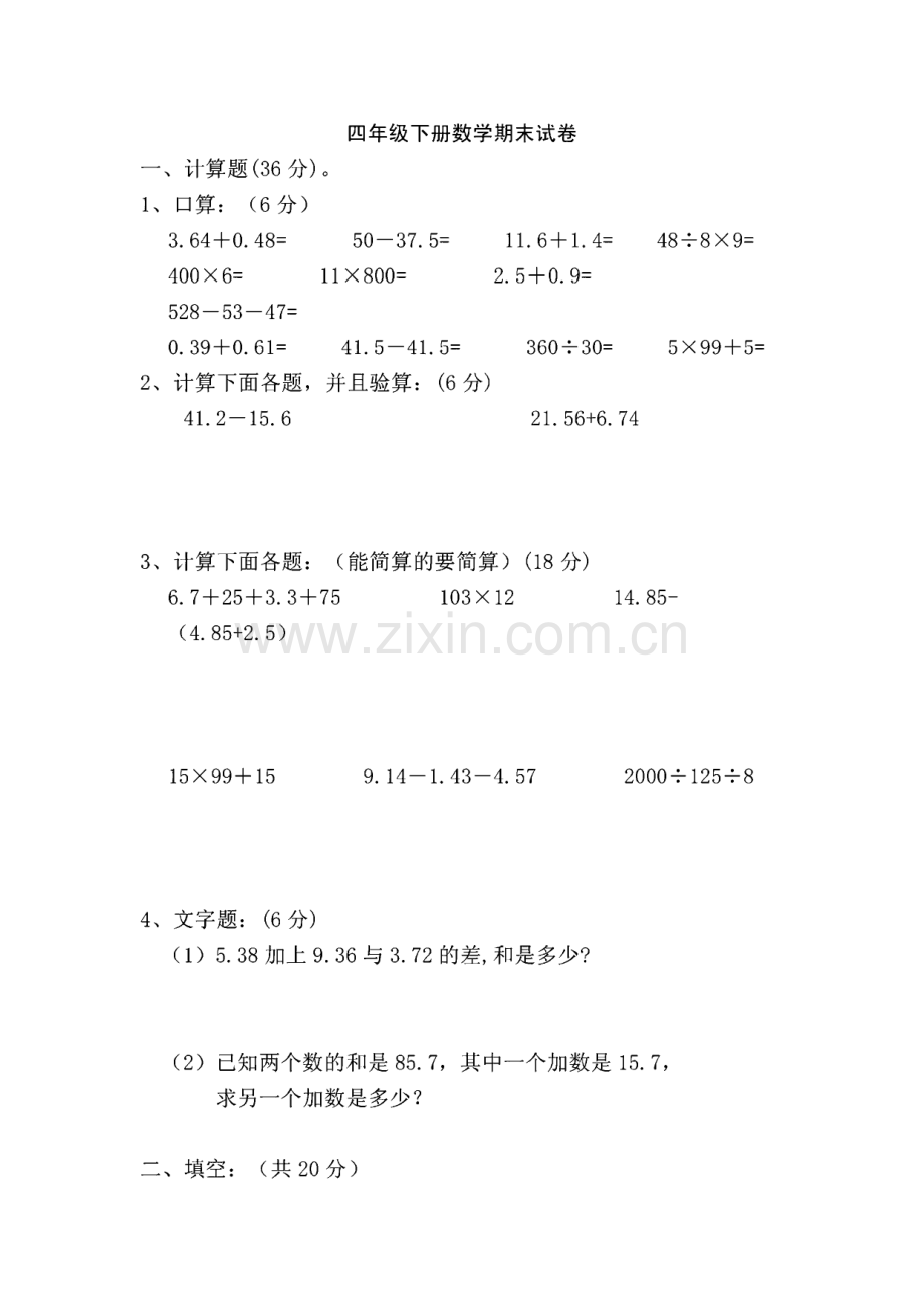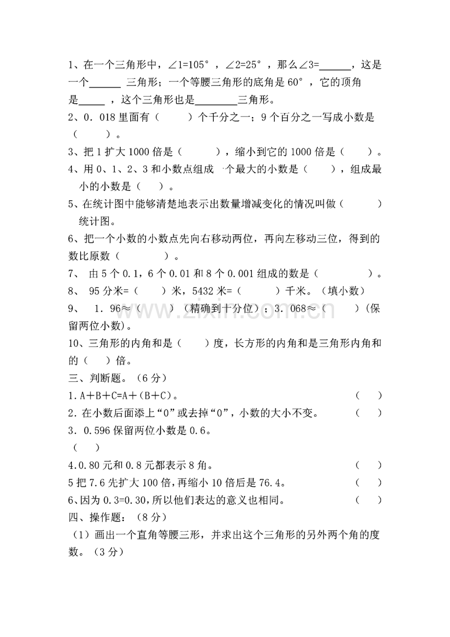 四年级下册数学期末试卷一、计算题(36分)。1、口算:(6分)3.64+0.48二50-37.5二11.6+1.4=48+8X9 二400X6=11 X800=2.5+0.9=528 53 47二2、0.39+0.61=41.5-41.5=360+30=5X99+5=计算下面各题,并且验算:(6分)41.2-15.621.56+6.743、计算下面各题:(能简算的要简算)(18分)6.7+25+3.3+75 103X12 14.85-(4.85+2.5)15X99+159.14-1.43-4.5720004-1254-84、文字题:(6分)(1)5.38加上9.36与3.72的差,和是多少?(2)已知两个数的和是85.7,其中一个加数是15.7,求另一个加数是多少?二、填空:(共20分)1、在一个三角形中,Zl=105,N2=25,那么N3=,这是 一个 三角形;一个等腰三角形的底角是60,它的顶角 是,这个三角形也是 三角形。2、0.018里面有()个千分之一;9个百分之一写成小数是()O3、把1扩大1000倍是(),缩小到它的1000倍是()。4、用0、1、2、3和小数点组成个最大的小数是(),组成最小的小数是()。5、在统计图中能够清楚地表示出数量增减变化的情况叫做()统计图。6、把一个小数的小数点先向右移动两位,再向左移动三位,得到的数比原数()。7、由5个0.1,6个0.01和8个0.001组成的数是()。8、95分米二()米,5432米二()千米。(填小数)9、1.96()(精确到十分位);3.068()(保留两位小数)。10、三角形的内角和是()度,长方形的内角和是三角形内角和 的()倍。三、判断题。(6分)1.A+B+C=A+(B+C)。()2.在小数后面添上“0”或去掉“0”,小数的大小不变。()3.0.596保留两位小数是0.6。()4.0.80元和0.8元都表示8角。()5把7.6先扩大100倍,再缩小10倍后是76.4。()6、因为0.3=0.30,所以他们表达的意义也相同。()四、操作题:(8分)(1)画出一个直角等腰三形,并求出这个三角形的另外两个角的度 数。(3分)(2)请划出路线示意图:从起点向正东方向行200米到路口,在向 东偏南25度走300米到公园,继续向东偏北40度走100米到达 神奇小学。(5分)起点tV五、应用题。(32分)1、珠海出租车起步价为3千米收费7元,3千米以上,每增加1千 米收费1元。请完成下表:(4分)路程(千米)3458收费(元)7830312、地球表面积是5.1亿平方千米,其中陆地面积是1.49亿平方千米,海洋面积比陆地面积多多少亿平方千米?(4分)3、一根电线,用去32.87米,比剩下的多&99米,这根电线长多少 米?(4分)4、甲有14.8元,乙有15.2元,两人要合买一个足球,一个足球的 价钱是他俩钱数总和的2倍,一个足球多少元,他们还差多少元?(5 分)5、学校植树,四年级植树84棵,是三年级植树的2倍,五年级植树 的棵数比三、四年级两个年级植树的总和还多18棵,五年级植树 多少棵?(5分)6、水泥厂原计划全年生产水泥78.15万吨,结果上半年生产54.32 万吨,下半年生产47.86万吨,今年生产超过计划多少万吨?(5 分)7、圆形的操场的一周全长是1800米。如果沿着这一圈每隔12米安 装一盏灯,一共需要装几盏灯?(5分)小学四年级数学下册期末试卷班级 姓名一、填空.17分1.由2个1、3个0.1、5个0.001组成的数是(),读作()。2.一个数百位、百分位和千分位上都是5,其它各位上都是0,这个数是(),精确到十分位是()o3.在9.99、9.090、9.009、和9.09中,最大的数是(),最小的数是(),相等的数是()和()o4.12千米50米=()千米 2元5分=()元8.04平方米=()平方米()平方分米5.一个小数的小数点向右移动两位后,比原来的数增加了 198,原来这个数是()。6.一个等边三角形分成两个直角三角形后,它们的锐角分别是()度和()度.7.把4.987精确到百分位是(),四舍五入到十分位是(),保留整数是().8.从直线外一点到直线所作的线段中,()最短.二、选择正确答案填在括号里.(5分)1.0.6 和 0.60 比较()A.大小相等,意义相同 B.大小相等、意义不同 C.大小不同,意义不同.2.正方形是特殊的()A.三角形 B.长方形 C.平行四边形 D.梯形3.十分位上的计数单位相当于十位上的计数单位的()A、十分之一 B、百分之一 C、千分之一4、5x0.9 和 0.9x5 的()A、乘积相同,意义也相同B、乘积相同,意义不同C、乘积不相同,意义也不相同5、在6.1和6.9之间的一位小数有()A、无数个 B、8个 C、7个 D、没有办法数三、判断(5分)1、等式的两边同加上一个数或同减去一个数,等式仍然成立。()2、等式的两边同乘一个数或同除以一个数,等式仍然成立。()3、在一个三角形中,如果有两条边相等,那么这两条边所对的角也相等。()4、2X=X2,3X-X3()5、4.3和4.30大小相等,计数单位也一样。()四、下面各题怎样算简便就怎样算。12分18.3-6.25-3.75+12.7 6.4x1012.5x6.78x0.4五、计算下面各题。16分0.6+0.94-0.208 24.63-(4.63-1.85)(64-22.4-1.4)x1.2 3.8x(3.84-40.5-2.7)73x1.8+8.2x73六、解下列方程:9分5.2X2.8X=8.64 3.7x3+2Y=28.7 4.2X+5=2.52七、图形与操作6分1、求下面各角的度数。3分已知 Zl=30 Z2=90 求N3=()Z4=(2、分别画出下列各图形的高.3分/O八、应用题。30分1.甲有14.8元,乙有15.2元,俩人要合买一个足球,2倍,一个足球多少元,他们还差多少元?)N5=()一个足球的价钱是他俩人钱数总和的2.一辆货车3.5小时行了 227.5千米,一列火车的速度是货车的2倍,求火车的速度。3.小明的爸爸要出国考察,想把5000元人民币换成美元。今日美元对人民币的汇率是100 美元=780元人民币,这些人民币能换多少美元?(得数保留两位小数)4.光明小学为山区同学捐书,五年级捐248本,五年级捐的是四年级的2倍多8本,四年 级捐多少本?5.一套衣服标价390元,上衣是裤子的2倍,求上衣和裤子各多少元?(用方程解)6.两根绳共长48.4米,从第一根上剪去6.4米,从第二根上剪去7.4米,这时两根绳子一 样长,求这两根绳原来各长多少米?小学数学第八册期末考试题时间:90分钟满分:100分分数:卷首语:亲爱的同学,转眼