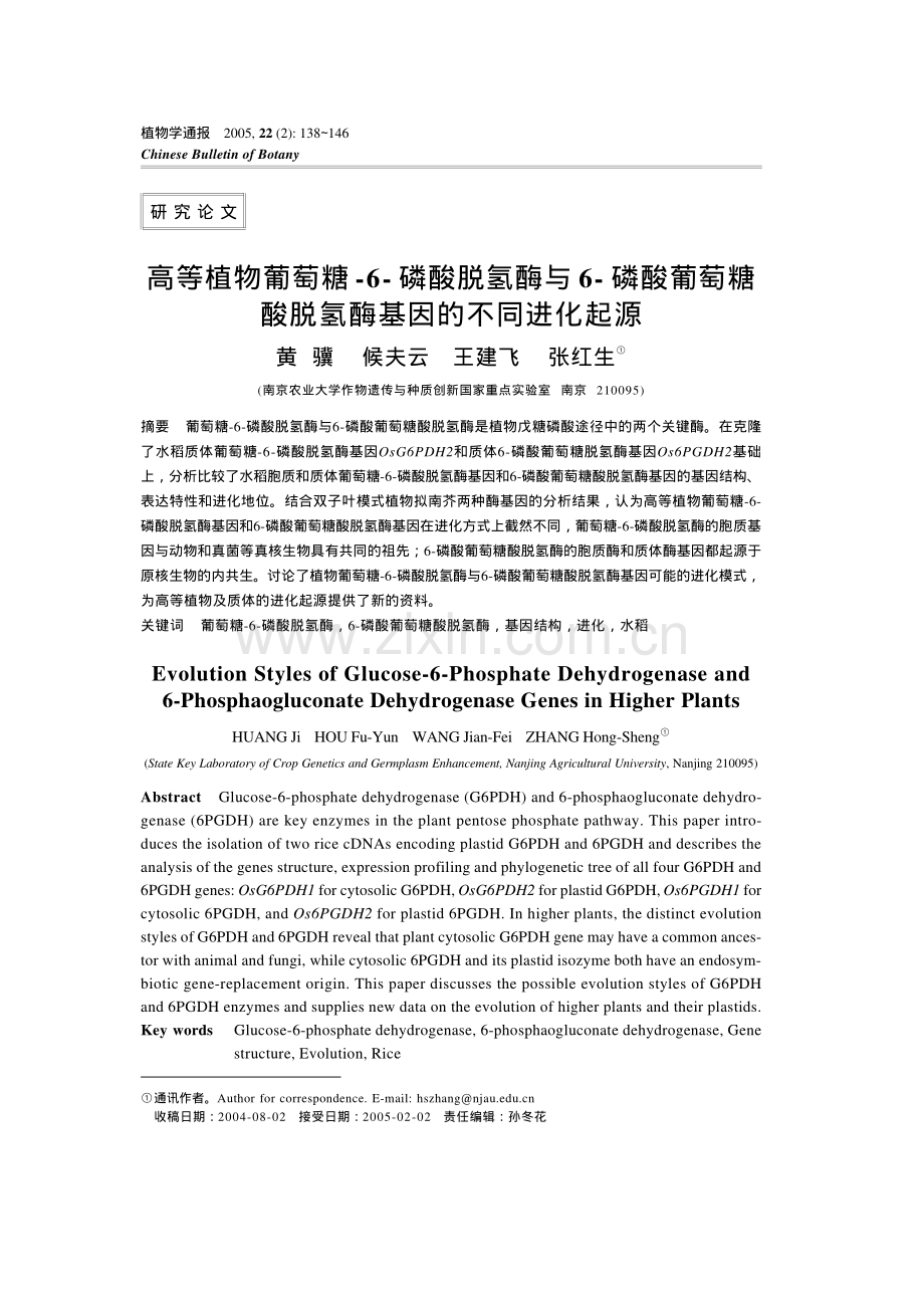 植物学通报 2005,22(2):138 146Chinese Bulletin of Botany通讯作者。Author for correspondence.E-mail:收稿日期:2004-08-02 接受日期:2005-02-02 责任编辑:孙冬花研 究 论 文高等植物葡萄糖-6-磷酸脱氢酶与 6-磷酸葡萄糖酸脱氢酶基因的不同进化起源黄 骥 候夫云 王建飞 张红生(南京农业大学作物遗传与种质创新国家重点实验室 南京 210095)摘要 葡萄糖-6-磷酸脱氢酶与6-磷酸葡萄糖酸脱氢酶是植物戊糖磷酸途径中的两个关键酶。在克隆了水稻质体葡萄糖-6-磷酸脱氢酶基因OsG6PDH2和质体6-磷酸葡萄糖脱氢酶基因Os6PGDH2基础上,分析比较了水稻胞质和质体葡萄糖-6-磷酸脱氢酶基因和6-磷酸葡萄糖酸脱氢酶基因的基因结构、表达特性和进化地位。结合双子叶模式植物拟南芥两种酶基因的分析结果,认为高等植物葡萄糖-6-磷酸脱氢酶基因和6-磷酸葡萄糖酸脱氢酶基因在进化方式上截然不同,葡萄糖-6-磷酸脱氢酶的胞质基因与动物和真菌等真核生物具有共同的祖先;6-磷酸葡萄糖酸脱氢酶的胞质酶和质体酶基因都起源于原核生物的内共生。讨论了植物葡萄糖-6-磷酸脱氢酶与6-磷酸葡萄糖酸脱氢酶基因可能的进化模式,为高等植物及质体的进化起源提供了新的资料。关键词 葡萄糖-6-磷酸脱氢酶,6-磷酸葡萄糖酸脱氢酶,基因结构,进化,水稻Evolution Styles of Glucose-6-Phosphate Dehydrogenase and6-Phosphaogluconate Dehydrogenase Genes in Higher PlantsHUANG Ji HOU Fu-Yun WANG Jian-Fei ZHANG Hong-Sheng(State Key Laboratory of Crop Genetics and Germplasm Enhancement,Nanjing Agricultural University,Nanjing 210095)Abstract Glucose-6-phosphate dehydrogenase(G6PDH)and 6-phosphaogluconate dehydro-genase(6PGDH)are key enzymes in the plant pentose phosphate pathway.This paper intro-duces the isolation of two rice cDNAs encoding plastid G6PDH and 6PGDH and describes theanalysis of the genes structure,expression profiling and phylogenetic tree of all four G6PDH and6PGDH genes:OsG6PDH1 for cytosolic G6PDH,OsG6PDH2 for plastid G6PDH,Os6PGDH1 forcytosolic 6PGDH,and Os6PGDH2 for plastid 6PGDH.In higher plants,the distinct evolutionstyles of G6PDH and 6PGDH reveal that plant cytosolic G6PDH gene may have a common ances-tor with animal and fungi,while cytosolic 6PGDH and its plastid isozyme both have an endosym-biotic gene-replacement origin.This paper discusses the possible evolution styles of G6PDHand 6PGDH enzymes and supplies new data on the evolution of higher plants and their plastids.Key wordsGlucose-6-phosphate dehydrogenase,6-phosphaogluconate dehydrogenase,Genestructure,Evolution,Rice1392005黄 骥等:高等植物葡萄糖-6-磷酸脱氢酶与6-磷酸葡萄糖酸脱氢酶基因的不同进化起源戊糖磷酸途径(pentose phosphatepathway,PPP)是植物体中糖代谢的重要途径,其主要功能是产生供生物合成所需的还原力 NADPH 以及核酸合成的戊糖(Wood,1986)。对菠菜的戊糖磷酸途径研究结果表明完整的PPP发生在植物的质体中,但在胞质中也发现了PPP的两个关键酶,葡萄糖-6-磷酸脱氢酶(glucose-6-phosphate dehydroge-nase,G6PDH,EC1.1.1.49)和6-磷酸葡萄糖酸脱氢酶(6-phosphaogluconate dehydrogenase,6PGDH,EC1.1.1.44)的活性(Schnarrenberger etal.,1995)。因此认为戊糖磷酸途径的发生途径主要在质体中,胞质中戊糖磷酸途径的一些中间产物通过转运体进入质体中完成完整的PPP(黄骥等,2004)。葡萄糖-6-磷酸脱氢酶催化戊糖磷酸途径的第 1 步反应,即 6-磷酸葡萄糖的脱氢,是 PPP 途径的限速步骤。目前在马铃薯(Graeve et al.,1994)和小麦(Nemoto and Sasakuma,2000)中分离了胞质 G6PDH 基因,在马铃薯(Schaewen et al.,1995)、菠菜(Schnarrenberger et al.,1995)和烟草(Knight et al.,2001)中分离了质体G6PDH 基因。6PGDH 是 PPP 途径的另一限速酶,催化6-磷酸葡萄糖酸脱氢后生成5-磷酸核酮糖。Tanksley 和 Kuehn(1985)通过凝胶电泳发现了番茄中存在4种6PGDH,其中3 种存在于胞质,1 种位于质体。目前在苜蓿(Fahrendorf et al.,1995)和玉米(Redinbaugh and Campbell,1998)中分离了胞质6PGDH基因,而仅在菠菜(Krepinsky etal.,2001)中分离了其质体基因。戊糖磷酸途径是植物中重要的代谢途径,主要在细胞的质体中发生,因此戊糖磷酸途径是被用来进行高等植物及质体进化分析研究的很好素材。而G6PDH和6PGDH分别是戊糖磷酸途径的两个关键酶,因此通过这两个酶的研究有望获得高等植物进化的新资料。对于高等植物质体的起源,一般认为是原核生物(蓝细菌)通过内共生成为植物的细胞器,在进化过程中有些基因进入了植物基因组,转移进入植物基因组的基因产物在转运肽的引导下重新返回细胞器行使功能(Weeden,1981)。但是并不是所有这样的基因经细胞核编码后全部都返回质体行使功能,在进化过程中,有些也进入了细胞的其他区间(Weeden,1981)。Krepinsky等(2001)通过系统发生树的研究认为6PGDH起源于蓝细菌的内共生,但对于G6PDH和6PGDH的比较研究还很少,对于二者进化起源的详细机制也没有进行较为明确的阐述,同时除了系统发生树之外还缺乏实验上的证据。随着基因组计划的发展,越来越多的真核生物和原核生物进行了全基因组的序列测定。对于生物的进化研究无疑起了巨大的推动作用,使我们有可能在一个生物体内进行深入的研究。借助于水稻基因组和 EST 资料,我们已经克隆了水稻G6PDH和6PGDH的胞质基因 OsG6PDH1(黄骥等,2002a)和Os6PGDH1(Huang et al.,2003),在此基础上,又首次从水稻中克隆了两个酶的质体基因OsG6PDH2和Os6PGDH2。通过对这4个基因的结构、表达特性以及进化地位差异的比较研究,认为高等植物葡萄糖-6-磷酸脱氢酶基因和 6-磷酸葡萄糖酸脱