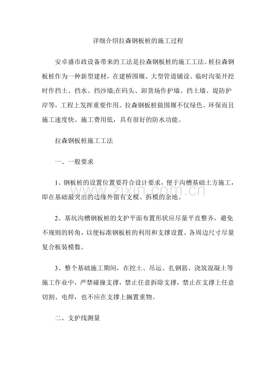 拉森钢板桩施工关系到施工止水和安全,是本工程施工最关键的工序之一,在施工中要注意以下施工要求:
