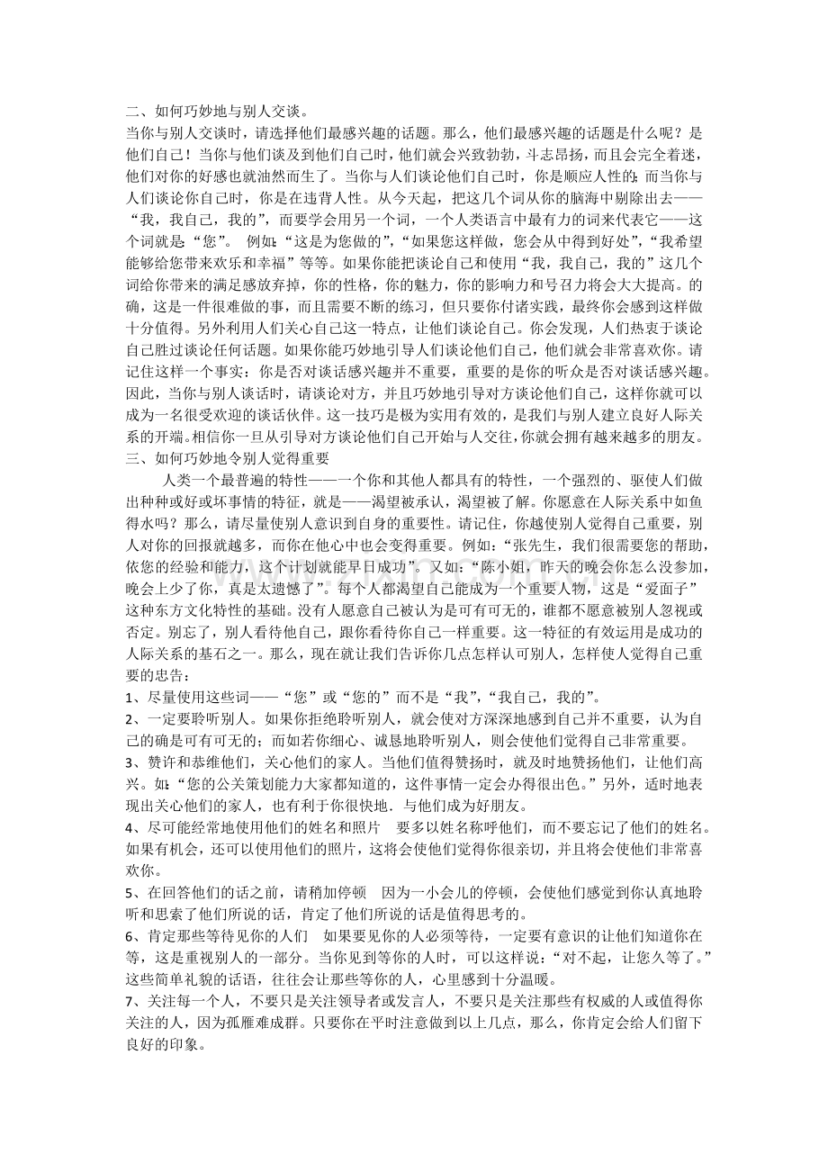 当你与别人交谈时,请选择他们最感兴趣的话题。那么,他们最感兴趣的话题是什么呢?是他们自己!当你与他们谈及到他们自己时,他们就会兴致勃勃,斗志昂扬,而且会完全着迷,他们对你的好感也就油然而生了。当你与人们谈论他们自己时,你是顺应人性的;而当你与人们谈论你自己时,你是在违背人性。从今天起,把这几个词从你的脑海中剔除出去——“我,我自己,我的”,而要学会用另一个词,一个人类语言中最有力的词来代表它——这个词就是:“您”。 例如:“这是为您做的”,“如果您这样做,您会从中得到好处”,“我希望能够给您带来欢乐和幸福”等等。如果你能把谈论自己和使用“我,我自己,我的”这几个词给你带来的满足感放弃掉,你的性格,你的魅力,你的影响力和号召力将会大大提高。的确,这是一件很难做的事,而且需要不断的练习,但只要你付诸实践,最终你会感到这样做十分值得。另外利用人们关心自己这一特点,让他们谈论自己。你会发现,人们热衷于谈论自己胜过谈论任何话题。如果你能巧妙地引导人们谈论他们自己,他们就会非常喜欢你。请记住这样一个事实:你是否对谈话感兴趣并不重要,重要的是你的听众是否对谈话感兴趣。因此,当你与别人谈话时,请谈论对方,并且巧妙地引导对方谈论他们自己,这样你就可以成为一名很受欢迎的谈话伙伴。这一技巧是极为实用有效的,是我们与别人建立良好人际关系的开端。相信你一旦从引导对方谈论他们自己开始与人交往,你就会拥有越来越多的朋友。