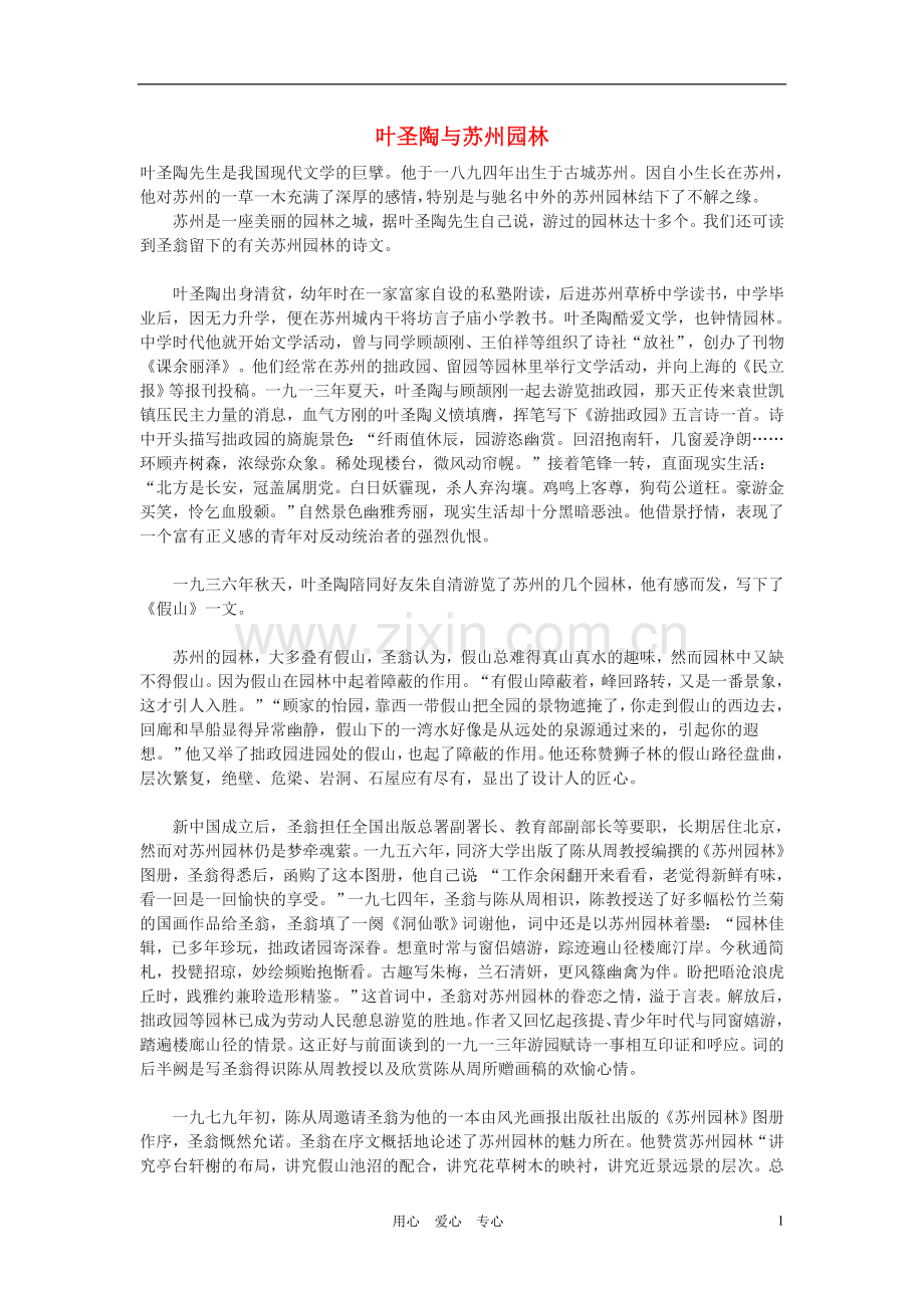 叶圣陶先生是我国现代文学的巨擘。他于一八九四年出生于古城苏州。因自小生长在苏州,他对苏州的一草一木充满了深厚的感情,特别是与驰名中外的苏州园林结下了不解之缘。
