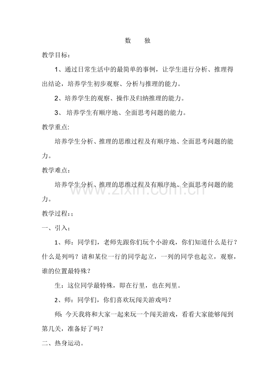 师:我们刚在方格里进行的数字推理游戏叫做“数独”。也是我们今天学习的知识。(板书,揭题。)