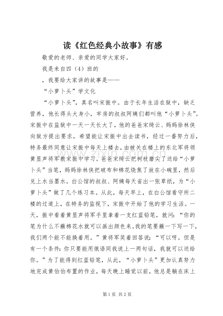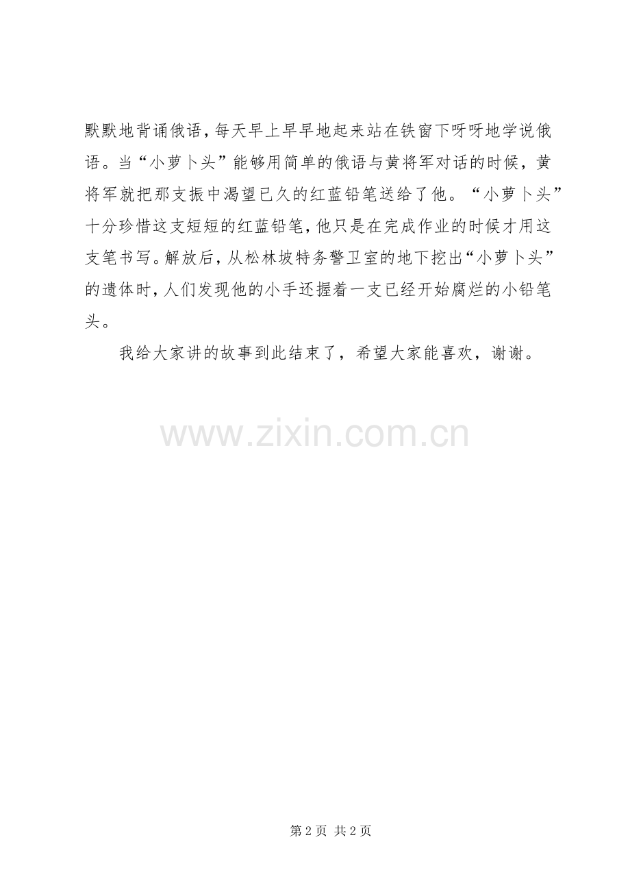 “小萝卜头”,真名叫宋振中。由于长年生活在狱中,缺乏营养,他长得头大身小,牢房的叔叔阿姨们都叫他“小萝卜头”。宋振中在监狱中一天一天长大了,他的爸爸宋绮云、妈妈徐林侠向狱方提出要求,希望能让宋振中出去读书,经过一番努力后,特务最终同意让宋振中每天上楼去,由被关在楼上的东北军将领黄显声将军教宋振中学习。爸爸宋绮云把树枝磨尖了送给“小萝卜头”当笔,妈妈徐林侠把破布和棉花烧焦了放在小碗里,然后兑上水当墨水。白公馆的叔叔、阿姨每天省出一张草纸,为“小萝卜头”做了几个练习本。从此,每天早上,在白公馆看守所二楼的过道上,在特务的监视下,宋振中开始了他的学习生活。一天,振中看着黄显声将军手里拿着一支红蓝铅笔,就问:“你的笔为什么不蘸棉花水就可以画出颜色来。我的笔要蘸一下写一下,我们两个能不能换着用。”黄将军笑着回答说:“可以呀。但是有一个条件:你只要能用俄语同我说上一两句话,我就可以送给你。”为了能得到红蓝铅笔,从此,“小萝卜头”更加认真努力地完成黄伯伯布置的作业,每天晚上睡觉以前,他总是躺在床上默默地背诵俄语,每天早上早早地起来站在铁窗下呀呀地学说俄语。当“小萝卜头”能够用简单的俄语与黄将军对话的时候,黄将军就把那支振中渴望已久的红蓝铅笔送给了他。“小萝卜头”十分珍惜这支短短的红蓝铅笔,他只是在完成作业的时候才用这支笔书写。解放后,从松林坡特务警卫室的地下挖出“小萝卜头”的遗体时,人们发现他的小手还握着一支已经开始腐烂的小铅笔头。
