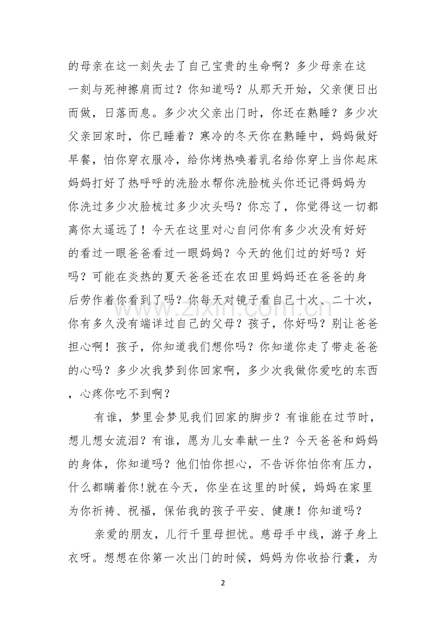 亲爱的朋友,弹指间你走过了人生的20年!往事,你还记得多少?现在,请您在你的脑海里浮现出一条路,这条路是你童年时无数次走过的路,这条路是你童年时回家的路,当你踏上这条路的时候,你是否还记得在路的尽头有一座老屋!还记得您出生的老屋,您是否还记得老屋里和你一起生活过的人?他们今天过的好吗?你想过吗?你冲进了这间屋子,你直接走到了你童年熟睡的这张床前,当你望着这张床的时候,你想到了什么?你可知就是在这张床上妈妈十月怀胎、含辛茹苦?自从孕育你生命的那一刻开始,妈妈就经受着所有的痛苦与折磨,多少次妈妈睡觉不敢翻身,怕伤着你?多少次妈妈不想吃的去吃?就这样直到有一天你拥有了人生的第一声哭喊,可你是否知道这一刻是妈妈在生死边缘挣扎的一刻,这是妈妈用生命给你生命的时刻多少伟大的母亲在这一刻失去了自己宝贵的生命啊?多少母亲在这一刻与死神擦肩而过?你知道吗?从那天开始,父亲便日出而做,日落而息。多少次父亲出门时,你还在熟睡?多少次父亲回家时,你已睡着?寒冷的冬天你在熟睡中,妈妈做好早餐,怕你穿衣服冷,给你烤热唤着乳名给你穿上当你起床妈妈打好了热呼呼的洗脸水帮你洗脸梳头你还记得妈妈为你洗过多少次脸梳过多少次头吗?你忘了,你觉得这一切都离你太遥远了!今天在这里对心自问你有多少次没有好好的看过一眼爸爸看过一眼妈妈?今天的他们过的好吗?好吗?可能在炎热的夏天爸爸还在农田里妈妈还在爸爸的身后劳作着你看到了吗?你每天对镜子看自己十次、二十次,你有多久没有端详过自己的父母?孩子,你好吗?别让爸爸担心啊!孩子,你知道我们想你吗?你知道你走了带走爸爸的心吗?多少次我梦到你回家啊,多少次我做你爱吃的东西,心疼你吃不到啊?