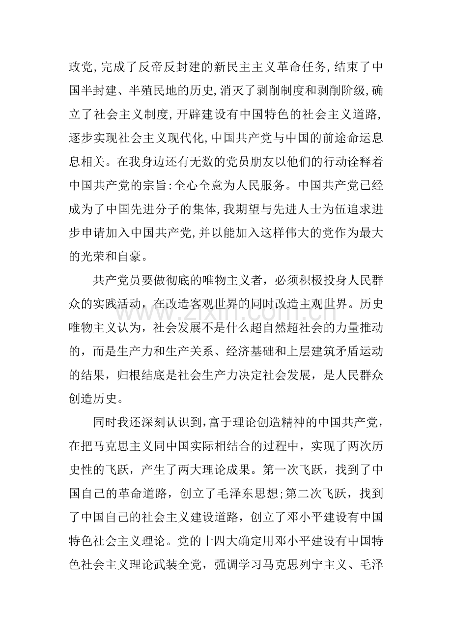 在对共产主义理想的憧憬中我加入了少先队、共青团,一次次“为共产主义事业而奋斗”的宣誓坚定了我的共产主义理想,共产主义以她极大的魅力吸引着我。从1921年建党开始中国共产党就接纳了无数志士仁人。从建党之初仅有的50多名党员,几个小组逐步发展到今天拥有数千万党员的执,政党,完成了反帝反封建的新民主主义革命任务,结束了中国半封建、半殖民地的历史,消灭了剥削制度和剥削阶级,确立了社会主义制度,开辟建设有中国特色的社会主义道路,逐步实现社会主义现代化,中国共产党与中国的前途命运息息相关。在我身边还有无数的党员朋友以他们的行动诠释着中国共产党的宗旨:全心全意为人民服务。中国共产党已经成为了中国先进分子的集体,我期望与先进人士为伍追求进步申请加入中国共产党,并以能加入这样伟大的党作为最大的光荣和自豪。
