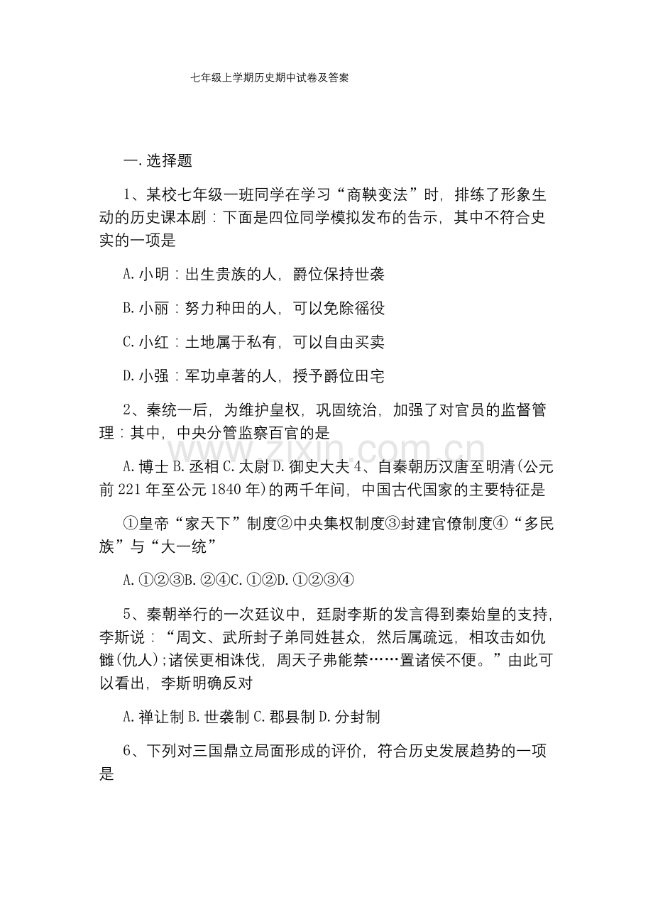 1、某校七年级一班同学在学习“商鞅变法”时,排练了形象生