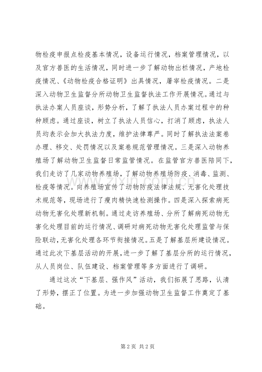 通过这次“下基层、强作风”活动,我们拓展了思路,认清了形势,摆正了位置。为进一步加强动物卫生监督工作奠定了基础。