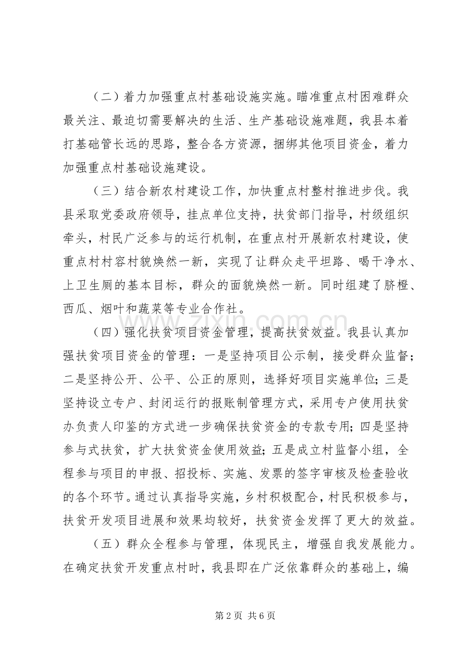 (四)强化扶贫项目资金管理,提高扶贫效益。我县认真加强扶贫项目资金的管理:一是坚持项目公示制,接受群众监督;二是坚持公开、公平、公正的原则,选择好项目实施单位;三是坚持设立专户、封闭运行的报账制管理方式,采用专户使用扶贫办负责人印鉴的方式进一步确保扶贫资金的专款专用;四是坚持参与式扶贫,扩大扶贫资金使用效益;五是成立村监督小组,全程参与项目的申报、招投标、实施、发票的签字审核及检查验收的各个环节。通过认真指导实施,乡村积极配合,村民积极参与,扶贫开发项目进展和效果均较好,扶贫资金发挥了更大的效益。