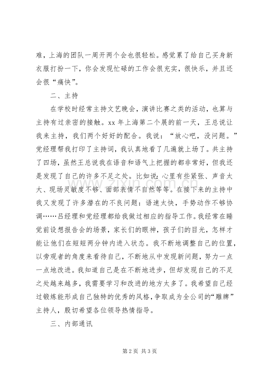 在学校时经常主持文艺晚会,演讲比赛之类的活动,也算与主持有过亲密的接触。xx年上海第二个展的前一天,王总说让我来主持,我们两个好好的配合。我说:“放心吧,没问题。”党经理帮我打印了主持词,我认真地看了几遍就上场了。共主持了四场,虽然王总说我在语音和语气上把握的都非常好,但我还是发现了自己的许多不足之处。比如说:心里有些紧张、声音太大、现场灵敏度不够、面部表情不自然等等。在接下来的主持中我又发现了许多潜在的不良问题:语速太快,手势动作不够协调……吕经理和党经理都给我做过相应的指导工作。我经常在睡觉前设想报告会的场景,家长们的眼神,孩子们的目光,怎样才能让他们在短短两分钟内进入状态。我不断地调整自己的位置,以旁观者的角度来看待自己,不断地从中发现新问题,努力一点一点地改进。我知道自己是在不断地进步,但却发现自己的不足之处越来越多,我需要学习和改进的地方太多了。我希望自己经过锻炼能形成自己独特的优秀的风格,争取成为全公司的“雕牌”主持人,殷切希望各位领导热情指导。