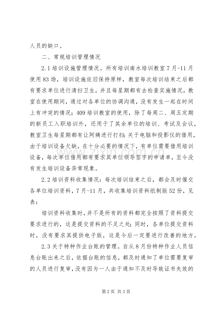 2.2培训资料收集情况:每次培训结束之后,都会及时催交各单位培训资料,7月-11月,共收集培训资料纸制版52份,见表: