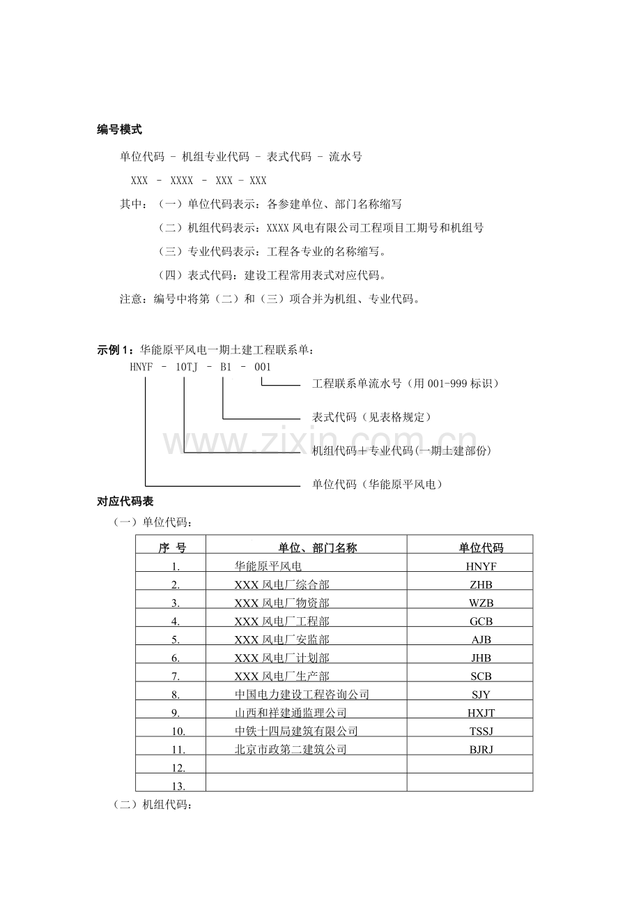 (二)机组代码表示:XXXX风电有限公司工程项目工期号和机组号
