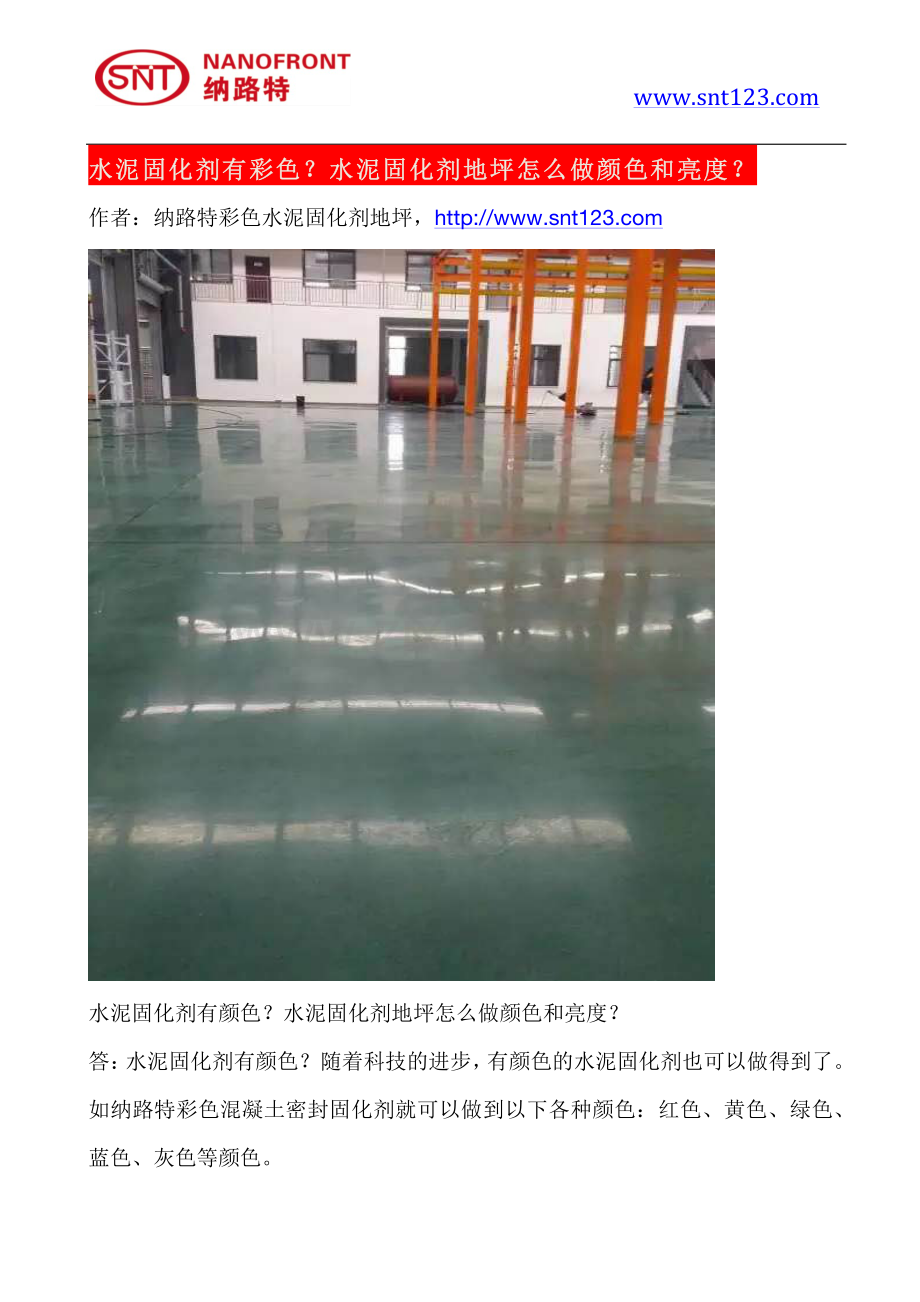 水泥固化剂有水泥固化剂有彩彩色?色?水泥固化剂地坪水泥固化剂地坪怎么做颜色和亮度?怎么做颜色和亮度?作者:纳路特彩色水泥固化剂地坪,水泥固化剂有颜色?水泥固化剂地坪怎么做颜色和亮度?答:水泥固化剂有颜色?随着科技的进步,有颜色的水泥固化剂也可以做得到了。如纳路特彩色混凝土密封固化剂就可以做到以下各种颜色:红色、黄色、绿色、蓝色、灰色等颜色。水泥固化剂地坪怎么做颜色和亮度?要想在水泥固化剂地坪上做颜色,你得使用彩色水泥固化剂,如纳路特彩色水泥固化剂。要想水泥固化剂地坪做颜色和亮度,成功的关键在于水泥固剂地坪的选择。水泥固化剂地坪选择对了,在水泥固化剂地坪上做颜色和亮度就很容易。现在中国市场上的水泥固化剂地坪有:纳路特水泥固化剂地坪,安斯福妙乐水泥固化剂地坪,美力实水泥固化剂地坪,力西克水泥固化剂地坪,力石伯乐水泥固化剂地坪和舒尔拉克水泥固化剂地坪。如选择纳路特水泥固化剂地坪,在水泥固化剂地坪上做颜色和亮度就很容易。同样,如选择舒尔拉克水泥固化剂地坪,在水泥固化剂地坪上做颜色和亮度也会很容易。其他牌子的水泥固化剂地坪就不敢保证了。你自己试吧!为您推荐与水泥固化剂地坪颜色相关问题如下:硬化剂耐磨地坪上可以做环氧自流平吗?水泥地坪硬化剂是什么概念?3 水泥地坪固化剂哪家比较好?地坪硬化剂、固化剂技术?19 混凝土密封固化剂地坪怎么样?水泥密封固化剂价格?2 如何评定水泥固化剂地坪的质量 水泥密封固化剂厂家?混凝土密封固化剂地坪施工工艺?6 水泥密封固化剂地面施工方法?更多相关问题请咨询纳路特科技。混凝土密封固化剂就是液态混凝土渗透剂 混凝渗透硬化封闭剂,通常称之为混凝土固化剂或混凝土密封固化剂,现在中国市场上有四代产品:混凝土的强度主要来源于混凝土中的水泥成分中的硅、钙在水的作用下生成的硅酸钙化合物(C-S-H),C-S-H就是混凝土中起主要强度作用的物质。混凝土内部在混凝土初凝后仍一直在进行着缓慢的C-S-H水合反应,这种反应在自然状况下无法完全进行,总有大量游离的。液态渗透硬化剂中所含的活性硅酸根离子与混凝土中未反应成硅酸钙的游离钙离子反应生成硅酸钙水合物(C-S-H),使混凝土中的钙离子进一步参与反应,更大幅度地提高了混凝土的强度和硬度。彩色水泥固化剂地坪品牌有:纳路特彩色水泥固化剂地坪,安斯福妙乐彩色水泥固化剂地坪、美力实彩色水泥固化剂地坪、希尔索丝彩色水泥固化剂地坪、力石伯乐彩色水泥固化剂地坪、舒尔拉克彩色水泥固化剂地坪、力西克彩色水泥固化剂地坪和捍丝彩色水泥固化剂地坪。这些混凝土密封固化剂性能都相当优秀的。至于彩色水泥固化剂地坪有哪些优点,我们就以纳路特彩色水泥固化剂地坪为例来介绍。1、彩色水泥固化剂地坪快速硬化、防尘,高度耐磨 2、彩色水泥固化剂地坪防潮、抗渗、抗污染、易清洁 3、彩色水泥固化剂地坪提升抗压强度、抗冲击性能 4、彩色水泥固化剂地坪提升抗化学品腐蚀性 5、彩色水泥固化剂地坪明显减缓风化 6、彩色水泥固化剂地坪地坪维护简单:仅需常规清洗即可 7、彩色水泥固化剂地坪能够阻止ASR(硅不良反应)。具有低粘度、低碱性的特点,在混凝土中降低与钙化合物反应速度,而且能渗透的更深、反应更完全,更均匀的穿透混凝土表面,让ASR不良反应停止。8、彩色水泥固化剂地坪中有高锂含量,不含钠盐钾盐,避免混凝土表面龟裂,泛碱。9、彩色水泥固化剂地坪不含膨胀性乳胶,防止混凝土吸水,泛潮。10、彩色水泥固化剂地坪有效防止水、油的渗透以及化学的侵蚀。11、彩色水泥固化剂地坪能够最大程度提高混凝土的硬度、强度和耐磨性能。经过彩色水泥固化剂地坪处理後的混凝土与没有处理过的混凝土相比较,其硬度增加到莫氏7。经过水泥密封固化剂处理的地面,一个月内比未处理的地面强度提高50%,并且随著时间持续增强。12、彩色水泥固化剂地坪地坪能够快速显现光泽并且越用越亮。13、彩色水泥固化剂地坪渗透性好,永久性保护,不会剥落。14、水彩色水泥固化剂地坪是水性产品,不含VOC,不燃,无毒。是高科技含量的环保产品。15、彩色水泥固化剂地坪施工方便,一次涂布,无需擦洗。16、彩色水泥固化剂地坪保养费用低,无需打蜡。17、纳路特彩色水泥固化剂地坪适用於新旧混凝土。混凝土密封固化剂钢化地坪对混凝土基础的要求及注意事项 地下停车场钢化地坪对水泥基面的要求:(混凝土密封固化剂钢化地坪对基础要求)1、水泥基面牢固、结实、不起壳,杜绝砂浆起壳现象,最好混凝土层与砂浆找平层一起浇注,如果先捣混凝土层,则要求砂浆层的厚度不低于 50mm,车道则要求更厚一些。(混凝土密封固化剂钢化地坪对基础要求)2、要求表面不起砂,硬度好,没有水泥粉化现象。要求 A、优质水泥。B、新倒水泥砂浆层要充分保养。(混凝土密封固化剂钢化地坪对基础要求)3、基面平整、无凸凹不平、蜂窝麻面、水泥疙瘩。(混凝土密封固化剂钢化地坪对基础要求)4、要求地面平整性不大于涂装要求厚度(用 3 米直尺平靠)。(混凝土密封固化剂钢化地坪对基础要求)5、干燥,水量小于 6,保持地面干燥无油污,切记水泥地面保养期过后进场施工,前 5 天不能用水冲洗或拖把拖地。(混凝土密封固化剂钢化地坪对基础