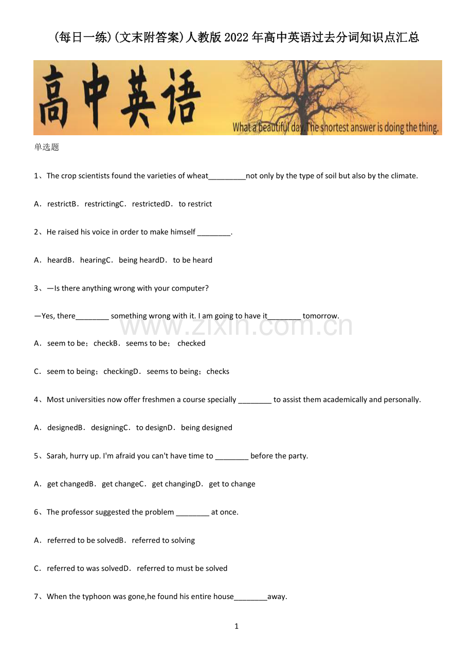 1 (每日一练每日一练)()(文末附答案文末附答案)人教版人教版 20222022 年高中英语过去分词知识点汇总年高中英语过去分词知识点汇总 单选题 1、The crop scientists found the varieties of wheat_not only by the type of soil but also by the climate.ArestrictBrestrictingCrestrictedDto restrict 2、He raised his voice in order to make himself _.AheardBhearingCbeing heardDto be heard 3、Is there anything wrong with your computer?Yes,there_ something wrong with it.I am going to have it_ tomorrow.Aseem to be;checkBseems to be;checked Cseem to being;checkingDseems to being;checks 4、Most universities now offer freshmen a course specially _ to assist them academically and personally.AdesignedBdesigningCto designDbeing designed 5、Sarah,hurry up.Im afraid you cant have time to _ before the party.Aget changedBget changeCget changingDget to change 6、The professor suggested the problem _ at once.Areferred to be solvedBreferred to solving Creferred to was solvedDreferred to must be solved 7、When the typhoon was gone,he found his entire house_away.2 Ato blowBblownCblewDblowing 8、Theres a note _ to the door _ when the shop will open again.Apinned;sayingBpinned;says Cbeing pinned;readingDbeing pinned;reads 9、The girl sat there quite silent and still with her eyes _ on the wall.AfocusingBfocusedCto focusDto be focused 10、Greatly moved by the film Battle of Chosin Reservoir,_.Atears could hardly be held backBtears came to his eyes Che could hardly hold back his tearsDhis eyes were filled with tears 3 人教版 2022 年高中英语过去分词_018 参考答案 1、答案:C 解析:考查非谓语动词。句意:农作物科学家发现,小麦品种不仅受土壤类型的限制,而且受气候的限制。restrict“限制”,为及物动词。此处为“find+宾语+补语”,wheat 和 restrict 为动宾关系,所以要用过去分词作宾补。结合选项,故选 C。2、答案:A 解析:考查非谓语动词。句意:他提高了声音,以便别人能听到他的话。make sb/sth done 是英语习惯表达,动词make 后接复合宾语,非谓语动词 hear 和宾语 himself 之间是被动关系,用其过去分词作宾语补足语,符合句意。故选 A 项。3、答案:B 解析:考查主谓一致和非谓语动词。句意:你的电脑有什么问题吗?是的,好像有点问题。我明天要检查一下。根据句型分析和句意可知,第一空是 seem to do,表“似乎要做”,为固定短语,该句为一般现在时,且主语是 something,所以 seem 应该用第三人称单数形式;第二空是 have sth done 表“让某事被做”,也为固定搭配。故选 B 项。4、答案:A 解析:考查非谓语动词。句意:大多数大学现在为新生提供一门专门设计的课程从学术和个人上来帮助他们。分析句子可知,句子谓语动词是 offer,design 用非谓语动词形式,修饰 course 作定语,design 与逻辑主语 course 之间是被动关系,故用过去分词,D 项是现在分词的被动式,表示进行的动作,根据句意,故选 A。4 5、答案:A 解析:考查固定用法。句意:Sarah,快点。恐怕你在聚会前没有时间换衣服了。have time to do sth,为固定用法,意为“有时间做某事”,而 get changed 为固定短语,意为“换衣服”。故选 A 项。6、答案:A 解析:考查过去分词和 suggest 的用法。句意:教授建议所提到的那个问题应该马上予以解决。the problem 和referred to 之间是被动关系,此处是过去分词做后置定语,相当于定语从句 which had been referred to;suugest“建议”接句子时用虚拟语气(should)+动词原形,其中 should 可以省略,再根据 the problem 和 solve 之间是被动关系,所以要用被动语态(should)be solved。故选 A。小提示:Suggest 用法小结 一suggest 表示建议 1)suggest+doing sth.He suggested going out for a walk.2)suggest+(that)+主语+(should)do+sth 其中的 should 可以省略 He suggested that you should go there tomorrow.=He suggested you go there tomorrow.注意,不可以这样说:He suggested you to go there tomorrow.也就是说 suggest 不可以加不定式的复合结构.3)it is suggested that+主语+(should)do sth.It is suggested that the work(should)be finished at once.4)suggestion 做主语时,其后的表语从句也用这个结构即:The suggestion is that+主语+should+do sth 5 His suggestion is that I should leave for Beijing immediately.二.suggest 表示暗示或表明之意,注意此时做主语时后面的表语从句用陈述语气 Her yawn suggested that she was sleepy.她哈欠连天表明她困了。7、答案:B 解析:考查非谓语动词。句意:台风过后,他发现自己的整栋房子都被吹走了。此处为“find+宾语+宾补”结构,house与 blow away 之间是逻辑上的动宾关系,表示被动,所以用过去分词作宾补,故选 B 项。8、答案:A 解析:考查非谓语动词。句意:门上别着一张纸条,上面写着商店什么时候再开门。结合句意和句子结构可知,第一空作名词 note 的后置定语,应用非谓语动词,逻辑主语 note 和 pin 之间是被动关系,应用过去分词;第二空作状语,逻辑主语 note 和 say(写着)之间为主动关系,应用现在分词。综上,故选 A。小提示:9、答案:B 解析:考查非谓语动词。句意:女孩静静地坐在那里,眼睛盯着墙壁。此处为 with 的复合结构“with+宾语+宾补”,且eyes 和 focus 之间是动宾关系,用过去分词作宾补。故选 B。10、答案:C 解析:考查逻辑主语和非谓语动词。句意:被电影长津湖深深打动,他几乎无法抑制自己的眼泪。分析句子可知,状语的逻辑主语被省略,说明其逻辑主语与主句主语一致。由 moved 推知状语的逻辑主语应该是“人”,且和 6 move 之间为被动关系。C 选项的主语“he”与 move 是逻辑被动关系,且符合语境。故选 C 项。