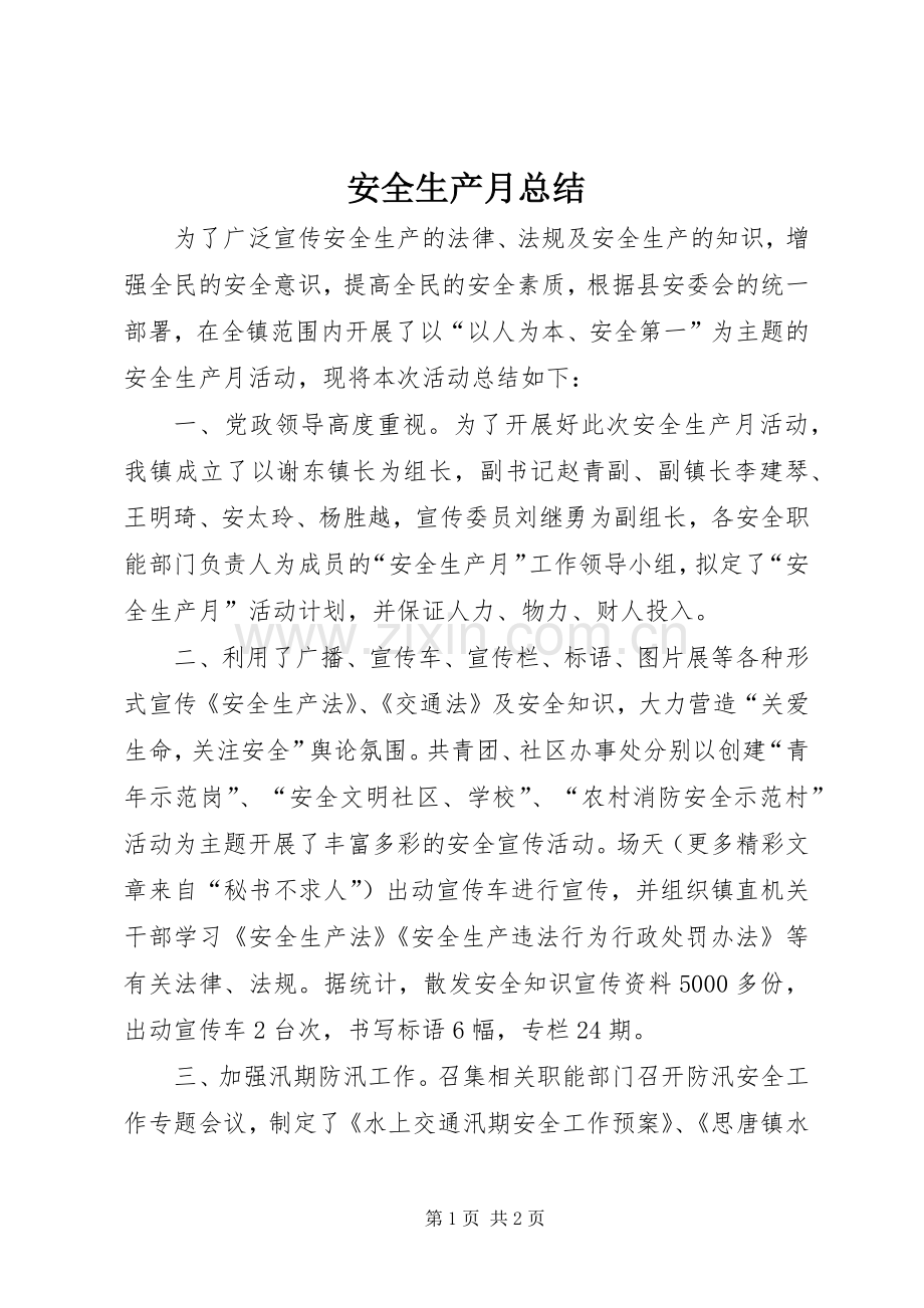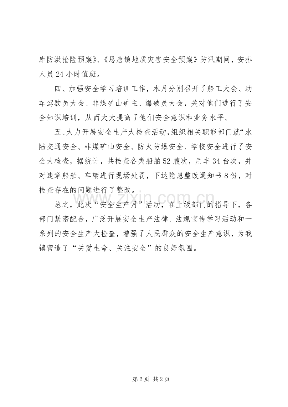 总之,此次“安全生产月”活动,在上级部门的指导下,各部门紧密配合,广泛开展安全生产法律、法规宣传学习活动和一系列的安全生产大检查,增强了人民群众的安全生产意识,为我镇营造了“关爱生命、关注安全”的良好氛围。