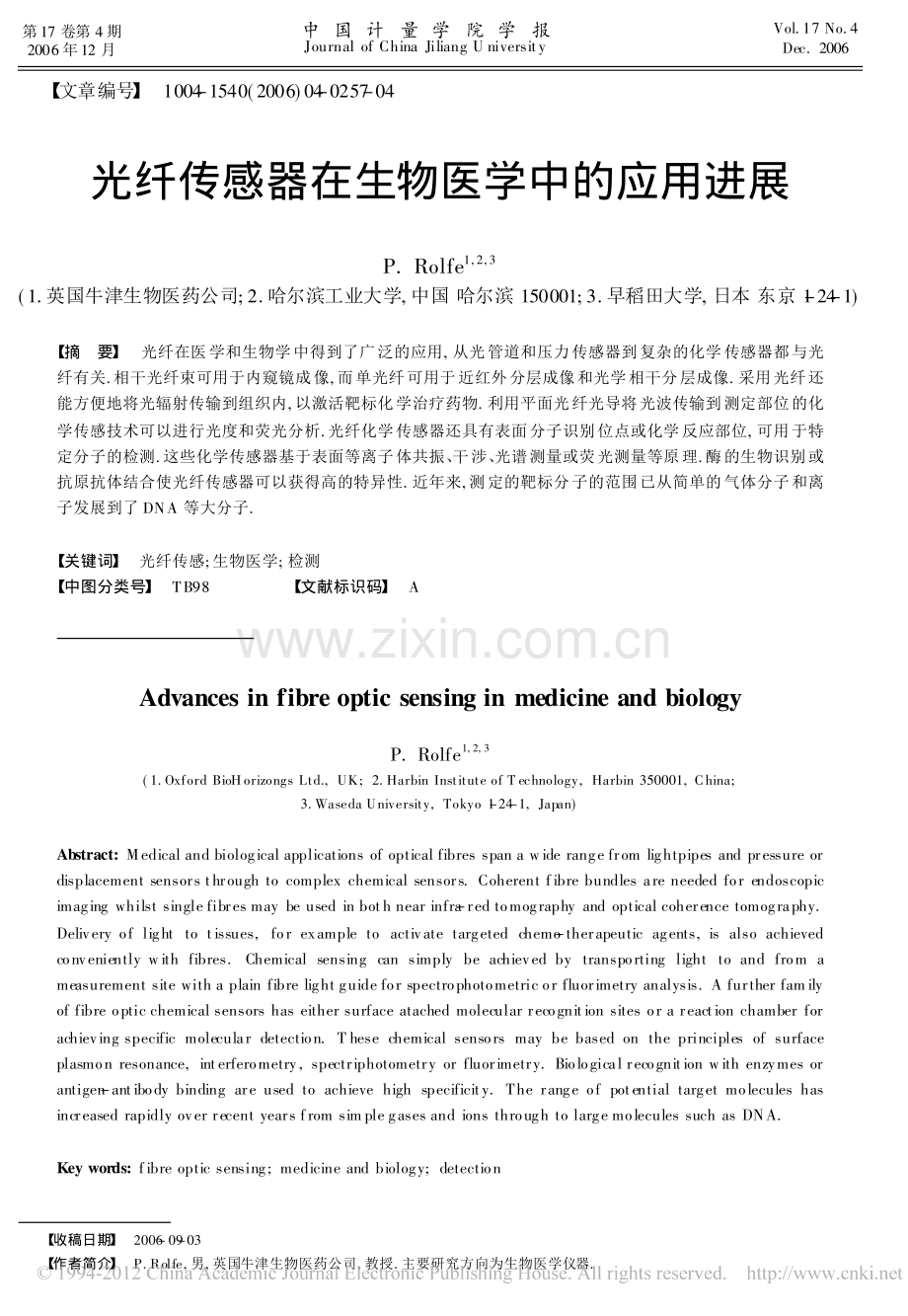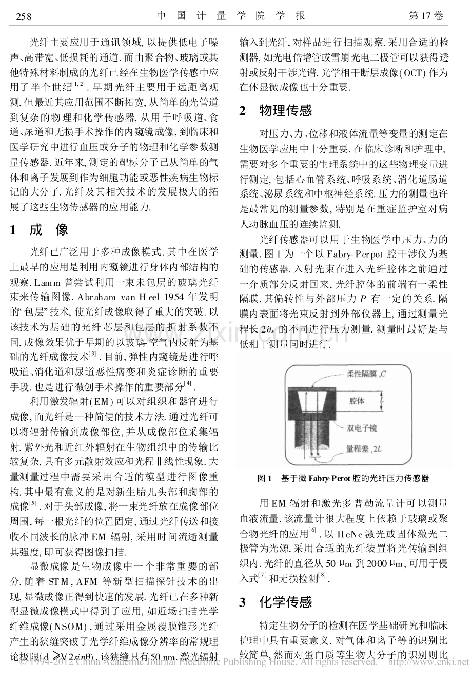 第17 卷第 4 期2006 年12 月中 国 计 量 学 院 学 报Journal of China Jiliang U niversityVol.17 No.4Dec.2006 【文章编号】1004-1540(2006)04-0257-04【收稿日期】2006-09-03【作者简介】P.Rolfe,男,英国牛津生物医药公司,教授.主要研究方向为生物医学仪器.光纤传感器在生物医学中的应用进展P.Rolfe1,2,3(1.英国牛津生物医药公司;2.哈尔滨工业大学,中国 哈尔滨 150001;3.早稻田大学,日本 东京 1-24-1)【摘 要】光纤在医学和生物学中得到了广泛的应用,从光管道和压力传感器到复杂的化学传感器都与光纤有关.相干光纤束可用于内窥镜成像,而单光纤可用于近红外分层成像和光学相干分层成像.采用光纤还能方便地将光辐射传输到组织内,以激活靶标化学治疗药物.利用平面光纤光导将光波传输到测定部位的化学传感技术可以进行光度和荧光分析.光纤化学传感器还具有表面分子识别位点或化学反应部位,可用于特定分子的检测.这些化学传感器基于表面等离子体共振、干涉、光谱测量或荧光测量等原理.酶的生物识别或抗原抗体结合使光纤传感器可以获得高的特异性.近年来,测定的靶标分子的范围已从简单的气体分子和离子发展到了 DNA 等大分子.【关键词】光纤传感;生物医学;检测【中图分类号】TB98 【文献标识码】AAdvances in fibre optic sensing in medicine and biologyP.Rolfe1,2,3(1.Oxford BioHorizongs Ltd.,UK;2.Harbin Institute of T echnology,Harbin 350001,China;3.Waseda University,Tokyo 1-24-1,Japan)Abstract:Medical and biological applications of optical fibres span a wide range from lightpipes and pressure ordisplacement sensors through to complex chemical sensors.Coherent fibre bundles are needed for endoscopicimaging whilst single fibres may be used in both near infra-red tomography and optical coherence tomography.Delivery of light to tissues,for example to activate targeted chemo-therapeutic agents,is also achievedconveniently with fibres.Chemical sensing can simply be achieved by transporting light to and from ameasurement site with a plain fibre light guide for spectrophotometric or fluorimetry analysis.A further familyof fibre optic chemical sensors has either surface atached molecular recognition sites or a reaction chamber forachieving specific molecular detection.T hese chemical sensors may be based on the principles of surfaceplasmon resonance,interferometry,spectriphotometry or fluorimetry.Biological recognition with enzymes orantigen-antibody binding are used to achieve high specificity.The range of potential target molecules hasincreased rapidly over recent years from simple gases and ions through to large molecules such as DNA.Key words:fibre optic sensing;medicine and biology;detection 光纤主要应用于通讯领域,以提供低电子噪声、高带宽、低损耗的通道.而由聚合物、玻璃或其他特殊材料制成的光纤已经在生物医学传感中应用了半个世纪 1,2.早期光纤主要用于远距离观测,但最近其应用范围不断拓宽,从简单的光管道到复杂的物理和化学传感器,从用于呼吸道、食道、尿道和无损手术操作的内窥镜成像,到临床和医学研究中进行血压或分子的物理和化学参数测量传感器.近年来,测定的靶标分子已从简单的气体和离子发展到作为细胞功能或恶性疾病生物标记的大分子.光纤及其相关技术的发展极大的拓展了这些生物传感器的应用能力.1 成 像光纤已广泛用于多种成像模式.其中在医学上最早的应用是利用内窥镜进行身体内部结构的观察.Lamm 曾尝试利用一束未包层的玻璃光纤束来传输图像.Abraham van H eel 1954 年发明的/包层0技术,使光纤成像取得了重大的突破.以该技术为基础的光纤芯层和包层的折射系数不同,成像效果优于早期的以玻璃-空气内反射为基础的光纤成像技术 3.目前,弹性内窥镜是进行呼吸道、消化道和尿道恶性病变和炎症诊断的重要手段.也是进行微创手术操作的重要部分 4.利用激发辐射(EM)可以对组织和器官进行成像,而光纤是一种简便的技术方法.通过光纤可以将辐射传输到成像部位,并从成像部位采集辐射.紫外光和近红外辐射在生物组织中的传输比较复杂,具有多元散射效应和光程非线性现象.大量测量过程中需要采用合适的模型进行图像重构.其中最有意义的是对新生胎儿头部和胸部的成像 5.对于头部成像,将一束光纤放在成像部位周围,每一根光纤的位置固定,通过光纤传送和接收不同波长的脉冲 EM 辐射,采用时间流逝测量其强度,即可获得图像扫描.显微成像是生物成像中一个非常重要的部分.随着 ST M,AFM 等新型扫描探针技术的出现,显微成像正得到快速的发展.光纤已在多种新型显微成像模式中得到了应用,如近场扫描光学纤维成像(NSOM),通过采用金属覆膜锥形光纤产生的狭缝突破了光学纤维成像分辨率的常规理论极限(d K/2sinH),该狭缝只有50 nm.激光辐射输入到光纤,对样品进行扫描观察.采用合适的检测器,如光电倍增管或雪崩光电二极管可以获得透射或反射干涉光谱.光学相干断层成像(OCT)作为在体显微成像也十分重要.2 物理传感对压力、力、位移和液体流量等变量的测定在生物医学应用中十分重要.在临床诊断和护理中,需要对多个重要的生理系统中的这些物理变量进行测定,包括心血管系统、呼吸系统、消化道肠道系统、泌尿系统和中枢神经系统.压力的测量也许是最常见的测量参数,特别是在重症监护室对病人动脉血压的连续监测.光纤传感器可以用于生物医学中压力、力的测量.图 1 为一个以 Fabry-Perpot 腔干涉仪为基础的传感器.入射光束在进入光纤
