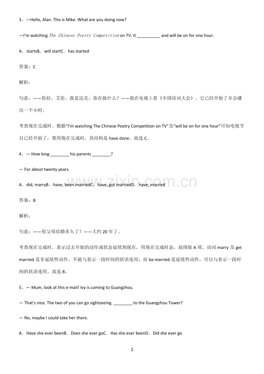 1 (每日一练每日一练)人教版初三英语现在完成时易错题集锦人教版初三英语现在完成时易错题集锦 单选题 1、He _ the school football team for 3 years.Ahas been inBhas joined inChas joinedDhas been 答案:A 解析:句意:他加入学校足球队已经三年了。考查现在完成时和动词辨析。be in 加入,从而成为其中一员,参加运动项目,延续性动词;加入;join in 参加活动,非延续性动词;join 参加(某组织),参加到某个人群中去,从而成为其中一员,非延续性动词。由时间状语“for 3 years”可知用延续性动词 be in,故选 A。2、How long have you _?For about 8 years.Aleft hometownBarrived in JinanCjoined the clubDlearned English 答案:D 解析:句意:你学英语多久了?大约八年了。考查延续性动词。left hometown 离开家乡;arrived in Jinan 到达济南;joined the club 加入俱乐部;learned English 学英语。“For about 8 years”是一段持续的时间,需和延续性动词连用;结合选项,前三项动词left/arrived/joined 都是终止性动词,只有 learned 是延续性动词,故选 D。2 3、Hello,Alan.This is Mike.What are you doing now?Im watching The Chinese Poetry Competition on TV.It _ and will be on for one hour.AstartsBwill startChas started 答案:C 解析:句意:你好,艾伦。我是迈克,你在做什么?我在电视上看中国诗词大会。它已经开始了并会播出一个小时。考查现在完成时。根据“Im watching The Chinese Poetry Competition on TV”及“will be on for one hour”可知电视节目已经开始了,要用现在完成时,其结构是 have done。故选 C。4、How long _ his parents _?For about twenty years.Adid,marryBhave,been marriedChave,got marriedDhave,married 答案:B 解析:句意:你父母结婚多久了?大约 20 年了。考查现在完成时。表示过去开始的动作或状态延续到现在,用现在完成时态,故排除 A 项。动词 marry 及 get married 是非延续性动作,不能与表示一段时间的状语连用;而 be married 是延续性动作,可以与表示一段时间的状语连用。故选 B。5、Mum,look at this e-mail!Ivy is coming to Guangzhou.Thats nice.The two of you can go sightseeing._ to the Guangzhou Tower?No,maybe I could take her there.AHave she ever beenBDoes she ever goCHas she ever beenDDid she ever go 3 答案:C 解析:句意:妈妈,看这封电子邮件!艾薇要来广州了。太好了。你们两个可以去观光。她曾经去广州塔吗?没有,也许我可以带她去那里。考查动词时态。ever“曾经”,现在完成时标志词,排除 B、D。have/has been to“曾经去过某地”,主语是 she,助动词用 has。故选 C。6、When will the musical Cat begin?Oh,youre late.It _ for ten minutes.Awill beginBhas begunCwill be onDhas been on 答案:D 解析:句意:音乐剧猫什么时候开始?哦,你晚了,它已经开始十分钟了。考查动词时态。will begin 一般将来时;has begun 现在完成时;will be on 将要上映;has been on 已经开演。根据句中“for ten minutes”可知,这里表示“音乐剧已经开始十分钟了”,应用现在完成时;begin 是瞬间性动词,不能和一段时间连用,因此这里用 be on。故选 D。7、Could you tell me _?I must find him.Sorry.I have no idea.But he was here just now.Awhere Tom wasBwhere Tom has goneCwhere can I find TomDwhere Tom has been 答案:B 解析:句意:你能告诉我汤姆去了哪里吗?我必须找到他。对不起。我不知道。但他刚才还在这里。考查宾语从句和现在完成时。根据题干“Could you tell me”可知,此处应为宾语从句,要用陈述句语序,可排4 除 C 选项;主句中的“Could you tell”是委婉语气,结合“I must find him”和语境,可知汤姆不在说话现场,需用现在完成时“has gone”结构。故选 B。8、_ to Canada?No,never.But I _ to the USA a few years ago.AHave you been;wentBHave you gone;wentCDid you go;have gone 答案:A 解析:句意:你去过加拿大吗?没有,从来没有。但是几年前我去了美国。考查时态。根据“No,never”以及语境可知此处询问“是否去过”,用 have been to“去过”;根据“a few years ago”可知空格二用一般过去时,动词用过去式。故选 A。9、Have you watched the film The Battle At Lake Changiin?Yes,I watched it yesterday.So far,the total box office of it _ 5.695 billion yuan.AreachesBreachedChas reached 答案:C 解析:句意:你看过电影长津湖吗?是的,我昨天看了。到目前为止,它的总票房已经达到 56.95 亿元。考查动词时态。根据时间状语 So far 可知用现在完成时,其结构是 have/has done 的形式,主语是单数,助动词用 has,reach“达到”,过去分词是 reached,故选 C。10、Tom _ the USAHe wont come to the party tonight.Ahas gone toBhas been toChave gone to 答案:A 解析:5 句意:汤姆已经去美国了。他今晚不会来参加晚会了。考查短语辨析。has gone to 去了某地,主语为单三人称;has been to 曾经去过某地;have gone to 去了某地,主语为非单三人称。根据“He wont come to the party tonight.”可知,是去了美国,没回来,且主语是 Tom,助动词用 has。故选 A。11、Where is your father,Jenny?He isnt at home.He _ to Shanghai on business.Ahas beenBhas goneCwentDwill go 答案:B 解析:句意:詹妮,你爸爸呢?他不在家。他去上海出差了。考查现在完成时。根据前文“He isnt at home”,可知去了还没回来,应该用 have/has gone to,故选 B。12、The life they were used to _ greatly since their son was born.AchangeBhaving changedCchangingDhas changed 答案:D 解析:句意:自从他们的儿子出生以来,他们习惯的生活发生了很大的变化。考查现在完成时。根据时间状语“since their son was born”可知,应用现在完成时,其结构为“have/has+动词过去分词”;句中“we were used to”作句子主语的定语,所以主语是“the life
