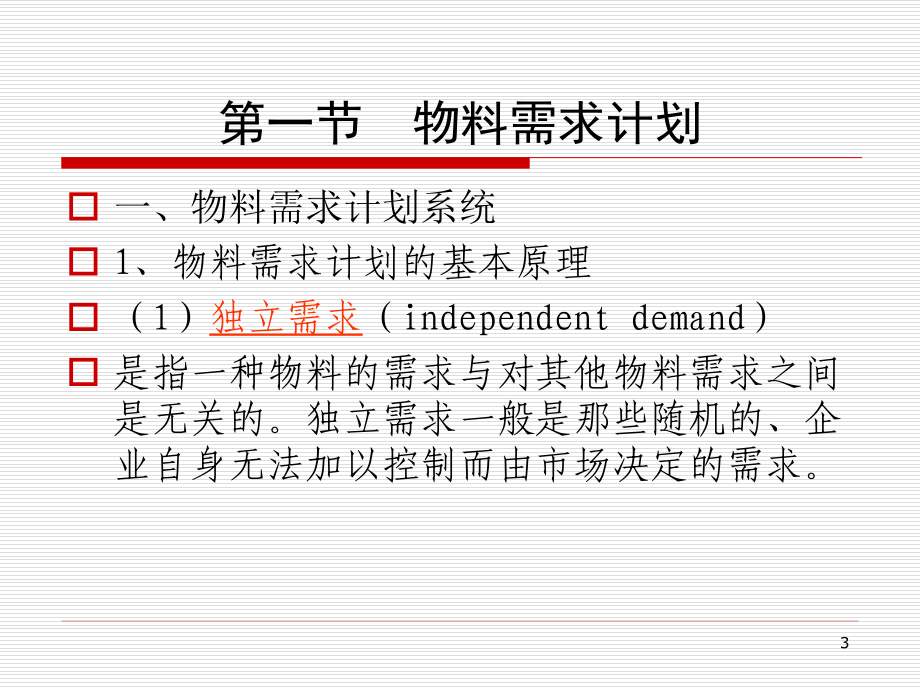单击此处编辑母版标题样式,单击此处编辑母版文本样式,第二级,第三级,第四级,第五级,*,第六章 制造资源计划与企业资源规划,一、教学目标,1,、掌握独立需求和相关需求的概念;,2,、理解,MRP,系统的基本构成和原理;,3,、掌握,MRP,的基本计算过程;,4,、理解,MRP,和,MRP,的异同;,5,、了解,ERP,系统的运作过程及与,MRP,的不同。,二、教学难点与重点,1,、批量规则;,2,、,MRP,的基本计算过程。,1,本章的章节结构,第一节 物料需求计划,第二节 制造资源计划,第三节 企业资源计划,2,第一节 物料需求计划,一、物料需求计划系统,1,、物料需求计划的基本原理,(,1,),独立需求,(,independent demand,),是指一种物料的需求与对其他物料需求之间是无关的。独立需求一般是那些随机的、企业自身无法加以控制而由市场决定的需求。,3,(,2,),相关需求,(,dependent demand,),是指一种物料的需求与其他物料的需求具有内在的相关性。这种相关性表现在空间、时间与数量三个方面。,4,2,、开环物料需求计划系统的构成,最初的,MRP,系统是一个开环系统,该系统是由主生产计划(,MPS,)子系统、物料清单(,BOM,)维护子系统、库存管理(,IM,)子系统与物料需求计划(,MRP,)编制子系统四部分组成。,5,6,开环物料需求计划系统的构成,(,1,)主生产计划子系统,(,2,)产品结构资料维护子系统,(,3,)库存管理子系统,(,4,)物料需求计划编制子系统,7,产品结构资料维护子系统,产品结构树,是以树状图形式描述产品结构。通常为了方便计算物料需求量,要求树状图按照最低层级规则(,lower level coding,)绘制,即将构成产品的各种物料按其隶属关系分为不同的层级,这样,上、下层级的物料为母子项关系。,8,产品结构资料维护子系统,物料表,产品结构树能直观地描述产品内各种物料的结构关系,但其图形方式不便于计算机处理。物料表是用表格形式表示构成产品的各种物料的结构关系。,物料表包括,多级物料表,和,单级物料表,。多级物料表为矩阵式表格,由于存在数据冗余,需占用较多的空间。此外,对物料项进行修改时,需要重新编制新的表格。为了避免这些缺点,可将其拆分为单级物料表。,9,10,库存管理子系统,库存管理子系统包括了所有半成品、毛坯及原材料等库存物料数据资料。,该数据资料分为两类:,主数据:说明物料的基本特征,如物料代码、名称、材料、单价、供应来源等;,辅助数据:变动数据,如现有库存量、最小储备量等。,11,物料需求计划编制子系统,该系统是,MRP,系统的核心部分,它是建立在主生产计划子系统、产品结构资料维护子系统以及库存管理子系统的基础上进行编制的。,12,二、,MRP,的基本计算过程,计算,MRP,时,从,0,级开始,由上而下,逐层进行。,1,、计算项目,(,1,)总需求量或毛需求量,G,j,(t),表示对物料,j,在,t,周期预计需求量。,(,2,)计划到货量(或计划入库量),S,j,(t),表示订购或已生产,预计在计划周期,t,内到货入库的物料数量。,13,(,3,)可用库存量,H,j,(t),表示在满足本期总需求量后,剩余的可供下一个周期使用的库存量。计算公式为:,H,j,(t)=H,j,(t-1)+S,j,(t,),+P,j,(t)-,G,j,(t),14,(,4,)净需求量,N,j,(t),当可用库存量不够满足当期总需求量时,即,H,j,(t),小于零,其短缺部分就转化为净需求量。,N,j,(t)=G,j,(t)-H,j,(t-1)-S,j,(t),-P,j,(t),15,(,5,)计划订货量,P,j,(t),一般净需求量,N,j,(t),就是生产批量或订货批量,但考虑到生产的经济性及其他生产约束条件,需要按批量规则将净需求量,N,j,(t),调整为生产批量或订货批量,P,j,(t),。,16,(,6,)计划投入量,R,j,(t,),投入生产或提出采购的数量,其数量与计划订货量相同,但时间需要按计划订货量的时间反推一个提前期,即,R,j,(t,),P,j,(t,L),17,2,、,MRP,的计划因子,(,1,)计划期与计划周期计划期是指相临两次,MRP,计算的时间间隔,它是由若干个称为计划周期的小时间段组成。计划周期长度的大小反映了,MRP,的细致程度,并与整个计算工作量成反比,一般取其为一周。,(,2,)提前期,(,3,)批量规则,18,静态批量规则,a,固定批量法,b,经济订货批量,19,动态批量规则,a,固定订货间隔期法,b,直接批量法,c,最小总成本法,20,最小总成本法(,Groff,法),将未来若干期的需求量合并为一批,比较由于合并带来的订货成本的节省量与由此导致的保管成本增加量。若前者大于或等于后者,则合并;否则,不合并。称两者相等时累计的库存量(存货数量与存货时间的乘积以,E,来表示)为临界库存量。,设每次订货费用为,C,,单位产品每周期的保管费为,H,,未来各期的净需求量为,Q,i,。则:,C=(HQ,2,+2HQ,3,+,+kHQ,k+1,)=EH,则,E=C/H=Q,2,+2Q,3,+,+kQ,k+1,21,例:设某产品的成本为,100,元,保管费用为,1,,订货费用为,100,元,未来各期的净需求量如表,6-1,所示。试按照最小成本法批量规则计算每次订货数量。,未来各期的净需求量,周期,1,2,3,4,5,6,7,8,9,10,11,12,净需求量,35,10,0,25,20,0,30,10,30,40,0,20,22,按最小成本法算例,周期,需求量,预定批量,k,LQ,1,35,35,0,2,10,45,1,10,3,0,2,4,25,70,3,85,5,20,20,0,6,0,1,7,30,50,2,60,8,10,60,3,90,9,30,30,0,10,40,70,1,40,11,0,2,12,20,90,3,100,23,(4),安全库存,安全库存主要是为了应付市场波动及供应商的不可靠性而设置的库存量。,3,、,MRP,的输出报告,4,、,MRP,系统的更新,(,1,)重新生成方式,(,2,)净变更方式,24,5,、,MRP,计算举例,某工厂批量生产家用电器,产品系列中有,A,、,B,两种产品,其结构树如图,6,6,所示。表,6,3,是从库存管理子系统得到的产品,A,、产品,B,及所属物料的库存记录数据。