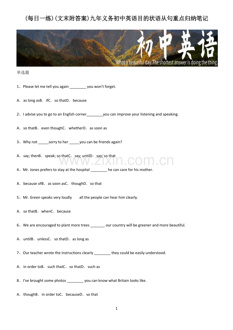 1 (每日一练每日一练)()(文末附答案文末附答案)九年义务初中英语目的状语从句重点归纳笔记九年义务初中英语目的状语从句重点归纳笔记 单选题 1、Please let me tell you again _ you wont forget.Aas long asBifCso thatDbecause 2、I advise you to go to an English corner_you can improve your listening and speaking.Aso thatBeven thoughCwhetherDas soon as 3、Why not sorry to her you can be friends again?Asay;thenBspeak;so thatCsay;untilDsay;so that 4、Mr.Jones prefers to stay at the hospital _ he can care for his mother.Abecause ofBas soon asCthoughDso that 5、Mr.Green speaks very loudly all the people can hear him clearly.Aso thatBwhenCbecause 6、We are encouraged to plant more trees _ our country will be greener and more beautiful.AuntilBunlessCso thatDas long as 7、Our teacher wrote the instructions clearly _ they could be easily understood.Ain order toBsuch thatCso thatDsuch as 8、Ive brought some photos _ you can know what Britain looks like.AthoughBin order toCbecauseDso that 2 9、We should find some time to relax ourselves _ we can achieve a better result.Aso thatBthoughCas a resultDunless 10、I argued with my best friend.What should I do?You should talk to him _ you can say youre sorry.Aso thatBsothatCas ifDunless 11、I advise you to take a map with you _ you wont get lost in the forest.Aas long asBso thatCorDuntil 12、The teacher speaks very loudly _ all the students can hear her.Aso thatBbecauseCSinceDas 13、You must improve your study method _ you may make progress in your studies.Aso as toBin order toCsoDin order that 14、Mr Green speaks very loudly all the people can hear him clearly.Aso thatBwhenCbecauseDuntil 15、My aunt gave up her job when her son was born she could look after the baby at home.Aso thatBaccording toCbecause ofDinstead of 3 九年义务初中英语目的状语从句_028 参考答案 1、答案:C 解析:句意:请让我再告诉你一次,这样你就不会忘记了。考查连词短语辨析。as long as 只要,表条件;If 如果,表条件;so that 以便,表目的;because 因为,表原因。本句是结果状语从句,根据句意结构和语境,可知选 C。2、答案:A 解析:句意:我建议你去英语角,这样你可以提高你的听说能力。考查连词。so that 以便;even though 尽管;whether 是否;as soon as 一就。句子“you can improve your listening and speaking.”是“go to an English corner”的目的,因此用 so that 引导目的状语从句。故选 A。3、答案:D 解析:句意:为什么不跟她说声对不起,这样你就可以再做朋友了?考查动词和连词辨析。speak:说,讲,不及物动词;当讲某种语言时是及物动词,例如,speak English。say:说,及物动词,短语 say sorry to sb.:向某人道歉,向某人说声对不起。可知第一个空填 say。then:那么,然后,副词;until:直到,直到为止,引导时间状语从句;so that:这样,以便,为了,使能够,引导目的状语从句。根据句意可知后面的句子表示目的,可知填 so that。故选 D。4、答案:D 解析:句意:Jones 先生宁愿呆在医院里,以便照顾他的母亲。考查连词辨析。because of 因为;as soon as 一就;though 虽然,尽管;so that 以便于。根据“Mr.Jones 4 prefers to stay at the hospital.he can care for his mother”可知,待在医院的目的是为了照顾妈妈,用 so that 引导目的状语从句,故选 D。5、答案:A 解析:考查连词。so that 以便,所以;when 既然,当时;because 因为。句意:格林先生说的很大声,以便于所有人都能清楚地听到他。故选 A。6、答案:C 解析:句意:为了我们的国家更绿更美丽,我们被鼓励去种更多的树。考查连词辨析。until 直到;unless 除非;so that 以便,为了;as long as 只要。根据句中“our country will be greener and more beautiful”可知,让我们的国家更绿更美丽是多种树的目的,所以此处使用 so that 来引导目的状语从句,表示“我们被鼓励种树,目的是让我们的国家更绿更美丽”。故选 C。7、答案:C 解析:句意:我们的老师把说明写得很清楚以便它们易于理解。考查目的状语从句。in order to 为了,后接动词原形 do;such that 到这样的程度,这里的 such 是代词,that 引导的是 such 的同位语从句;so that 以便、为了,引导目的状语从句;such as 像、例如,用来列举事物。分析空前后句句意可知,空处的词引导的是目的状语从句,应用 so that。故选 C。8、答案:D 解析:句意:我带来了一些照片以便你可以知道英国是什么样子。5 考查 so that 引导的目的状语从句。though 虽然;in order to 为了;because 因为;so that 为了,以便,根据Ive brought some photos 和 you can know what Britain looks like 可知,应该是为了,以便,排除 A 和 C,in order to 后面接动词原形,so that 后面接句子,由所给空后面的 you can know what Britain looks like 是句子,所以用so that,排除 B,故选 D。9、答案:A 解析:句意:我们应该找些时间来放松自己,这样我们才能取得更好的成绩。考查连词辨析。so that 以便于;though 尽管;as a result 结果;unless 除非。根据题意可知放松是为了取得更好的成绩,用 so that 引导目的状语从句。故选 A。10、答案:A 解析:句意:我和我最好的朋友吵架了。我该怎么办?你应该跟他谈谈,这样你就可以向他道歉了。考查连词辨析。so that 以便于;sothat 如此以至于;as if 似乎;unless 除非。根据“You should talk to him you can say youre sorry”可知,跟朋友说话的目的是为了道歉,用 so that 引导目的状语从句,故选 A。11、答案:B 解析:句意:我建议你带上一张地图,这样你就不会在森林里迷路了。考查连词。as long as 只要;so that 以便于;or 否则;until 直到。结合句意,你随身带一张地图是为了不在森林里迷路,因此用 so that 引导目的状语从句,故选
