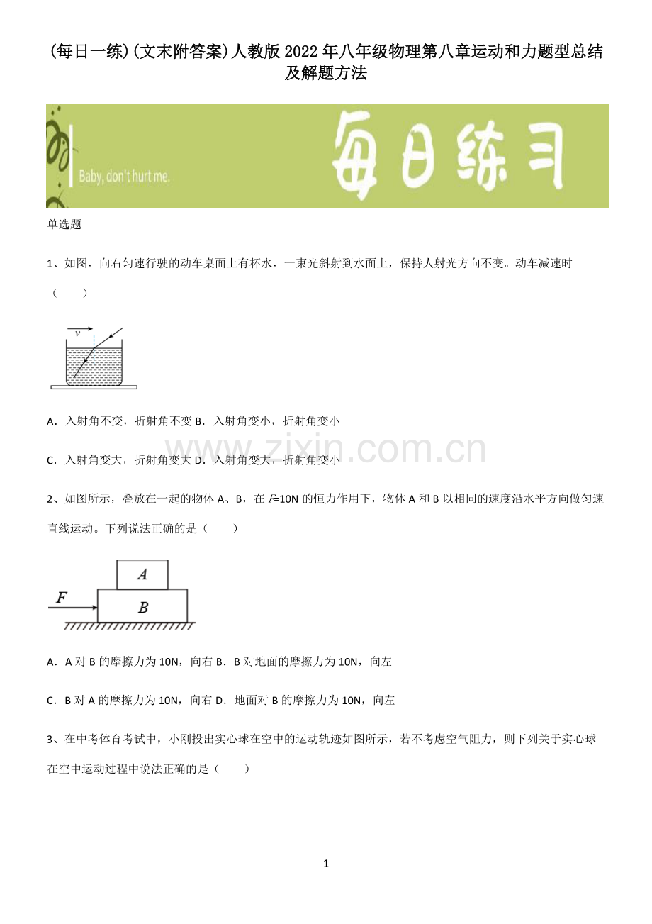 1 (每日一练每日一练)()(文末附答案文末附答案)人教版人教版 20222022 年八年级物理第八章运动和力题型总结年八年级物理第八章运动和力题型总结及解题方法及解题方法 单选题 1、如图,向右匀速行驶的动车桌面上有杯水,一束光斜射到水面上,保持人射光方向不变。动车减速时()A入射角不变,折射角不变 B入射角变小,折射角变小 C入射角变大,折射角变大 D入射角变大,折射角变小 2、如图所示,叠放在一起的物体 A、B,在F=10N 的恒力作用下,物体 A 和 B 以相同的速度沿水平方向做匀速直线运动。下列说法正确的是()AA 对 B 的摩擦力为 10N,向右 BB 对地面的摩擦力为 10N,向左 CB 对 A 的摩擦力为 10N,向右 D地面对 B 的摩擦力为 10N,向左 3、在中考体育考试中,小刚投出实心球在空中的运动轨迹如图所示,若不考虑空气阻力,则下列关于实心球在空中运动过程中说法正确的是()2 A球相对地面是静止的 B球的运动状态保持不变 C在最高点时,若所受力全部消失,它将做匀速直线运动 D球能在空中持续运动,是因为受到惯性力的作用 4、穿轮滑鞋的小致因用力推墙而后退,对此现象中相关物理知识分析正确的是()A小致相对墙是静止的 B小致后退时惯性变小 C力改变了小致的运动状态 D小致对墙的力小于墙对小致的力 5、如图所示,叠放在一起的物体 A、B,在F=10N 的恒力作用下,物体 A 和 B 以相同的速度沿水平方向做匀速直线运动。下列说法正确的是()AA 对 B 的摩擦力为 10N,向右 BB 对地面的摩擦力为 10N,向左 CB 对 A 的摩擦力为 10N,向右 D地面对 B 的摩擦力为 10N,向左 6、下列实例中,为了增大摩擦的是()A旱冰鞋下装有滚轮 B比赛时戴防噪声耳罩 C冰壶底面打磨得很光滑 D足球守门员戴有防滑手套 7、如图所示,水平地面O点两侧粗糙程度不同,物体一直受到沿水平方向 5N 的力F向右运动,利用频闪照片每隔 0.2s 记录物体运动状况。已知物体在MO段做匀速直线运动,下面说法正确的是()3 MO段的平均速度为 5m/s OQ段的平均速度为 6.25m/s MO段的摩擦力为 5N OQ段的摩擦力小于 5N ABCD 多选题 8、如图所示,下列事例中属于减小摩擦的是()A加润滑油 B滚动轴承 C涂防滑粉 D冰壶运动 9、如图所示四幅图对应的说法不正确的是()A图甲中某同学沿杆匀速向上爬升时,该同学受到的摩擦力方向向下 B图乙中筷子提米在空中静止时,筷子所受米给它的摩擦力方向向下 4 C图丙中力F拉动木板 B 使其速度逐渐变大的过程中,弹簧测力计的示数也变大 D图丁中重 200 N 的小车至少要 200 N 的水平方向的力才能推着它做匀速直线运动 10、如图所示为我们在生活中常见的实例,其中你认为对应的解释合理的有()A人推车时他也受到车的推力 B足球运动员用脚踢球并进入球门,这表明力是维持物体运动的原因 C人坐在沙发上时,沙发凹下去,说明力可以改变物体形状 D只有相互接接触的物体之间才能发生力的作用 综合题 11、小明在学习了“力是改变物体运动状态的原因”后想:物体运动状态的改变还跟别的因素有关吗?他查找到如下资料:一辆空车和一辆装满货物的车,在相同的牵引力的作用下由静止开始运动,它们的运动状态改变的情况并不相同。空车的质量小,在较短的时间内可以达到某一速度,运动状态易改变;装满货物的车,质量大,要在较长5 的时间内才能达到相同的速度,运动状态难改变。质量小的物体,运动状态容易改变,我们说它的惯性小;质量大的物体,运动状态难改变,我们说它的惯性大。惯性的大小在实际生活中是经常要加以考虑的。当我们要求物体的运动状态容易改变时,应该尽可能减小物体的质量;相反,当我们要求物体的运动状态不易改变时,应该尽可能增大物体的质量。阅读上文,请你回答以下问题:(1)小明通过查找资料可以得出的结论是:物体运动状态的改变快慢除了与物体_大小有关外,还与物体的_大小有关。(2)请你解释一下,为什么歼击机在战斗前要抛掉副油箱。答:歼击机在战斗前要抛掉副油箱,是为了_,使自身的_容易改变,以提高歼击机的灵活性。(3)在本文第一自然段的叙述中较好地体现了“控制变量法”的思想,研究中所控制的量是:两车受到的_相同和两车的_改变相同。12、请阅读国产大飞机 C919,并回答题。国产大飞机 C919 C919 大型客机是我国具有完全自主知识产权的新一代大型喷气式客机。2017 年 5 月 5 日,大型客机 C919 在上海浦东机场首飞成功(如图所示)。C919 客机是我国建设创新型国家的标志性工程。它使用了占全机结构重量 20-30%极轻的国产铝合金、钛合金及钢等材料,充分体现了 C919 大型客机带动国内基础工业的能力与未来趋势。同时,由于大量采用复合材料,C919 机舱内噪音可降到 60 分贝以下,较国外同类型飞机低了 20 多分贝,乘客会享有更加舒适的机舱体验。C919、水陆两栖飞机 AG600 和大型军用运输机运-20 被称为中国国产大飞机的“三剑客”,三架大飞机的连续亮相,实现了国人的航空强国梦。6 (1)为了进一步减弱飞机飞行时机舱内的噪音,请写出一种可行的方案:_;(2)C919 使用占全机结构重量 2030%极轻的国产铝合金、钛合金及钢等材料。“极轻”的物理含义是指_(选填“硬度”或“密度”)小;(3)请对在空中水平匀速直线飞行的飞机进行受力分析,画出受力分析图,并根据受力分析图说明飞机采用“极轻”材料的优势_。7 人教版 2022 年八年级物理第八章运动和力_007 参考答案 1、答案:C 解析