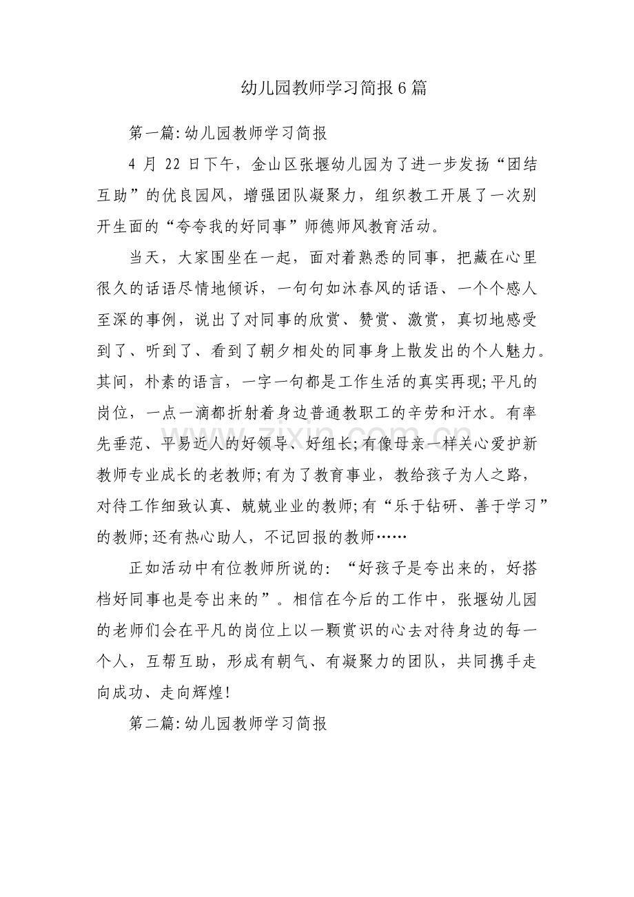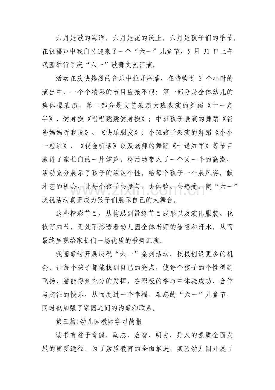 幼儿园教师学习简报 6 篇 第一篇:幼儿园教师学习简报 4 月 22 日下午,金山区张堰幼儿园为了进一步发扬“团结互助”的优良园风,增强团队凝聚力,组织教工开展了一次别开生面的“夸夸我的好同事”师德师风教育活动。当天,大家围坐在一起,面对着熟悉的同事,把藏在心里很久的话语尽情地倾诉,一句句如沐春风的话语、一个个感人至深的事例,说出了对同事的欣赏、赞赏、激赏,真切地感受到了、听到了、看到了朝夕相处的同事身上散发出的个人魅力。其间,朴素的语言,一字一句都是工作生活的真实再现;平凡的岗位,一点一滴都折射着身边普通教职工的辛劳和汗水。有率先垂范、平易近人的好领导、好组长;有像母亲一样关心爱护新教师专业成长的老教师;有为了教育事业,教给孩子为人之路,对待工作细致认真、兢兢业业的教师;有“乐于钻研、善于学习”的教师;还有热心助人,不记回报的教师 正如活动中有位教师所说的:“好孩子是夸出来的,好搭档好同事也是夸出来的”。相信在今后的工作中,张堰幼儿园的老师们会在平凡的岗位上以一颗赏识的心去对待身边的每一个人,互帮互助,形成有朝气、有凝聚力的团队,共同携手走向成功、走向辉煌!第二篇:幼儿园教师学习简报 六月是歌的海洋,六月是花的沃土,六月是孩子们的季节,在祝福声中我们又迎来了一个“六一”儿童节,5 月 31 日上午我园举行了庆“六一”歌舞文艺汇演。活动在欢快热烈的音乐中拉开序幕,在持续近 2 个小时的演出中,一个个精彩的节目应接不暇:第一部分是全体幼儿的集体操表演,第二部分是文艺表演大班表演的舞蹈十一点半、健身操唱唱跳跳健身操;中班孩子表演的舞蹈爸爸妈妈听我说、快乐朋友;小班孩子表演的舞蹈小小一粒沙、我会听话以及老师的舞蹈十送红军等节目赢得了家长们的一片掌声,将活动带入了一个又一个的高潮,活动充分展示了孩子的活泼个性,给每个孩子一个展风姿,献才艺的机会,让每个孩子去参与、去体验、去感受,使“六一”庆祝活动真正成为孩子们展示自己的大舞台。这些精彩节目,从构思到最终节目成形以及演出服装、化妆等细节,无处不渗透着幼儿园全体老师的智慧和汗水,从而最终呈现给家长们一场优质的歌舞汇演。我园通过开展庆祝“六一”系列活动,积极创设更多的机会,让每个孩子都能找到自己的亮点,使每个孩子的个性得到飞扬,潜能得到充分的发挥,在积极的参与中体验成功、合作与交往的快乐,从而度过一个幸福、难忘的“六一”儿童节,同时也加强了家园之间的沟通和联系。第三篇:幼儿园教师学习简报 读书有益于育德、励志、启智、明史,是人的素质全面发展的重要途径。为了素质教育的全面推进,实验幼儿园开展了以“让读书成为好习惯”为主题的读书节活动。活动的开展,开阔了视野、营造了氛围、激发了热情。一、开展月读一本书,日读一小时活动 二、班级读书活动:“我读书,我快乐,我成长“三、亲子共读活动:“我与孩子同读书、共成长“四、向农村幼儿园捐赠图书。为了促进城乡之间教育教学的交流,5 月 28 日,幼儿园开展送教下乡活动。在这项活动中,我园全体教职工、幼儿共捐赠图书 200 多册,各种玩具 300 多件。并且把这些物品及时送到了农村孩子们的手中,充分表达了我园全体教职工、幼儿的一片爱心。从书籍中我们享受到教与学的乐趣,从书籍中找到了理想的栖息地。我园将把这一活动继续延续下去,真正做到让读书成为好习惯。第四篇:幼儿园教师学习简报 为进一步推进阅读活动在幼儿园以及每个家庭的深入、持之以恒的开展,11 月 1 日,以“书香为伴,快乐成长”为主题的黄南州幼儿园读书节系列活动拉开了帷幕。活动旨在激发全园师幼、家长读书的兴趣,营造浓厚的读书氛围,养成良好的读书习惯,提高审美修养和人文底蕴。读书节为期一个月,围绕“书”这一的主题。由一系列富有特色的个性化活动组成如:亲子阅读、亲子故事表演、制作书签、故事大王等。活动中教师们巧妙构思、精心策划、认真组织,呈现了立意深远、内容丰富、形式多样等特点。12 月 9日黄南州幼儿园隆重举行首届“亲子讲故事表演”活动,将读书节推向高潮。活动中家长们全家总动员,积极地准备,和孩子们一起自编、自导、自演各种小故事,并上演了许多经典故事。故事表演结束后评选出本次活动的“书香家庭”“书香宝贝”“故事大王”。通过开展读书节活动,孩子和家长们都收获丰硕、受益无穷。充分体现了幼儿园独具内蕴的阅读特色,彰显了幼儿园老师、家长和孩子们的互相支持、配合、共享的和谐状态。这次读书节活动也是家长了解孩子的一个窗口,是家长和家长、家长和老师之间深入沟通、切磋交流的一个契机。不少家长利用这一机会,就如何提高孩子的阅读能力、培育孩子的健全人格等话题进行沟通、探讨,大家都受益匪浅。第五篇:幼儿园教师学习简报 伴随着幼儿园的孩子们的成长,我们幼儿园的师生都在一天天的进步。为了能跟上学生们的成长,在这短时间以来,我们也在不断的提升自我的成长,让自己能有进步。为此,在教研工作方面,我们都在积极的钻研和进步,通过在工作中改进和调整,不断的提升自我,带动我们每个老师的提升,并且在让每个班级的孩子们都能受到更好的教育感受到更加快乐的幼
