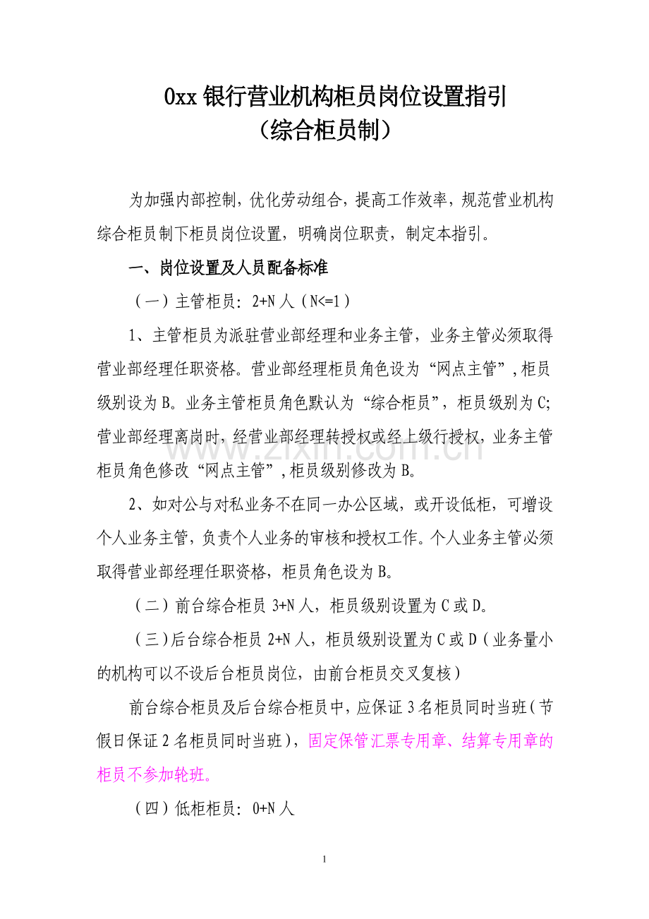 为加强内部控制,优化劳动组合,提高工作效率,规范营业机构综合柜员制下柜员岗位设置,明确岗位职责,制定本指引。