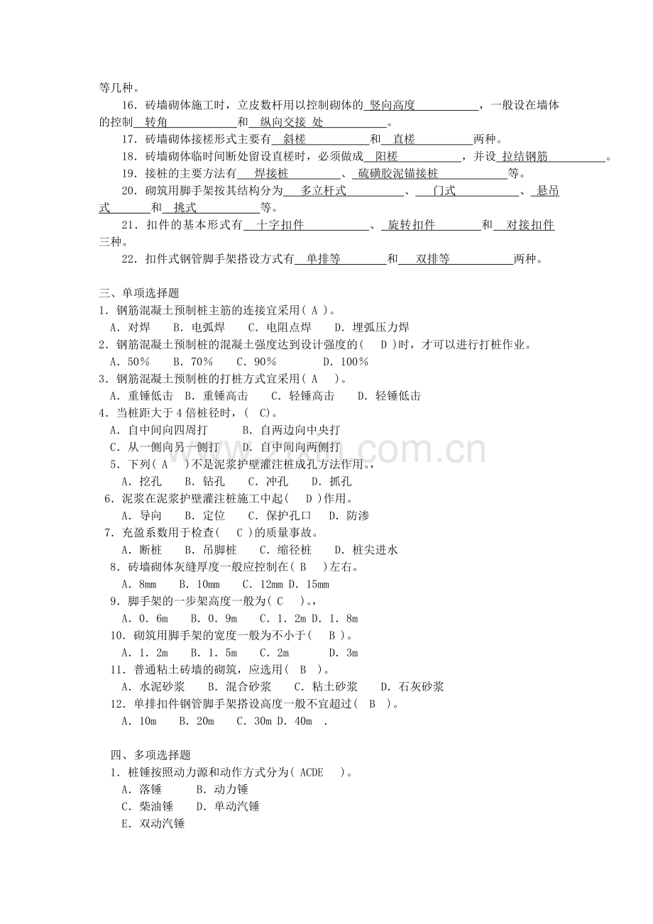 10.泥浆护壁成孔灌注桩的成孔方法有 钻孔 、 抓孔 和 冲孔 等三种。