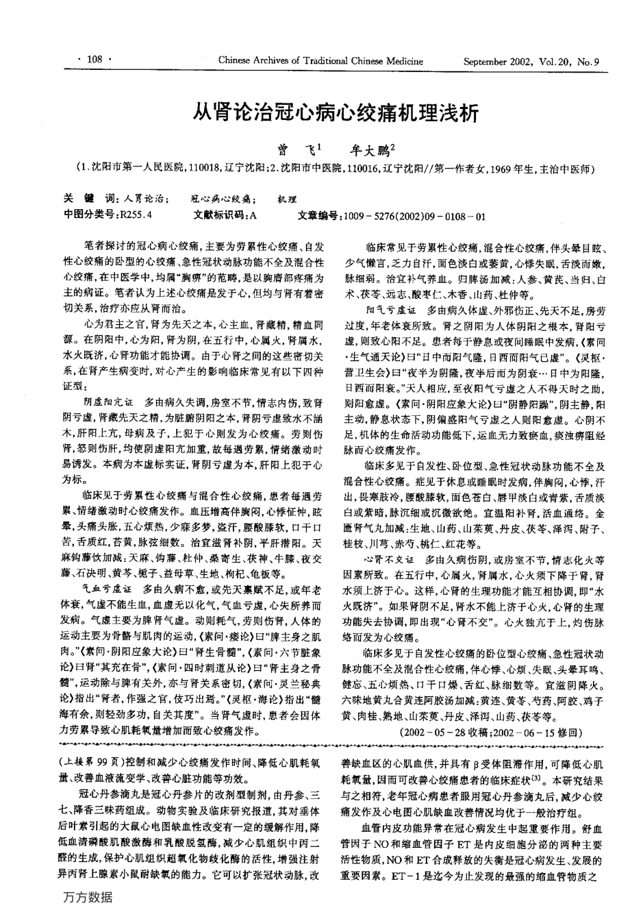 2 0 0 2 年9 胃第2 0 卷第9 囊串医药学手鞋冠心丹参滴丸对冠心病心绞痛血浆内皮素及一氧化氮水平的影响赵敏袁宇红(搿鹰孛嚣掌藐第一辫属鞋懿,4 5 0 0 0 0,掰青帮翻,第一襻者勇,1 9 6 8 年生,生洽医帮)摘要:蚪的:观察冠心丹参滴丸对魁心病心绞痛惠者的性床拧效及其埘血浆内皮素一I(E T 一1)和一氧化戴(N 0)批母辑影响。方法:缱祝连释9 0 镑老年砬心病合并心绞旃毪院患者,分最冠心丹参漓丸(5 0 铡)和霹照虹(4 0 弗|)。暂缚患者均采用相同的口服枕心垃荫药特治疗,其中治疗组加用冠心丹参滴丸,疗程前后分刺测定血浆E T 一1 及N O 水平并观察治疗前君心绞瘫症状疑心电残变纯。结暴:冠t 珏丹誊漓丸照临采尊毒鼓丰为9 4,#电匿总毒效率为7 2;砖照组依次癌6 5 和6 0,统计学比较两组臂显著差异(P O 0 5)。毯心丹参浦丸组血蒙E T 一1 冰平治疗后较治疗前显著下降(P 00 1),而N O 水平则明藏升高(P 00 1)。结论:魁嚣丹参滴丸能改善心统蒲惠者临床症状并能降低患者E T 1 水平,升高N O 班平。关镰词:冠心丹参浦凡;心绞痛;内皮素;一氧化氮中髓势类号:R 拈5 4文靛标识磁;A文章编号:1 0 0 9 5 2 7 6(2 0 0 2)0 9 0 0 9 9 0 3冠心丹参滴丸是冠心丹参片的改造剂型,具有活血化瘀,琏气止瘴之辚敷,已广泛应用子冠心瘸的治疗。为探讨其糕寐及其莱姥可能的作用机制,笔者佯了如下胥f 究,现撒导如下:霹簸与方浚病例选择按照W H O 制定的缺血性心脏病诊断标准,选择心绞痛反复发作、心电璺有缺血性S T T 改变或动态心电黼有心飘缺血改变者9 0 捌(住院患者),醢祝分为冠心丹参滴丸治疗组(治疗组)5 0 例,平均年龄6 6 7 6 6 岁(6 27 9 岁),晏3 6 铡,女1 4 穰。一般治疗爨(对照维鞠裁),平均年龄6 63 72 岁(6】8 2 岁)男2 8 例,女1 2 例。两组性别、年龄无显著整异。入涟者在6 个月内蔸急性心肌梗塞岿史,心翡薷墩馘上,无酐、弩痍辩史,其率2 6 铡经瓣弥造影确诊为冠心病。方法舞缀均学撬疆服鞘馥臻类势物及阿聚莲耩,饕分患者服钙离子掊抗剂,停服A C E I,心绞捕发作时均舌下台服硝酸甘油片,症状改静者硝酸酯用药逐步减量,并记录硝酸酯类药物蔫蟹,其它甜服药蔼缀穰霹。辩心丹参海丸组相用冠心丹参滴丸(中发辩业集团业锐药业有限公可,批号2 0 0 2 0 2 0 1Y R0 0 0 6 8 8 6),每天3 次。每次l O 鞋,舌节食强,毒周为一疗程。观察两组躏人心绞痛发作情况,用药前、后各抽静脒血测定E T1、N O 水平,记录静息心电图变化,部分患者散砖态心彀鹜检查。E T l 薅教砉|免疫法溺定,按药鑫说明书操作。萄盒由解放军总医院东亚免疫技术研究所提供。N O 采用硝酸还原辞法测定,以N O 一2 N O 一3 浓度裁接反陂衄浆N O 水平n j。疗效判断显效:心绞痛发作或硝酸黯用量减少8 0 班上,羚塞心赶窝嵌复正常;有效:心绞癃发作或磷酸醣焉量减少5 0 8 0,心电图敢善,S T 段回升0 5 r a m 以上或主要导联倒置T 波变浅达5 0 以上,或饕卷心电蜜心飘疑盘改善;无效:心绞痛发作或硝酸蘸粥量减步 5 0,静患心电图兜变化“。疗效判断实验数据主#表示+嚣效率攫#硷验,潼疗前后E T 一1 及N O 嫩寝用配对t 检验,P O 0 5 有显著箍异。2 缝栗治疗后两组临床靛状及心电图变化见表l。表l 辫蛆临床疗效比较组别要一治疗魁对照组4 0一一堕墨蓬鲨一显效有效无救总感率心电嘲显技霄救无效总磊蕊牢1 13 659 4。82 8i 07 2 52 l1 46 532 l1 66 0奄对照缝比较。P 0 0 5治疗前、靥血浆E T 一1 及N O 变化见表2。表2 嘲姐治疗前后血浆E T-,、N O 水平静变化组别1 暑氅N O(=m o V l)治疗前治疗后治疗缎”5 6 1 2”6 27 3 1 34 2。6 7 7 8 i 2 2 0 78 6 0 2 2 31 1 对照组7 64 8 1 21 7,0 3 控,9 9 舒4 1 1 2 15 9 弛0 5 2 56 2与治疗前比较,P O 0 13 讨论冠心病心绞痛属中医胸痹心痛范畴。气滞血癣是本病临床常见证候。I 豳床常有腕闷脾蠛,动则心侉,气簸,舌厦紫暗或癀斑,脉弦游表褒。中医辩证屑心血瘀戳,气滞血瘀之话。中联理论认为此病之发生每因情志所伤,忧思伤脾,脾虚气结,逮托失霹,瘩显捧撵。褒|;为痰,痰蒜交鞋,气毅不捶,心脉痹阻发为胸痹心痛;或郁怒伤肝,肝失疏泄,肝部气滞,郁久化火灼津成痰,气滞痰浊痹阻心脉丽成胸痹心痛。现代疆学认为:冠心病翁病淫基础在于心飘缺血,血氧供应不照。冠心丹参滴丸j E 是针对奉病“邪在心,则痴心痛”之病机及熟发瘸势急斡替盘,簌撂“惫粥治其掭”蠢镟。蝮舞瓣究表甓;本药县有改善心肌缺m。(下转第1 0 8 贾、万方数据1 0 8C l f i n e s eA r c h i v e so fT r a d i t i o n a lC h i n e s eM e d i c i n eS e p t e m b e r 2 0 0 2,V o l2 0,N o9从肾论治冠心病心绞痛机理浅析曾飞1牟大鹏2(1 沈阳市第一人民医院,1 1 0 0 1 8,辽宁沈阳;2 沈阳市中医院,1 1 0 0 1 6,辽宁沈阳第一作者女,1 9 6 9 年生,主治中医师)关键词:人胃论治;冠心病心蛀痛;中图分类号:R 2 5 5 4文献标识码:A机理文章编号:1 0 0 9 5 2 7 6(2 0 0 2)0 9 0 1 0 8 0 1笔者探讨的冠心病心绞痛,主要为劳累性心绞痛、自发性心绞痛的卧型的心绞痛、急性冠状动脉功能不全及混合性心绞痛,在中医学中,均属“胸痹”的范畴,是以胸膺部疼痛为主的病证。笔者认为上述心绞痛是发于心,但均与肾有着密切关系治疗亦应从肾而治。心为君主之官,肾为先天之本,心主血肾藏精,精血同源。在阴阳中心为阳,肾为阴,在五行中,心属火,肾属水,水火既济,心肾功能才能协调。由于心肾之间的这些密切关系,在肾产生病变时,对心产生的影响临床常见有以下四种证型:阴虚阳亢证多