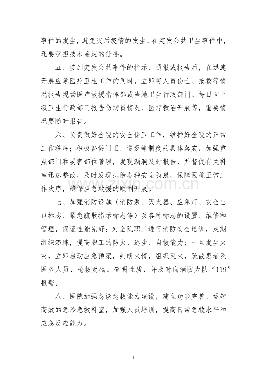 为了明确医院在应对突发事件中应发挥的功能和承担的任务,增强我院职工应对突发事件的能力,面对突发事件时,能够及时、正确、有效的做出反应,把突发事件造成的损失降至最低,特制定我院在应对突发事件中应发挥的功能和承担的任务: