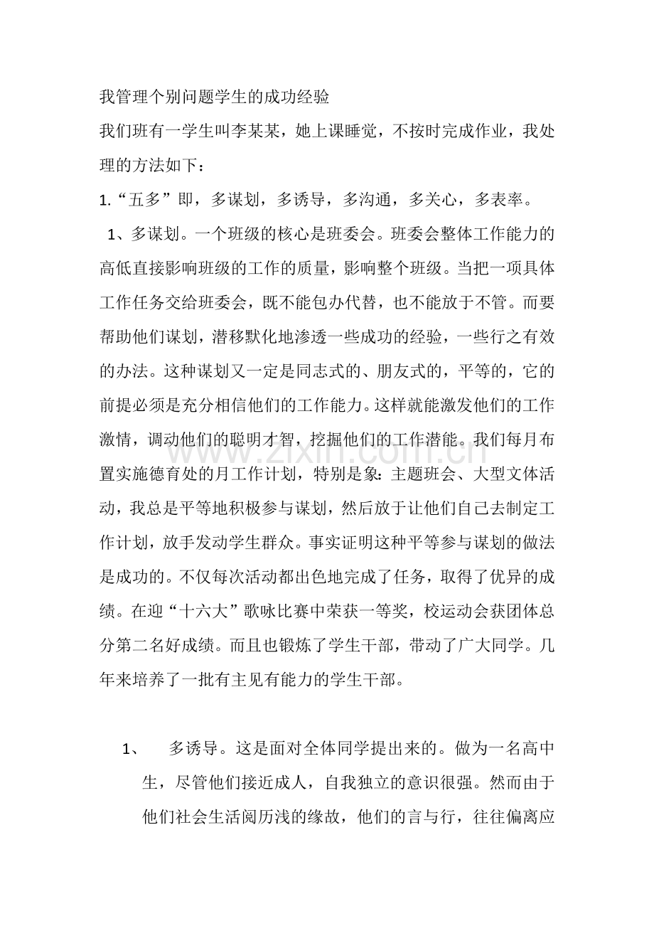 1、 多诱导。这是面对全体同学提出来的。做为一名高中生,尽管他们接近成人,自我独立的意识很强。然而由于他们社会生活阅历浅的缘故,他们的言与行,往往偏离应遵循的行为规范。这时候,是严厉批评、横加指责,还是谆谆善诱,因势利导,其效果是截然不同的。前一种做法,会使他们的言行的发展受到限制,甚至出现“逆反”;另一种做法,则只会提高他们自我教育、自我管理的能力,收到好的效果。在工作实践中,我本着这一原则,帮助学生在大是大非面前,在琐碎小事当中,区别什么是真,什么是假;什么是善,什么是恶;什么是美,什么是丑。提高他们判别是非的能力,提高了他们在学习生活,社会生活中的审美情趣,增强了他们的自我约束能力。从而也就提高了他们自我教育和自我管理的能力。