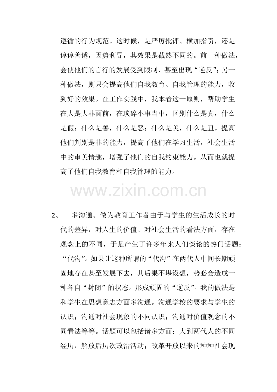 2、 多沟通。做为教育工作者由于与学生的生活成长的时代的差异,对人生的价值、对社会生活的看法方面,存在观念上的不同,于是产生了许多年来人们谈论的热门话题:“代沟”。如果让这种所谓的“代沟”在两代人中间长期顽固地存在甚至发展下去,其后果不堪设想,势必会造成一种各自“封闭”的状态。形成顽固的“逆反”。我的做法是和学生在思想意志方面多沟通。沟通学校的要求与学生的认识;沟通对社会现象的不同认识;沟通对价值观念的不同看法等等。话题可以包括诸多方面:大到两代人的不同经历,解放后历次政治活动;改革开放以来的种种社会现象;小到歌星、影星、球星,追星现象等。其实,这代人所面对的生活内容,社会生活现象,比我们这代人要丰富的多。但他们又相对地不成熟,对一些问题不能有正确的认识,又不希望别人包办代替,强调“独立思考”。这样,这种“沟通”就十分必要了。在相互的沟通当中,弱化他们对上代人不同意识的“警惕”与“抵触”,能敞开胸怀,这样,我们才能引导他们对社会生活现象产生正确的认识,形成正确的人生观。他们成熟了,那么自我教育,自我管理的能力也就相应地增强了。