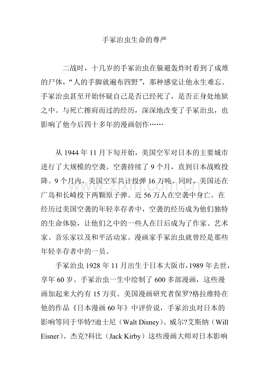 为了让孩子们了解生命的重要性,手冢治虫身患癌症时仍然坚持到大阪为一群学生演讲。他在演讲中说:“在宇宙中,我们数十亿人口住在这个渺小的星球上,而且是和无数的生命共存在一起,这是一件难以想象的事。在这个渺小的星球上,我们活着,却一直互相争执。而且,人们永远只考虑自己的事。我希望人们自私的想法,不要留在孩子们的身上。”