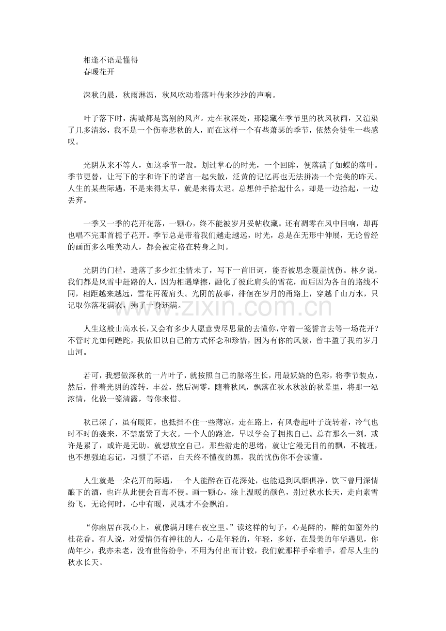 人生就是一朵花开的际遇,一个人能醉在百花深处,也能退到风烟俱净,饮下曾用深情酿下的酒,也许从此便会百毒不侵。画一颗心,涂上温暖的颜色,别过秋水长天,走向素雪纷飞,无论何时,心中有暖,灵魂才不会飘泊。