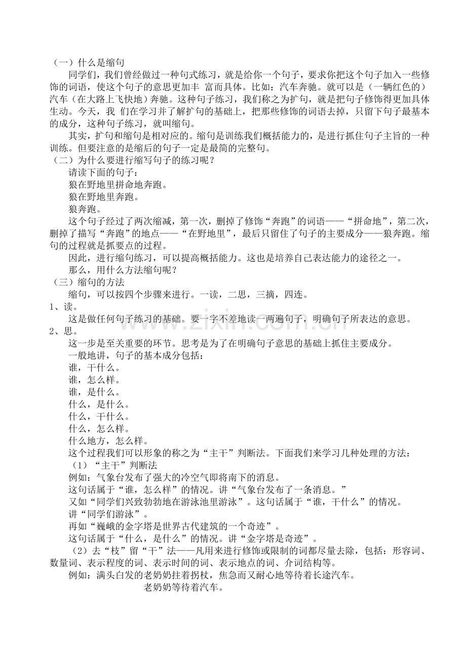 同学们,我们曾经做过一种句式练习,就是给你一个句子,要求你把这个句子加入一些修饰的词语,使这个句子的意思更加丰 富而具体。比如:汽车奔驰。就可以是(一辆红色的)汽车(在大路上飞快地)奔驰。这种句子练习,我们称之为扩句,就是把句子修饰得更加具体生动。今天,我 们在学习并了解扩句的基础上,把那些修饰的词语去掉,只留下句子最基本的成分,这种句子练习,就叫缩句。