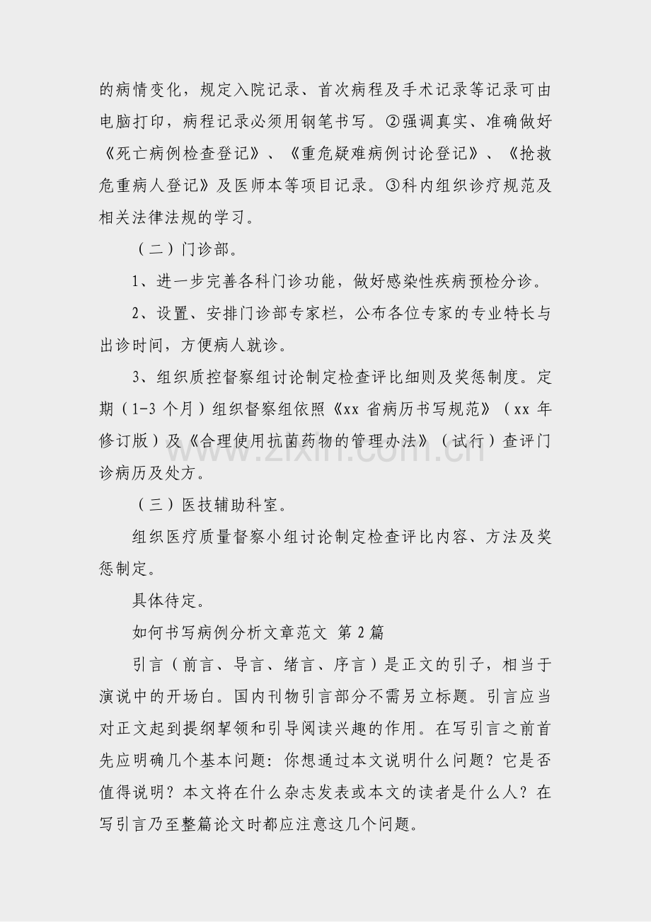 如何书写病例分析文章范文(实用 24 篇)如何书写病例分析文章范文 第 1 篇 为了进一步加大医疗质量管理力度,注重医务人员素质培养和职业道德教育,成立医疗质量督察小组:分内科系统、外科系统、门诊、医技等小组,负责规范、督察全院临床、门诊、医技等科室任何与医疗质量有关的各项工作。(一)临床科室。重点抓病案质量(包括现住院病案、归档病案)合理使用抗生素、防患医疗差错和事故等,组织医疗质量督察小组讨论制定检查评比细则及奖惩制度。1、病案质量:严格按xx 省病历书写规范(xx 年修订版),对住院病历、病程记录及其相关资料的书写提出进一步的规范化要求。每月不定期组织督察小组下临床,分项检查现病历质量并做出评比。每 3 个月抽查归档病历质量并做出评比。2、合理使用抗生素:依据 xx 市医院 xx 年 xx 月编写的合理使用抗菌药物的管理办法(试行),督察临床医生是否合理使用抗生素。参照该书第三节“抗菌药物合理应用的评价”查看使用的适应症、禁忌证。预防性应用抗生素的原则。抗菌药物治疗的疗程。抗菌药物的治疗剂量和给药途径。联合用药与配伍禁忌。3、防患医疗差错、事故及纠纷:从既往的病历检查中发现电脑打印病历的许多漏洞与隐患,为了真实、及时记载病人的病情变化,规定入院记录、首次病程及手术记录等记录可由电脑打印,病程记录必须用钢笔书写。强调真实、准确做好死亡病例检查登记、重危疑难病例讨论登记、抢救危重病人登记及医师本等项目记录。科内组织诊疗规范及相关法律法规的学习。(二)门诊部。1、进一步完善各科门诊功能,做好感染性疾病预检分诊。2、设置、安排门诊部专家栏,公布各位专家的专业特长与出诊时间,方便病人就诊。3、组织质控督察组讨论制定检查评比细则及奖惩制度。定期(1-3 个月)组织督察组依照xx 省病历书写规范(xx 年修订版)及合理使用抗菌药物的管理办法(试行)查评门诊病历及处方。(三)医技辅助科室。组织医疗质量督察小组讨论制定检查评比内容、方法及奖惩制定。具体待定。如何书写病例分析文章范文 第 2 篇 引言(前言、导言、绪言、序言)是正文的引子,相当于演说中的开场白。国内刊物引言部分不需另立标题。引言应当对正文起到提纲挈领和引导阅读兴趣的作用。在写引言之前首先应明确几个基本问题:你想通过本文说明什么问题?它是否值得说明?本文将在什么杂志发表或本文的读者是什么人?在写引言乃至整篇论文时都应注意这几个问题。引言在内容上应包括:为什么要进行这项研究?立题的理论或实践依据是什么?拟创新点何在?理论与(或)实践意义是什么?告诉读者你为什么要进行这项研究是引言的主要内容和目的,这其中也包括说明这项研究的理论和(或)实践意义。语句要简洁、开门见山,如“重型继发性脑室出血临床表现严重,预后差,病死率高。本文着重探讨用双侧侧脑室穿剌交替引流尿激酶溶解血凝块冲洗结合腰穿脑脊液置换的方法治疗重型继发性脑室出血”。有时我们研究的项目是别人从未开展过的,这时创新性是显而易见的,如“左旋咪唑所至脑病患者的临床与 ct 表现国内陆续有报道,但未见磁共振成像的研究”。大部分情况下,我们所研究的项目是前人开展过的,这时说明你的研究与别人的研究的本质区别和创新点是至关重要的,如“已有数项研究探讨了阿斯匹林在缺血性脑卒中的应用,但这些研究均是小规模、非双盲对照的。本研究则采用双盲对照的方法,样本大、观察时间长”。在引言中对与本文相关的研究作一简要的回顾是十分必要的。在研究开始以前就应该对与本研究相关的内容作一系统的回顾,在引言中可以将回顾的结果作简要的概括。如何书写病例分析文章范文 第 3 篇 男性,30 岁,腹痛 4 小时急诊入院。5 小时前进食过量,饮酒后感上腹部不适,4 小时前剑突下突发剧痛,伴恶心、呕吐胃内容物数次,3 小时前腹痛蔓延至右侧中、下腹部。患者因疼痛腹部拒按,烦躁不安,出冷汗。急诊查体:腹平坦,广泛肌紧张,剑突下及右中、下腹部压痛明显,剑突下最著,肠鸣音偶闻,为进一步诊治经急诊入院。既往间断上腹痛 8 年,饥饿时明显,未经系统诊治。查体:,P104 次/分,R24 次/分,BP90/60mmHg.急性痛苦病容,烦燥,心肺检查未见明显病变,腹平坦,未见胃肠型及蠕动波,广泛腹肌紧张,剑突下区域及右侧中、下腹部压痛,反跳痛明显,剑突下最著,肝、脾未及,Murphy 征(-),移动性浊音(-)。肠鸣音偶闻,直肠指检未及异常辅助检查:急查血 WBC11109/L,Hb 140g/L;血淀粉酶 96u(对照 32u)。问题:1、本病例最可能的诊断是什么?2、诊断依据是什么?3、鉴别诊断是什么?4、进一步还需做哪些检查?5、治疗原则是什么?答:1、本病例最可能的诊断是诊断:胃十二指肠溃疡穿孔(弥漫性腹膜炎)2、诊断依据:(1).突然上腹部剧痛,伴腹膜刺激征(2)十二指肠溃疡病史 3、鉴别诊断:(1).胆囊炎,胆囊结石急性发作(2)急性胰腺炎(3)急性胃肠炎(4)急性阑尾炎 4、进一步检查:(1)立位腹部平片(2)超检查(3)重复血尿淀粉酶测定 5、治疗原则:(1)禁食,胃肠减压,作好术前准备(2)开腹手术:穿孔修补术 如何书写病例分析文章范文 第 4 篇 西安市莲湖区大兴新区社区卫生服务中心文件 莲大社字筹20 xx9 号 20 xx 年死因监测工作计划 为加强死因监测工作的开展,结合本中心的实际情况,现制定 20 xx
