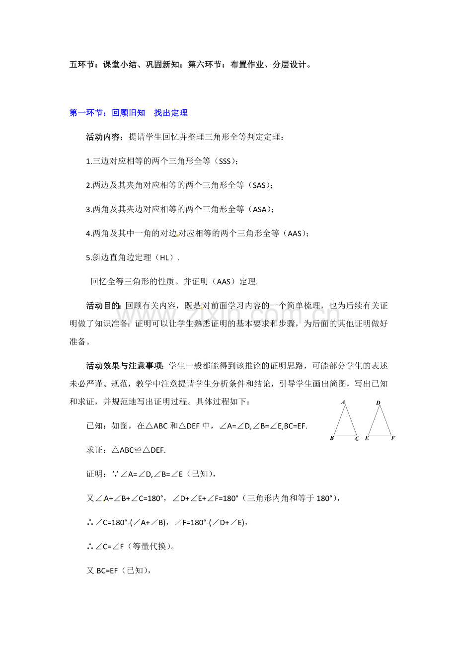 在《相交线平行线》的学习中,学生已经感受了证明的必要性,并通过有关命题的证明过程,了解了一些基本的证明方法和基本规范,在有关三角形全等的学习中积累了一定的证明经验;这些都为证明本节有关命题做了很好的铺垫。