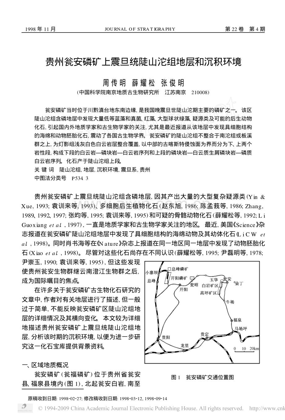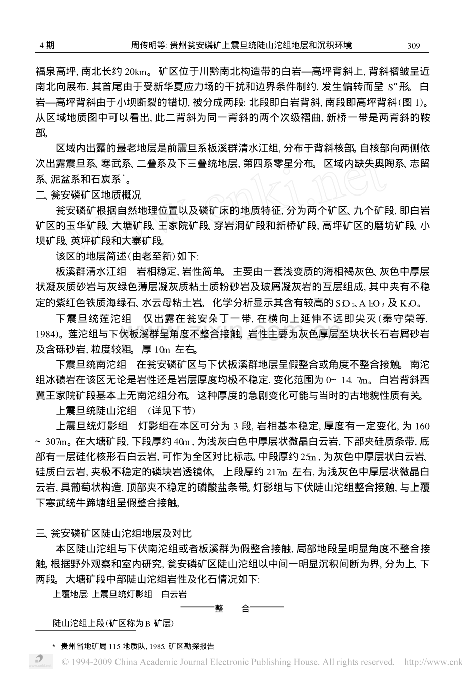 地层学杂志1998年11月JOURNAL OF STRAT IGRAPHY第22卷第4期贵州瓮安磷矿上震旦统陡山沱组地层和沉积环境周 传 明薛 耀 松张 俊 明(中国科学院南京地质古生物研究所江苏南京210008)瓮安磷矿当时位于川黔滇台地东南边缘,是我国晚震旦世陡山沱期主要的磷矿之一。该区陡山沱组含磷地层中发现大量低等蓝藻和真菌、红藻、大型球状绿藻、疑源类及可能的后生动物化石,引起国内外地质学家和古生物学家的关注,尤其是最近报道从该地层中发现具细胞结构的海绵和动物胚胎化石,震动了各国古生物学界。瓮安磷矿的陡山沱组不整合于南沱组或板溪群之上,为灯影组浅灰白色白云岩层整合覆盖,以中部的古喀斯特侵蚀面为界而分为下、上两个岩性段,构成下段的白云岩磷块岩白云岩序列和上段的磷块岩白云质生屑磷块岩磷质白云岩序列。化石产于陡山沱组上段。关 键 词陡山沱组,地层,沉积环境,震旦系,贵州中图法分类号P534.3原稿收到日期:1998202227;修改稿收到日期:1998203212,1998209214贵州瓮安磷矿上震旦统陡山沱组含磷地层,因其产出大量的大型复杂疑源类(Yin&Xue,1993;袁训来等,1993)、多细胞后生植物化石(赵东旭,1986;陈孟莪等,1986;Zhang,1989、1992、1997;张昀等,1995;袁训来等,1995)和可疑的骨骼动物化石(薛耀松等,1992;L iGuoxianget al.,1997),一直是地质学家和古生物学家关注的地区。最近,美国 Science 杂志报道在瓮安磷矿陡山沱组地层中发现了具细胞结构的海绵动物及其幼体化石(L i C Wetal.,1998)。同时肖书海等在 N ature 杂志上报道在同一地区同一地层中发现了动物胚胎化石(Xiaoet al.,1998)。尽管对这些化石尚存在不同认识(薛耀松等,1995;尹磊明等,1978;图1瓮安磷矿交通位置图尹崇玉,1990;袁训来等,1995),但这些发现使贵州瓮安生物群继云南澄江生物群之后,成为国际瞩目的焦点。在许多关于瓮安磷矿古生物化石研究的文章中,作者对有关地层进行了描述,但一般过于简单,不能反映瓮安磷矿区陡山沱组地层的详细情况及其横向变化。本文较为详细地描述贵州瓮安磷矿上震旦统陡山沱组地层,分析该时期的沉积环境,以便为进一步研究这一化石宝库提供背景资料。一、区域地质概况瓮安磷矿(瓮福磷矿)位于贵州省瓮安县、福泉县境内(图1),北起瓮安白岩,南至福泉高坪,南北长约20km。矿区位于川黔南北构造带的白岩高坪背斜上,背斜褶皱呈近南北向展布,其首尾由于受新华夏应力场的干扰和边界条件制约,发生偏转而呈“S”形。白岩高坪背斜由于小坝断裂的错切,被分成两段:北段即白岩背斜,南段即高坪背斜(图1)。从区域地质图中可以看出,此二背斜为同一背斜的两个次级褶曲,新桥一带是两背斜的鞍部。区域内出露的最老地层是前震旦系板溪群清水江组,分布于背斜核部。自核部向两侧依次出露震旦系、寒武系、二叠系及下三叠统地层,第四系零星分布。区域内缺失奥陶系、志留系、泥盆系和石炭系3。3贵州省地矿局115地质队,1985.矿区勘探报告二、瓮安磷矿区地质概况瓮安磷矿根据自然地理位置以及磷矿床的地质特征,分为两个矿区、九个矿段,即白岩矿区的玉华矿段、大塘矿段、王家院矿段、穿岩洞矿段和新桥矿段,高坪矿区的磨坊矿段、小坝矿段、英坪矿段和大寨矿段。该区的地层简述(由老至新)如下:板溪群清水江组岩相稳定,岩性简单。主要由一套浅变质的海相褐灰色、灰色中厚层状凝灰质砂岩与灰绿色薄层凝灰质粘土质粉砂岩及玻屑凝灰岩的互层组成,其中夹有不稳定的紫红色铁质海绿石、水云母粘土岩。化学分析显示其含有较高的SiO2、A l2O3及K2O。下震旦统莲沱组仅出露在瓮安朵丁一带,在横向上延伸不远即尖灭(秦守荣等,1984)。莲沱组与下伏板溪群呈角度不整合接触。岩性主要为灰色厚层至块状长石岩屑砂岩及含砾砂岩,粒度较粗。厚10m左右。下震旦统南沱组在瓮安磷矿区与下伏板溪群地层呈假整合或角度不整合接触。南沱组冰碛岩在该区无论是岩性还是岩层厚度均极不稳定,变化范围为014.7m。白岩背斜西翼王家院矿段基本上无南沱组分布。这种厚度的急剧变化可能与当时的古地貌性质有关。上震旦统陡山沱组(详见下节)上震旦统灯影组灯影组在本区可分为3段,岩相基本稳定,厚度有一定变化,为160307m。在大塘矿段,下段厚约40m,为浅灰白色中厚层状微晶白云岩,下部夹硅质条带,底部有一层硅化核形石白云岩,可作为全区对比标志。中段厚约25m,为灰色中厚层状白云岩、硅质白云岩,夹极不稳定的磷块岩透镜体。上段厚约217m左右,为浅灰色中厚层状微晶白云岩,具葡萄状构造,顶部夹不稳定的磷酸盐条带。灯影组与下伏陡山沱组整合接触,与上覆下寒武统牛蹄塘组呈假整合接触。三、瓮安磷矿区陡山沱组地层及对比本区陡山沱组与下伏南沱组或者板溪群为假整合接触,局部地段呈明显角度不整合接触。根据野外观察和室内研究,瓮安磷矿区陡山沱组以中间一明显沉积间断为界,分为上、下两段。大塘矿段中部陡山沱组岩性及化石情况如下:上覆地层:上震旦统灯影组白云岩整合陡山沱组上段(矿区称为B矿层)9034期周传明等:贵州瓮安磷矿上震旦统陡山沱组地层和沉积环境14.灰白色含磷质碎屑白云岩0.4m13.硅质团块白云岩,可见磷质小团块、条带或条纹。肖书海等(1998)报道的动物胚胎化石(?)主要产于该层位7.0m12.灰色薄层磷质白云岩,夹磷质条带或条纹,上部夹硅质团块或