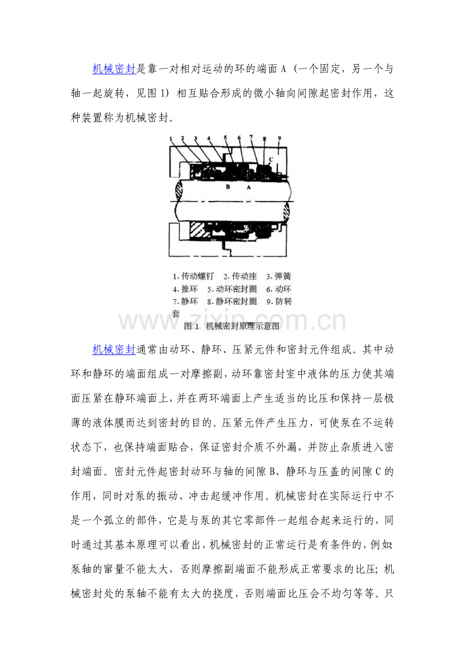 机械密封通常由动环、静环、压紧元件和密封元件组成。其中动环和静环的端面组成一对摩擦副,动环靠密封室中液体的压力使其端面压紧在静环端面上,并在两环端面上产生适当的比压和保持一层极薄的液体膜而达到密封的目的。压紧元件产生压力,可使泵在不运转状态下,也保持端面贴合,保证密封介质不外漏,并防止杂质进入密封端面。密封元件起密封动环与轴的间隙B、静环与压盖的间隙C的作用,同时对泵的振动、冲击起缓冲作用。机械密封在实际运行中不是一个孤立的部件,它是与泵的其它零部件一起组合起来运行的,同时通过其基本原理可以看出,机械密封的正常运行是有条件的,例如:泵轴的窜量不能太大,否则摩擦副端面不能形成正常要求的比压;机械密封处的泵轴不能有太大的挠度,否则端面比压会不均匀等等。只有满足类似这样的外部条件,再加上良好的机械密封自身性能,才能达到理想的密封效果。