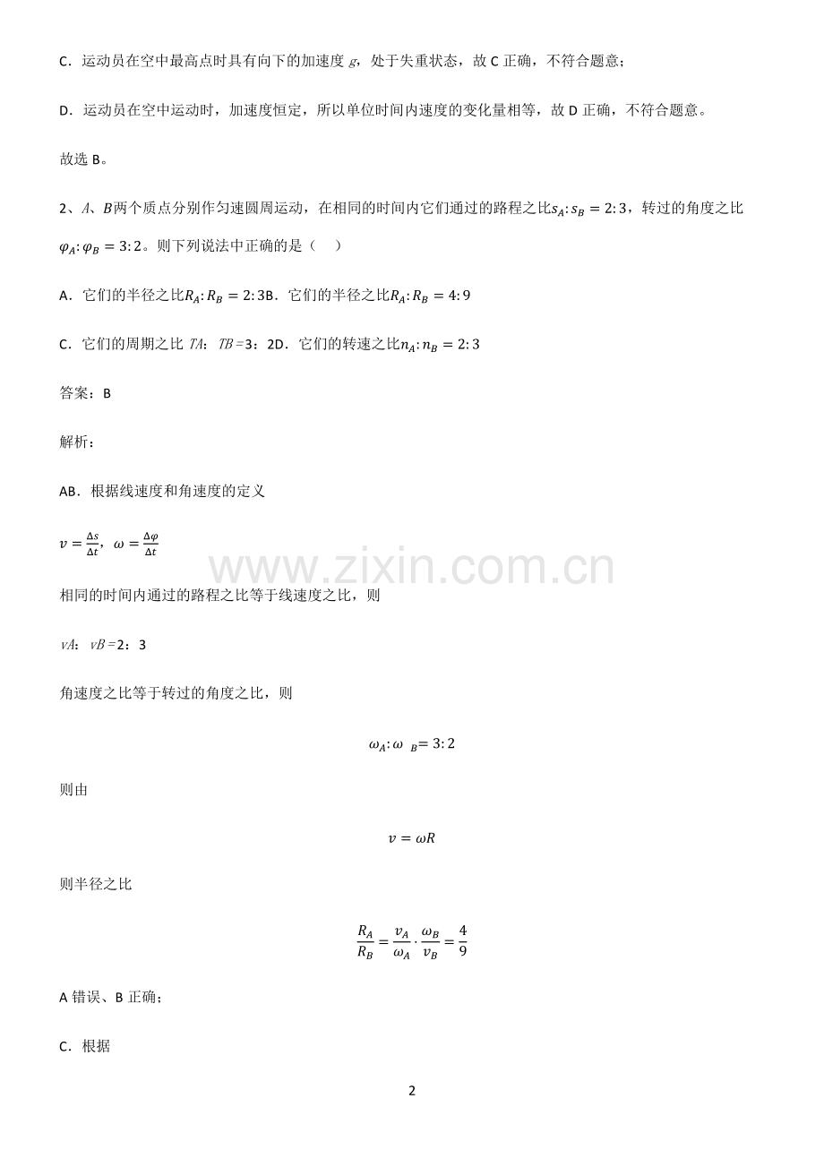 1 (每日一练每日一练)高中物理力学曲线运动基础知识点归纳总结高中物理力学曲线运动基础知识点归纳总结 单选题 1、现在城市的滑板运动非常流行,在水平地面上一名滑板运动员双脚站在滑板上以一定速度向前滑行,在横杆前起跳并越过杆,从而使人与滑板分别从杆的上方、下方通过,如图所示,假设人和滑板运动过程中受到的各种阻力忽略不计,若运动员顺利地完成了该动作,最终仍落在滑板原来的位置上,则下列说法错误的是()A运动员起跳时,双脚对滑板作用力的合力竖直向下 B起跳时双脚对滑板作用力的合力向下偏后 C运动员在空中最高点时处于失重状态 D运动员在空中运动时,单位时间内速度的变化相同 答案:B 解析:AB运动员竖直起跳,由于本身就有水平初速度,所以运动员既参与了水平方向上的匀速直线运动,又参与了竖直上抛运动。各分运动具有等时性,水平方向的分运动与滑板的运动情况一样,运动员最终落在滑板的原位置。所以水平方向受力为零,则起跳时,滑板对运动员的作用力竖直向上,运动员对滑板的作用力应该是竖直向下,故 A 正确,不符合题意;B 错误,符合题意;2 C运动员在空中最高点时具有向下的加速度g,处于失重状态,故 C 正确,不符合题意;D运动员在空中运动时,加速度恒定,所以单位时间内速度的变化量相等,故 D 正确,不符合题意。故选 B。2、A、两个质点分别作匀速圆周运动,在相同的时间内它们通过的路程之比:=2:3,转过的角度之比:=3:2。则下列说法中正确的是()A它们的半径之比:=2:3B它们的半径之比:=4:9 C它们的周期之比TA:TB=3:2D它们的转速之比:=2:3 答案:B 解析:AB根据线速度和角速度的定义 =,=相同的时间内通过的路程之比等于线速度之比,则 vA:vB=2:3 角速度之比等于转过的角度之比,则:=3:2 则由 =则半径之比=49 A 错误、B 正确;C根据 3 =2 则:=:=2:3 C 错误;D根据=2,则:=:=3:2 D 错误。故选 B。3、某小组利用频闪照相的方法研究单摆的运动过程,即用在同一张底片上多次曝光的方法,在远处从与单摆摆动平面垂直的视角拍摄单摆在摆动过程中的多个位置的照片。从摆球离开左侧最高点 A 时开始,每隔相同时间曝光一次,得到了一张记录摆球从 A 位置由静止运动到右侧最高点 B 的照片,如图所示,其中摆球运动到最低点 O 时摆线被一把刻度尺挡住。对照片进行分析可知()AA 和 B 位置等高,说明摆球在运动过程中机械能守恒 B摆球在 A 点的所受合力大小大于在 B 点的合力 C摆球经过 O 点前后瞬间加速度大小不变 D摆球经过 O 点前后瞬间角速度大小不变 答案:A 4 解析:AA 和 B 位置等高,机械能相等,说明摆球在运动过程中机械能守恒,故 A 正确;B摆球在 A 点的速度为零,向心力为零,即沿绳子方向的合力为零,摆球的合力等于重力沿圆弧切线方向的分力,由于在 A 点绳子偏离竖直方向的夹角小于在 B 点偏离竖直方向的夹角,可知,在 A 点重力沿圆弧切线方向的分力小于在 B 点重力沿圆弧切线方向的分力,故摆球在 A 点的所受合力大小小于在 B 点的合力,故 B 错误;C摆球经过 O 点前后瞬间速度大小不变,半径变化,根据 n=2 可知摆球经过 O 点前后瞬间加速度大小是变化的,故 C 错误;D根据 =可知,摆球经过 O 点前后瞬间角速度大小发生变化,故 D 错误。故选 A。4、三块相同的木块 A、B、C,自同一高度由静止开始下落,其中 B 在开始下落时被一个水平飞来的子弹击中并嵌人其中,木块 C 在下落一半高度时被水平飞来的一子弹击中并嵌人其中,若三个木块下落到地面的时间分别为A、B、C,则()AA=B=C BA=B C CA B C DA B=C 答案:B 解析:木块 A 做自由落体运动,木块 B 在刚要下落瞬间被子弹射中,并留在其中,木块 B 与子弹一起做平抛运动。竖5 直方向 A、B 均做自由落体运动,且下落高度相同,故二者下落时间相同,即 A=B 木块 C 落下一定距离后被同样的子弹水平射中,也留在其中,在子弹击中木块过程中,竖直方向动量守恒,根据动量守恒定律可知,由于子弹进入木块后总质量变大,所以木块竖直方向的速度变小,木块落地时间延长,木块 C 在空中的运动时间比 A、B 时间长,即 A=B C 则 AB 同时落地,C 最后落地。故选 B。5、为了提高一级方程式赛车的性能,在形状设计时要求赛车上下方空气存在一个压力差(即气动压力),从而增大赛车对地面的正压力,如图所示,一辆总质量为 600kg 的要车以 288km/h 的速率经过一个半径为 180m的水平弯道,转弯时赛车不发生侧滑,侧向附着系数(正压力与摩擦力的比值)=1,则赛车转弯时()A向心加速度大小约为460m/s2 B受到的摩擦力大小约为3 105N C受到的支持力大小约为 6000N D受到的气动压力约为重力的2.6倍 答案:D 解析:288km/h=80m/s,A.根据向心加速度公式 6 =2 36m/s2 故 A 项错误;B.因为摩擦力提供向心力,根据牛顿第二定律得:=2=21333N 故 B 错误;C.因为摩擦力 f=N=(Mg+F)则汽车所受支持力 =21333N 气动压力 F=N-Mg=15333N 所以=15333600 10=2.6 故 C 错误,D 正确