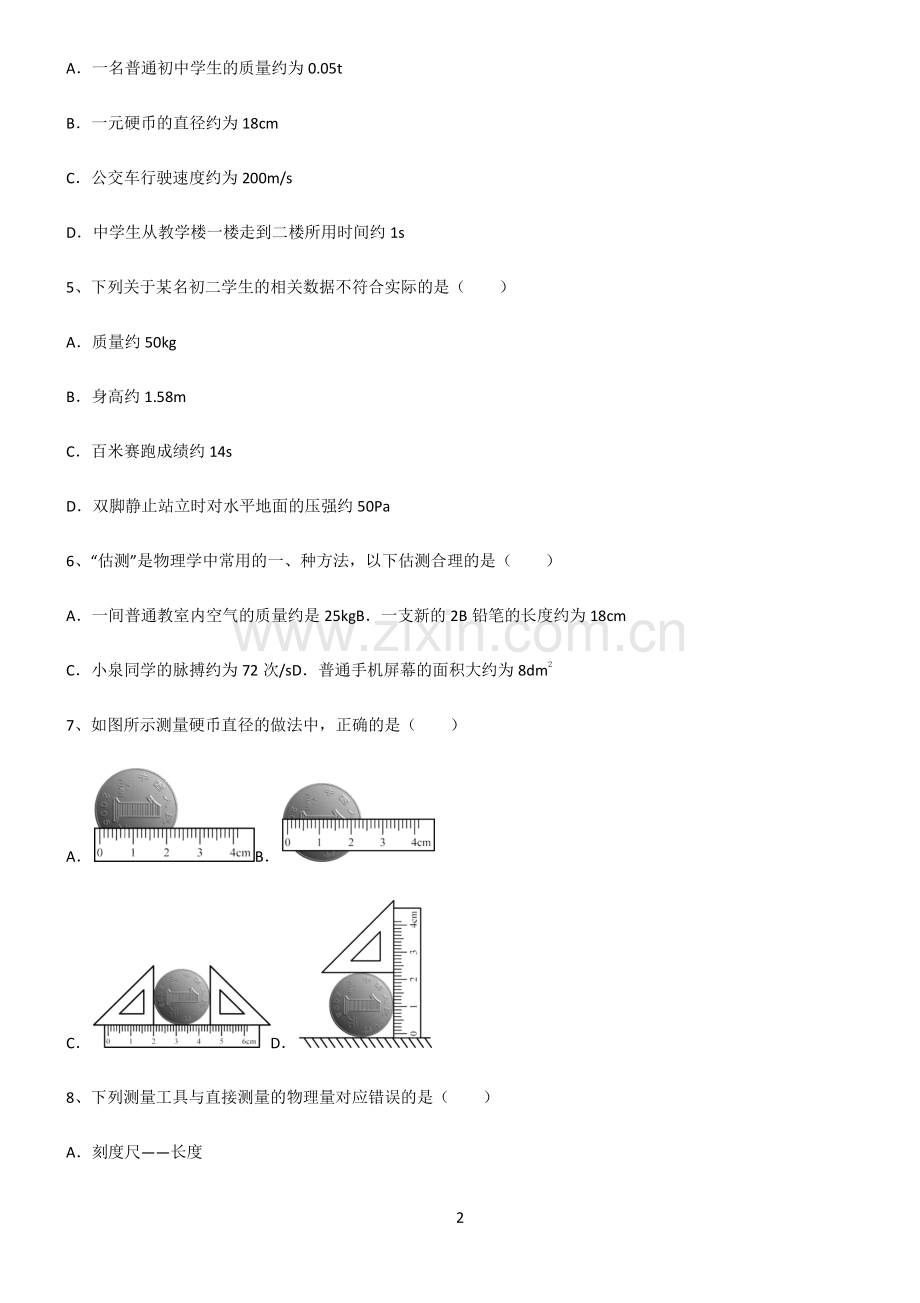 1 (每日一练每日一练)()(文末附答案文末附答案)人教版人教版 20222022 年初中物理长度与时间的测量笔记重点年初中物理长度与时间的测量笔记重点大全大全 单选题 1、如图所示是一些常用的物理测量仪器,其中使用方法正确的是()A用刻度尺测边长 B量筒(视线以液面凹面为准)C温度计 D天平 2、小红参观博物馆时看到了祝融号模型,发现祝融号和一个初三的女学生一样高,请问这个祝融号有多高()A0.9mB1.8mC3.6mD7.2m 3、下列估测最接近实际的是()A一本物理参考书的宽度约为 5cmB上课铃响一次持续的时间约 5min C一名中学生的重力约为 500ND中学生的步行速度约为 20m/s 4、下列估测数据中,最符合实际情况的是()2 A一名普通初中学生的质量约为 0.05t B一元硬币的直径约为 18cm C公交车行驶速度约为 200m/s D中学生从教学楼一楼走到二楼所用时间约 1s 5、下列关于某名初二学生的相关数据不符合实际的是()A质量约 50kg B身高约 1.58m C百米赛跑成绩约 14s D双脚静止站立时对水平地面的压强约 50Pa 6、“估测”是物理学中常用的一、种方法,以下估测合理的是()A一间普通教室内空气的质量约是 25kgB一支新的 2B 铅笔的长度约为 18cm C小泉同学的脉搏约为 72 次/sD普通手机屏幕的面积大约为 8dm2 7、如图所示测量硬币直径的做法中,正确的是()AB CD 8、下列测量工具与直接测量的物理量对应错误的是()A刻度尺长度 3 B托盘天平质量 C量筒密度 D弹簧测力计力 9、如图所示,工作人员手托的是“越王勾践剑”。这把剑历经两千多年,出土时仍锋利无比,剑身丝毫不见锈斑,令世人对古人的铸造技术惊叹不已。根据图片信息,对这把剑的长度估测合理的是()A0.5mB1.5mC2mD2.5m 10、科学家经常用估算的方法来获得事物的有关信息。估算不是胡乱猜测,它的结果是根据已知的信息进行合理推测得到的,下面是小明的一些估算值,你认为符合实际的是()A一张纸的厚度约为 1 mmB一个成年人正常步行时的速度约为 5 m/s C一个初中生所受重力约为 500 ND一个鸡蛋的质量约为 0.5 kg 多选题 11、学习质量和密度的知识后,小明同学想用天平、量筒和水完成下列实践课题,你认为能够完成的是()A测量牛奶的密度 B测定一捆铜导线的长度 C测量小铜球的密度 D测定一大堆大头针的数目 12、下列关于误差的说法中,正确的有()A认真细致地测量可以避免错误 B选用更精密的测量仪器可以避免误差 C改进测量方法有助于避免误差 D测量中的错误是可以避免的,误差不可避免 4 13、下列数据符合实际的是()A某中学生跑 1000m 用时 4s B汽车经过学校门口时限速 30km/h C人正常步行的速度约为 1.2m/s D自行车正常骑行速度约 30m/s 14、下列有关估测的数据,与实际基本相符的是()A某一中学生的身高约为 165cmB对人体的安全电压不高于 36V C人体感觉舒适的温度约为 25D一次性医用口罩的质量约为 5kg 15、下面是与某个初中生相关的一组数据,其中基本符合实际的是()A身高:165cmB体温:37 C密度:1 g/cm3D重力:65 N 综合题 16、近年,新型冠状病毒疫情来势凶凶,迅速发展成为全球公共卫生事件。我们国家在优势政治制度的引领下,全国上下采取迅速有效的指施,使国内的疫情较短时间内得到缓解,医学专家们已经初步认识到这种新型冠状病毒特点。(1)新型冠状病毒大小约 100nm=_m。飞沫是新冠状病毒的主要传播途径,人们在打喷嚏时如果没有阻拦,则有上万个飞沫以 50m/s=_km/h(相当于超级台风)的速度飞出。所以为了自己和他人的安全请佩戴口罩。(2)如果不幸确诊,病人就通过负压救护车送至负压隔离病房,负压病房内气压_(选填“低于”“高于”或“等于”)病房外大气压,这样空气在自由流动时只能由_流向_(均选填“室内”或“室外”),减少疾病传播和交叉感染的风险。(3)体温检测是必要的防控措施,如图所示为水银体温计的横截面。凸起圆弧形玻璃可以看清体温计内极细5 的汞柱,便于读数。这是因为凸起圆弧形玻璃的作用相当于_镜,能看到汞柱被放大后正立放大的_像。17、(1)如图中体温计的读数是_;如图中秒表的读数是_s。(2)小薇同学制作了如图所示的探头进行了液体压强的探究。紧密蒙在探头下端的橡皮膜,形变程度越大,说明它所受的液体压强越_;实验时的情形如图所示,比较_图和_图,可以初步得出结论:在同种液体中,液体内部压强随深度的增加而增大;比较甲图和丙图,可以初步得出结论:液体内部压强与_有关;6 18、我们学到的物理知识与我们的日常生活密切相关。请你根据下面所提供的有关信息解决问题:(1)刻度尺是我们常用的测量工具,如下图,用刻度尺测量某物体的长度应为_cm,小明用同一把刻度尺几次测出水笔的长度分别是 15.81cm、15.80cm、15.28cm、15.79cm、15.82cm。上面测量数据中有一个明显错误的是_cm,这支水笔的长度应记为_cm。(2)在综合实践活动中,老师让同学们就汽车运行距离和耗油量及花费的相关情况做个调查,小明让爸爸开车去新华书店买书,回来后小明做了记录,内容如下表所示,请你根据记录的内容计算:小明去新华书店单程时间 30min,则小明家距新华书店的路程大约多少 km()?往返途中,用掉汽油多少()mL?此次行程需花费汽油费多少元()?平均车速 30km/h 等速耗油 9L/100km 油价 7.10 元/升 7 人教版 2022 年初中物理长度与时间的测量_016 参考答案 1、答案:B 解析:A测物体长度时,刻度尺没有放正,故 A 错误;B用量筒读数时,视线要和凹液面底端相