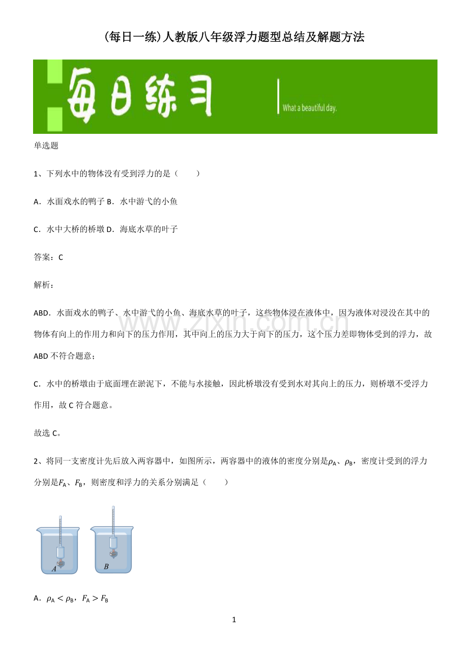 1 (每日一练每日一练)人教版八年级浮力题型总结及解题方法人教版八年级浮力题型总结及解题方法 单选题 1、下列水中的物体没有受到浮力的是()A水面戏水的鸭子 B水中游弋的小鱼 C水中大桥的桥墩 D海底水草的叶子 答案:C 解析:ABD水面戏水的鸭子、水中游弋的小鱼、海底水草的叶子,这些物体浸在液体中,因为液体对浸没在其中的物体有向上的作用力和向下的压力作用,其中向上的压力大于向下的压力,这个压力差即物体受到的浮力,故ABD 不符合题意;C水中的桥墩由于底面埋在淤泥下,不能与水接触,因此桥墩没有受到水对其向上的压力,则桥墩不受浮力作用,故 C 符合题意。故选 C。2、将同一支密度计先后放入两容器中,如图所示,两容器中的液体的密度分别是A、B,密度计受到的浮力分别是A、B,则密度和浮力的关系分别满足()AA B 2 BA B DA B,A=B 答案:B 解析:由图示知密度计放入 A、B 两种液体中都是漂浮,所以密度计在两种液体中所受的浮力都等于自身的重力,密度计在两种液体中所受的浮力相等,即FA=FB。密度计在 A 液体中排开液体的体积大于在 B 中排开液体的体积,据F浮=gV排知,A 液体的密度小于 B 液体的密度,即 AB。故 ACD 不符合题意,B 符合题意。故选 B。3、在学习浮力时,张老师利用一杯水和一只空牙膏袋,给同学们做了一个简单的实验,极大的提高了同学们网络学习物理的热情。他取一只空牙膏袋,第一次把它挤瘪,第二次将它撑开,两次都拧紧盖后先后放入同一水杯甲中,如图所示。下列说法中正确的是()A两次牙膏袋的质量相等,体积相等,因此两次牙膏袋的密度 甲乙 B甲图中浸没,乙图中只有部分浸入,因此两次排开水的体积V甲V乙 C甲图中浮力小于重力,乙图中浮力等于重力,因此两次所受的浮力F甲F乙 D甲、乙两图浸入体积相等,因此两次杯底受到水的压强p甲p乙 答案:C 解析:A牙膏袋的形状发生变化,但物质多少没有变化,所以质量不变,即m甲m乙,根据图示可知,V甲V乙,由3 =可得,两次牙膏袋的密度关系 甲乙,故 A 错误;BCD甲下沉,F浮G,乙漂浮,F浮G,所以两次所受的浮力关系F甲F乙,由F浮水gV排可得,两次排开水的体积关系V甲V乙,因为原来水一样多,所以放入甲乙后h甲h乙,由p水gh得,p甲p乙,故 BD 错误,C 正确。故选 C。4、龙卷风 容易把地面上的物体卷入空中的原因是()A龙卷风增大了物体受到的浮力 B龙卷风减小了物体受到的重力 C传说中的“龙”把物体抓向空中 D龙卷风的内部压强小于外部压强 答案:D 解析:A根据=排,空气密度不变,物体排开空气的体积不变,浮力不变不符合题意 B龙卷风出现时,物体的质量不变,根据=,重力不变不符合题意 C“龙”把物体抓向空中有迷信色彩不符合题意 D龙卷风是空气急速流动形成的,内部空气流动速度很大,压强很小外部压强大,物体在压强差作用下,产生一个向龙卷风的压力,被吸走符合题意 5、如图所示,小聪用一个长方体铝块探究影响浮力大小的因素。他先后将该铝块平放、侧放和竖放,使其部分浸入同一杯水中,保证每次水面到达同一标记处,比较弹簧测力计示数大小。该实验探究的是下列哪个因素对浮力大小的影响()4 A液体的密度 B物体的密度 C物体排开液体的体积 D物体浸入液体的深度 答案:D 解析:先后将该长方体铝块平放、侧放和竖放,使其部分浸入同一杯水中,液体的密度相同,每次水面到达同一标记处,说明物体排开水的体积相同,物体进入水的深度不同,比较弹簧测力计示数大小,可以探究浮力与物体浸入液体的深度的关系,故 D 符合题意,ABC 不符合题意。故选 D。6、体积相同的甲、乙两个实心球,同时轻轻放入盛水的烧杯中,最终甲球悬浮在水中,乙球下沉入水底,则下列说法中正确的是()A甲球受到的浮力小于重力 B乙球不受浮力 C甲球受到的浮力小于乙球受到的浮力 D甲球受到的浮力大于乙球受到的浮力 答案:C 解析:由平衡条件知道,甲球悬浮在水中,乙球沉入水底,所以甲受到的浮力等于甲的重力,乙受到的浮力小于乙的物体的重力,故 AB 错误;由于物体甲、乙的体积相同,因为最终甲球悬浮在水中,乙球下沉入水底,所以排开的液体体积是V甲排 1,2竖直向上,F1竖直向下,F1与F2的合力方向竖直向上,故 B 错误;C物体受到了重力、上表面的压力和下表面的压力,在这三个力的作用下处于平衡状态,F1与F2的合力大小等于物体受到的重力的大小,合力F与重力G的方向相反,故 C 正确;D物体 M 侧面受到水的作用力的合力大小等于零,上下表面受到水的合力就是物体受到的浮力,大小不为零,故 D 错误。故选 C。8、放在水平桌面上的甲、乙两个相同的容器中盛有同种液体,体积相等的a、b两个物体在液体中静止时,两液面相平,如图所示,则()6 A物体a的密度大 B物体b受到的浮力小 C甲容器底部受到的压力小 D两容器对桌面的压强一样大 答案:D 解析:Aa物体处于漂浮状态,受到的浮力等于自身重力,即 浮a=a 则 液排a=aa 物体a漂浮,排aa,故液a;b物体处于悬浮状态,受到的浮力等于自身重力,即 浮b=b 则 液排b=bb 物体b漂浮,排b=b,故液=b,所以ab,故 A 错误;B两物体所受浮力浮=液排,两容器中液体密度相同,a排开的液体体积较小,故a受到的浮力较小,故 B错误;7 C容器的受到的压强=,两容器中盛同种液体,液体密度相同,两容器底所处深度也相同,故两容器底所受压强相同。容器底所受压力=,两容器底面积相同,容器底所受压强相同,故两容器底所受压力相同,故 C 错误;D两容