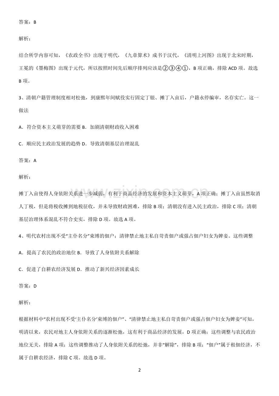 1 通用版带答案高中历史上第四单元明清中国版图的奠定与面临的挑战重点知识通用版带答案高中历史上第四单元明清中国版图的奠定与面临的挑战重点知识归纳归纳 单选题 1、明代,若遇四品以上大臣缺员,必由六部官员、都御史、通政使、大理寺卿等共相计议,而后推荐,再经皇帝批准任用,称“廷推”。大臣们若未经廷推而是由皇帝特旨简拔的话,则深以为耻。据此可知,廷推制度 A有利于理性构建政治领导层 B标志着皇权专制达到了顶峰 C成为皇权与相权斗争的工具 D致使科举的选官功能被削弱 答案:A 解析:廷推而来的高级官员意味着得到了官僚体系的认可,这种制度较为理性,有助于构建政治领导层,A 项正确;廷推制度与加强专制无关,排除 B 项;明代废除了宰相,排除 C 项;廷推是在现有官员体系中推选,和科举制无关,排除 D 项。故选 A 项。2、时空观念是历史学科诸素养中学科本质的体现。以下图片中的历史资料,按时间先后排列正确的是()ABCD 2 答案:B 解析:结合所学内容可知,农政全书出现于明代,九章算术成书于汉代,清明上河图出现于北宋时期,王冕的墨梅图出现于元代,所以按照时间先后顺序排列应该是,B 项正确,排除 ACD 项。故选B 项。3、清朝户籍管理制度相对松弛,到康熙年间赋役实行固定丁银、摊丁入亩后,户籍永停编审,名存实亡。这一做法 A符合资本主义萌芽的需要 B加剧清朝财政收入困难 C顺应民主政治发展的趋势 D导致清朝基层治理混乱 答案:A 解析:摊丁入亩使得人身依附关系进一步减弱,有利于商品经济的发展和资本主义萌芽,A 项正确;摊丁入亩虽然取消人丁税,但是将税收摊到地税征收,并未导致财政困难,排除 B 项;清朝没有进入民主政治,排除 C 项;清朝基层治理体系混乱不符合史实,排除 D 项。故选 A 项。4、明代农村出现不受“主仆名分”束缚的佃户;清律禁止地主私自苛责佃户或强占佃户妇女为婢妾。这些调整 A提高了农民的政治地位 B导致了人身依附关系解除 C促进了自耕农经济发展 D推动了新兴经济因素成长 答案:D 解析:根据材料中“农村出现不受主仆名分束缚的佃户”、“清律禁止地主私自苛责佃户或强占佃户妇女为婢妾”可知,明清以来,农民对地主人身依附关系的逐渐松弛,这有利于商品经济的发展,D 项正确;这些调整与农民政治地位无关,排除 A 项;这些调整推动了人身依附关系的松弛,并非“解除”,排除 B 项;“佃户”属于租佃经济,不属于自耕农经济,排除 C 项。故选 D 项。3 5、清朝皇帝为加强对西藏地区管辖而采取的措施是 A设置西域都护 B文成公主入藏 C设置驻藏大臣 D设置伊犁将军 答案:C 解析:结合所学可知,清朝在中央设立理藩院,加强对少数民族地区的管理,西藏与新疆地区民族事务归属该机构管理;顺治皇帝对五世达赖喇嘛册封,康熙皇帝对班禅大师进行册封;雍正帝设立驻藏大臣,与达赖、班禅大师共同管理西藏。C 项正确;西域都护府的设立,标志着西域正式纳入汉朝的版图,排除 A 项;文成公主入藏发生在唐朝,排除 B项;伊犁将军,全称为总统伊犁等处将军,是清朝乾隆帝平定准部和回部之后设立的新疆地区名义上的最高军政长官,排除 D 项。故选 C 项。6、1776 年乾隆皇帝在大力表彰忠臣(即在明末清初因抗清遇难的明朝官员)的同时,将明朝降清之臣祖大寿、洪承畴等编入官修史书贰臣传,之后又将“降而复叛”的吴三桂等编入逆臣传。这表明清朝()A扩大政权的统治基础 B彰显封建的正统道德 C缓和满汉的民族矛盾 D重视前朝的史书修撰 答案:B 解析:依据题干和所学知识,可知乾隆皇帝大力表彰忠臣(在明末清初因为抗清而遇难的明朝官员),对于明朝降清之臣则列为叛徒,将“降而复叛”的吴三桂等列为逆臣,可见清朝旨在宣扬“忠君”的思想,也就是彰显封建的正统道德,B 项正确;题干反映出乾隆皇帝对明清官员的重新评价旨在强调“忠君”的伦理道德观念,并没有体现扩大政权的统治基础,扩大政治统治基础应该是指科举制这一选官制度的作用,排除 A 项;题干没有体现清朝旨在缓和满汉的民族矛盾,而是彰显“忠君”的正统道德,排除 C 项;重视前朝的史书修撰不是材料的主体,材料的主旨是乾隆皇帝通过对明清官员的重新评价来彰显封建正统道德,排除 D 项。故选 B 项。7、明末清初,某思想家反对重农抑商观念,提出“工商皆本”。这位思想家是 A李贽 B顾炎武 C黄宗羲 D王守仁 4 答案:C 解析:结合所学内容可知,工商皆本是黄宗羲提出的主张,与李贽、顾炎武和王守仁不符,C 项正确,排除 ABD 项。故选 C 项。8、明万历年间松江府富豪潘允端的日记显示,从粮食种植、水利兴修、花木栽培、蔬菜培育到购买农具,出售产品、发放工资等各种农庄生产、管理事务,他都全部参与。这反映了当时 A自然经济逐渐解体 B生态农业已具规模 C农业经营方式革新 D租佃关系较为成熟 答案:C 解析:根据材料“潘允端亲自参与管理和发放工资,”可分析出可见主要是雇佣关系,C 项正确;自然经济解体是近代开始,排除 A 项;农业的多种经营方式结合并不等于生态农业,材料并未体现对生态的重视,排除 B 项;材料所述潘允端亲自参与管理和发放工资,可见主要是雇佣关系,而不是租佃关系,排除 D 项。故选 C 项。9、顾炎武认为,陆王心学是内向的禅学。他指出:“孔门未有专用心于内之说也。用心于内,近世禅学之说耳。今传于世者,皆外人