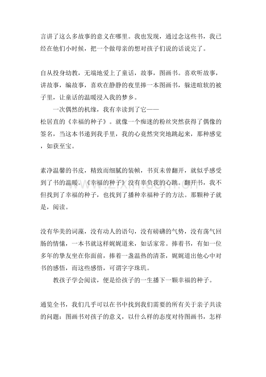 《幸福的种子》是一本让我和孩子都受益匪浅的图书。它通过让家长和孩子共读图画书来架起亲子之间沟通的桥梁。让我们懂得了如何去和孩子沟通,带着着孩子去感受这个世界上的爱与快乐。