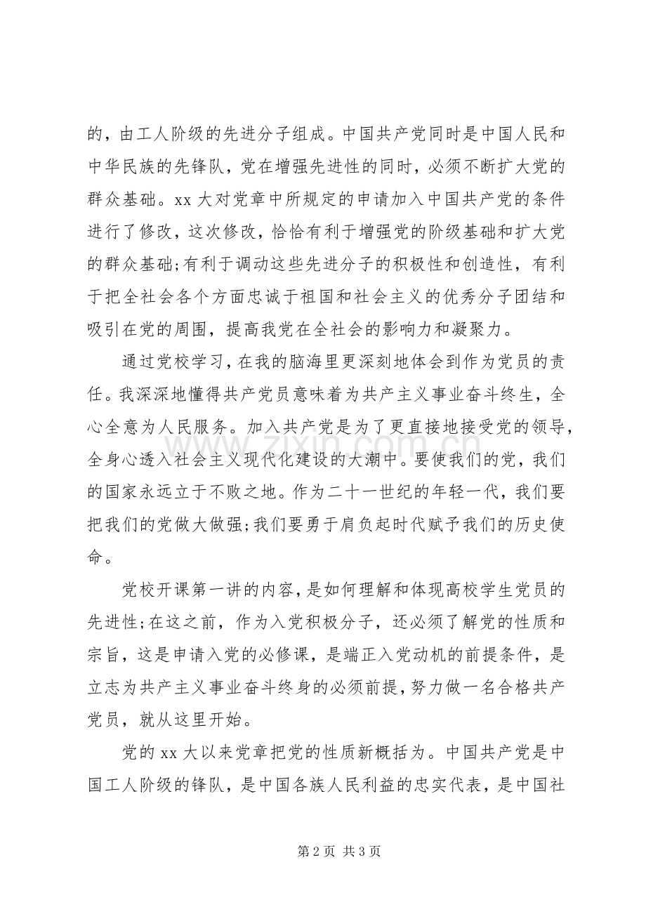 通过党校学习,在我的脑海里更深刻地体会到作为党员的责任。我深深地懂得共产党员意味着为共产主义事业奋斗终生,全心全意为人民服务。加入共产党是为了更直接地接受党的领导,全身心透入社会主义现代化建设的大潮中。要使我们的党,我们的国家永远立于不败之地。作为二十一世纪的年轻一代,我们要把我们的党做大做强;我们要勇于肩负起时代赋予我们的历史使命。